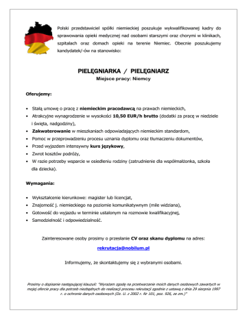 Polski przedstawiciel spółki niemieckiej poszukuje wykwalifikowanej kadry do sprawowania opieki medycznej nad osobami starszymi oraz chorymi w klinikach, szpitalach oraz domach opieki na terenie Niemiec. Obecnie poszukujemy kandydatek/-ów na stanowisko: PIELĘGNIARKA / PIELĘGNIARZ Miejsce pracy: Niemcy Oferujemy: • Stałą umowę o pracę z niemieckim pracodawcą na prawach niemieckich, • Atrakcyjne wynagrodzenie w wysokości 10,50 EUR/h brutto (dodatki za pracę w niedziele i święta, nadgodziny), • Zakwaterowanie w mieszkaniach odpowiadających niemieckim standardom, • Pomoc w przeprowadzeniu procesu uznania dyplomu oraz tłumaczeniu dokumentów, • Przed wyjazdem intensywny kurs językowy, • Zwrot kosztów podróży, • W razie potrzeby wsparcie w osiedleniu rodziny (zatrudnienie dla współmałżonka, szkoła dla dziecka). Wymagania: • Wykształcenie kierunkowe: magister lub licencjat, • Znajomość j. niemieckiego na poziomie komunikatywnym (mile widziana), • Gotowość do wyjazdu w terminie ustalonym na rozmowie kwalifikacyjnej, • Samodzielność i odpowiedzialność. Zainteresowane osoby prosimy o przesłanie CV oraz skanu dyplomu na adres: [email protected] Informujemy, że skontaktujemy się z wybranymi osobami. Prosimy o dopisanie następującej klauzuli: "Wyrażam zgodę na przetwarzanie moich danych osobowych zawartych w mojej ofercie pracy dla potrzeb niezbędnych do realizacji procesu rekrutacji zgodnie z ustawą z dnia 29 sierpnia 1997 r. o ochronie danych osobowych (Dz. U. z 2002 r. Nr 101, poz. 926, ze zm.)"