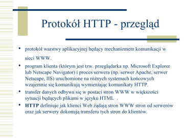 Protokół HTTP - przegląd protokół warstwy aplikacyjnej będący mechanizmem komunikacji w sieci WWW. program klienta (którym jest tzw. przeglądarka np. Microsoft Explorer lub Netscape Navigator) i proces serwera (np. serwer Apache, serwer Netscape, IIS) uruchomione na różnych systemach końcowych wzajemnie się komunikują wymieniając komunikaty HTTP. transfer danych odbywa się w postaci stron WWW w większości sytuacji będących plikami w języku HTML . HTTP definiuje jak klienci Web żądają stron WWW stron od serwerów oraz jak serwery dokonują transferu tych stron do klientów. Protokół HTTP Odwołanie się klienta do zasobu odbywa się przez podanie tzw. URL (Uniform Resource Locator), który identyfikuje żądany zasób. URL składa się ze schematu definiującego protokół używany w żądaniu oraz położenia tego zasobu wyrażonego poprzez nazwę (lub adres IP) komputera, na którym znajduje się ten zasób i port na którym proces reprezentujący dany protokół nadsłuchuje na serwerze. Ponadto mamy ścieżkę identyfikująca położenie zasobu w systemie plikowym. Opcjonalnie URL może zawierać parametry. http://www.firma.com:8080/katalog1/katalog2/plik schemat nazwa hosta port ścieżka do pliku Protokół HTTP Trwałe i nietrwałe połączenia HTTP może używać zarówno nietrwałych (non-persistent) jak i trwałych (persistent) polączeń. „Non-persistent” połączenia są domyślne dla HTTP/1.0 (HTTP w wersji 1.0). „Persistent” połączenia są domyślnym ustawieniem dla HTTP/1.1. Połączenia „non-persistent” Działają według następującego schematu: 2. Klient HTTP inicjuje połączenie TCP do serwera np. www.firma.com. 3. Klient HTTP wysyła „HTTP request message” w ramach tego połączenia. Żądanie zawiera cały URL lub tylko ścieżkę wskazującą na żądany plik /katalog1/katalog2/plik.html 4. Serwer HTTP odbiera żądanie i pobiera wskazany obiekt /katalog1/katalog2/plik.html z systemu składowania danych (RAM lub dysk), umieszcza obiekt w „HTTP response message”, którą wysyła poprzez połączenie TCP. Połączenia „non-persistent” 4. 5. 6. Serwer HTTP wysyła pakiet żądający zamknięcia sesji TCP. (TCP nie przerywa jednak połączenia dopóki klient nie otrzyma komunikatu.) Klient HTTP odbiera odpowiedź. Połączenie TCP zostaje zamknięte. Klient wydobywa plik z komunikatu odpowiedzi, parsuje plik HTML i wyszukuje odwołania do innych obiektów. Pierwsze cztery kroki są powtarzane dla każdego obiektu umieszczonego na stronie. Połączenia „non-persistent” Połączenia „non-persistent” nowe połączenie musi być ustanowione i utrzymywane dla każdego żądanego obiektu (np. elementu strony) każdy obiekt powoduje dwa RTTs -- jedno RTT dla ustanowienia połączenia TCP i jedno dla żądania i otrzymania obiektu każdy obiekt wywołuje powolną procedurę startu połączenia TCP Połączenia „persistent” przy trwałych połączeniach, serwer utrzymuje sesję TCP otwartą po wysłaniu odpowiedzi. Kolejne żądania i odpowiedzi pomiędzy tym samym klientem i serwerem mogą być wysyłane w ramach tej sesji cała strona WWW może być wysłana w ramache jednej sesji TCP, nawet wiele stron znajdujących się na tym samym serwerze może być przesłanych w ciągu takiej sesji. serwer HTTP zamyka połączenie kiedy nie pojawiają się żadne odwołania przez pewien czas (timeout), zwykle konfigurowalny.. Połączenia „persistent” bez użycia „pipelining”-u klient wysyła nowe żądanie gdy poprzednie zostało zrealizowane w tym przypadku występuje jedno RTT dla wysłania żądania i otrzymania obiektu. Chociaż daje to oszczędności w stosunku do dwóch RTT dla połączeń typu „non-persistent” nie jest to optymalne rozwiązanie po wysłaniu obiektu przez serwer nie robi on nic oczekując na kolejne żądanie. Połączenia „persistent” Połączenia „persistent” z użyciem „pipelining”-u Klient HTTP może wykonać wiele żądań „backto-back” dla obiektów. kiedy serwer otrzymuje żądania może wysłać dane obiekty „back-to-back”. Jeżeli wszystkie żądania są wysłane „back-to-back” i wszystkie odpowiedzi są wysłane „back-to-back” wtedy tylko jedno RTT potrzebne dla wszystkich obiektów. Połączenia „persistent” Komunikaty HTTP Komunikaty HTTP są podstawową formą komunikacji pomiędzy klientem i serwerem. Wyróżniamy dwa typy komunikatów: komunikaty żądania komunikaty odpowiedzi Komunikaty te służą do transferu danych i zasobów (zwanych jednostkami) między klientem i serwerem. HTTP - komunikat żądania Program klienta wysyła komunikat żądania w celu uzgodnienia parametrów komunikacyjnych oraz aby rozpocząć transfer i przetwarzanie zasobu. Komunikat zasobu może zawierać różne metody-działania, o które klient pyta czy mogą być wykonane na serwerze lub zastosowane do jednostki zasobu. Najczęstsze metody to: OPTIONS - żąda informacji związanych z możliwościami serwera lub rodzajem akcji możliwych do wykonania na zasobie. GET - żądanie wydobywa określone informacje. HEAD - identycznie jak GET, tylko serwer w odpowiedzi nie pozwala na przesłanie zasobu, a tylko informacji o nim POST - klient stosuje tę metodę wcelu wysłania bloku danych do serwera np. dostarczenie danych do skryptu metody PUT i DELETE - pozwalają zażądać odpowiednio wysłania lub usunięcia pliku na serwerze. HTTP Request Message HTTP - komunikat żądania Przykładowy HTTP Request Message GET /somedir/page.html HTTP/1.1 Connection: close User-agent: Mozilla/4.0 Accept: text/html, image/gif, image/jpeg Accept-language:fr HTTP - komunikat odpowiedzi Po odebraniu przez serwer komunikatu żądania od klienta, serwer ocenia metodę żądania i w rezultacie może wykonać określone działanie na żądanym zasobie, a następnie odpowiada klientowi komunikatem odpowiedzi. Odpowiedź zawiera kod zawierający informacje o tym czy żądanie zostało zre