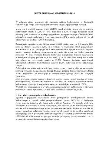 SEKTOR BUDOWLANY W PORTUGALII - 2014 W dalszym ciągu utrzymuje się stagnacja sektora budownictwa w Portugalii, aczkolwiek jej tempo jest bardziej umiarkowane aniżeli w poprzednich okresach. Inwestycje i wartość dodana brutto (WDB) nadal spadają. Inwestycje w sektorze budowlanym spadły o 7,1% w I kw. 2014 roku i 3,5% w ciągu kolejnych trzech miesięcy, jeśli porównać do analogicznego okresu roku poprzedniego. Obniżenie WDB sektora było mniej gwałtowne w II kw. tego roku, tj. 4,2% w ujęciu realnym, po tym jak odnotowano jej spadek o 7,0% w I kwartale. Zatrudnienie zmniejszyło się. Sektor stracił 24400 miejsc pracy w II kwartale 2014 roku, co stanowi spadek o 8,4% r/r i redukcję w wysokości 13900 pracowników w stosunku do I kw. bieżącego roku. Odnotowano także spadek wartości kredytów, niestety wartość kredytów zagrożonych utrzymuje się wciąż na bardzo wysokim poziomie. W lipcu wielkość kredytu bankowego udzielonego firmom budowlanym w Portugalii osiągnął poziom 16,3 mld euro, tj. o 2,4 mld euro mniej niż w roku poprzednim, co reprezentuje spadek o 13,2%. Wartość kredytów zagrożonych udzielonych sektorowi budowlanemu stanowi 20,2% całkowitej kwoty udzielonego kredytu. Z drugiej strony, sektor daje również pozytywne sygnały, które wydają się zapowiadać poprawę sytuacji i mogą oznaczać koniec długiego procesu dostosowawczego sektora. Warto wspomnieć, że inwestycje w budownictwie spadają przez 48 kolejnych kwartałów. Jako korzystną oznakę poprawy kondycji sektora można uznać pozytywne opinie przedsiębiorców. Poziom ich zaufania w stosunku do wzrostu aktywności sektora budownictwa rejestruje skumulowany roczny wzrost do lipca w wysokości 50%. Wartość prac rozpoczętych w wyniku ogłoszenia przetargów publicznych w pierwszej połowie 2014 roku wyniosła 935,4 mln euro, co oznacza wzrost o 38,6% r/r. 1. Optymistyczne nastroje przedsiębiorców Zgodnie z poglądami wyrażonymi przez portugalskich przedsiębiorców sektora budowlanego w ramach badań przeprowadzonych przez FEPICOP – Federação Portuguesa da Indústria da Construção e Obras Públicas (Portugalska Federacja Przemysłu Budownictwa i Robót Publicznych), ich zaufanie co do wzrostu aktywności sektora budowlanego utrzymuje się na pozytywnym poziomie. Wpływ na ten fakt ma przede wszystkim połączenie bardzo pozytywnych opinii co do portfela zamówień znajdującego się w posiadaniu firm działających w sektorze (skumulowana zmiana +57% do końca lipca) oraz perspektyw rozwoju rynku pracy (łączny wskaźnik + 41% w ciągu pierwszych siedmiu miesięcy tego roku). Obecny poziom aktywności gospodarczej firm budowlanych wskazuje na rosnącą dynamikę sektora, trend, który nie był obserwowany od kilku lat. Podczas gdy od 2009 roku opinie przedsiębiorców wskazywały na spadek wielkości produkcji, wynik uzyskany w pierwszych siedmiu miesiącach 2014 roku obrazuje pozytywną zmianę w wysokości +49% pod względem poziomu aktywności tych firm. Zdaniem ekonomistów nadal istnieją wskaźniki ilościowe, które odzwierciedlają wciąż niekorzystną sytuację w branży budowlanej, dlatego też, niewskazana jest nadmierny optymizm co do tych pozytywnych oznak. 2. Zatrudnienie w budownictwie nadal spada Według najnowszych danych Narodowego Instytutu Statystyki (INE) dotyczących II kw. 2014 roku, liczba miejsc pracy w budownictwie utrzymywała w tym okresie tendencję spadkową. Tym samym między kwietniem a czerwcem 2014 roku w sektorze budowlanym zatrudnionych było 264 800 pracowników, czyli o 13,9 tys. mniej niż w I kw. W II kw. 2014 roku udział liczby pracowników budowlanych w całkowitym zatrudnieniu Portugalii spadł do zaledwie 5,9% (6,3% w poprzednim kwartale i 6,5% rok wcześniej). Pod koniec czerwca 15,1% bezrobotnych zarejestrowanych w urzędach pracy pochodziło z sektora budowlanego, co odpowiada liczbie 83600 pracowników bez pracy. 3. Mniej negatywny rozwój sektora w 2014 roku. Dane opublikowane przez INE dotyczące II kw. 2014 roku wskazują, że utrzymuje się tendencja kurczenia się sektora budowlanego, choć w znacznie wolniejszym tempie niż w poprzednich okresach. W ten sposób, inwestycje w budownictwie spadły o 7,1% r/r I kw. 2014 roku oraz o 3,5% w ciągu kolejnych trzech miesięcy. Również zmniejszenie WDB sektora było mniej gwałtowne w II kw. tego roku, wynosząc 4,2% w ujęciu realnym, po tym jak odnotowała spadek o 7,0% w I kwartale. W roku 2013 oba te wskaźniki znacząco uległy zmniejszeniu: o 14,1% w przypadku inwestycji i o 13,1% w zakresie WDB sektora budowlanego. Również tendencja niektórych wskaźników ilościowych w 2014 roku ujawnia spadki mniejsze niż rok temu, np.: - pozwolenia dla nowego budownictwa mieszkaniowego: do lipca 2014 roku zezwolenia na budowę otrzymało 3951 nowych mieszkań, co stanowi spadek o 15% w porównaniu do tego samego okresu w roku ubiegłym. Z kolei powierzchnia będąca przedmiotem zezwolenia wyniosła do lipca 1014 tys. m2, czyli o 15,7% mniej niż przed rokiem. W ujęciu rocznym, spadki odnotowane w 2013 roku po względem liczby zezwoleń budowy mieszkań i powierzchni wyniosły odpowiednio 34% i 30%. - zezwolenia na renowacje budynków mieszkalnych: do lipca 2014 r. wydano 1976 zezwoleń na ten cel, co reprezentuje spadek o 5,9% w porównaniu do analogicznego okresu 2013 roku i stanowi znacznie mniejszy spadek niż zarejestrowano w 2013 roku, tj. o 23,5%. - zezwolenia na budowę nowych budynków niemieszkalnych: w ciągu pierwszych siedmiu miesięcy 2014 roku zezwolenia przyznano, zgodnie z informacjami przekazanymi przez INE, w stosunku do łącznie 1169 tys. m2 powierzchni budowlanej, co oznacza roczny wzrost o 4,9%. W całym 2013 roku, powierzchnia będąca przedmiotem zezwolenia dla budowy tego typu budynków zmniejszyła się o 5,3%. Z wyłączeniem powierzchni przeznaczonych na budynki transportu i łączności stanowiących niewielki procent całości (1,1%), najwięks