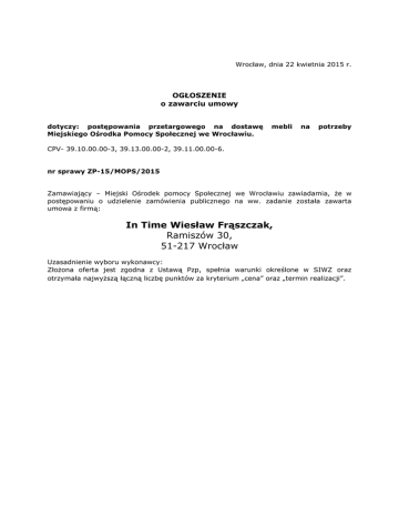Wrocław, dnia 22 kwietnia 2015 r. OGŁOSZENIE o zawarciu umowy dotyczy: postępowania przetargowego na dostawę Miejskiego Ośrodka Pomocy Społecznej we Wrocławiu. mebli na potrzeby CPV- 39.10.00.00-3, 39.13.00.00-2, 39.11.00.00-6. nr sprawy ZP-15/MOPS/2015 Zamawiający – Miejski Ośrodek pomocy Społecznej we Wrocławiu zawiadamia, że w postępowaniu o udzielenie zamówienia publicznego na ww. zadanie została zawarta umowa z firmą: In Time Wiesław Frąszczak, Ramiszów 30, 51-217 Wrocław Uzasadnienie wyboru wykonawcy: Złożona oferta jest zgodna z Ustawą Pzp, spełnia warunki określone w SIWZ oraz otrzymała najwyższą łączną liczbę punktów za kryterium „cena” oraz „termin realizacji”.
