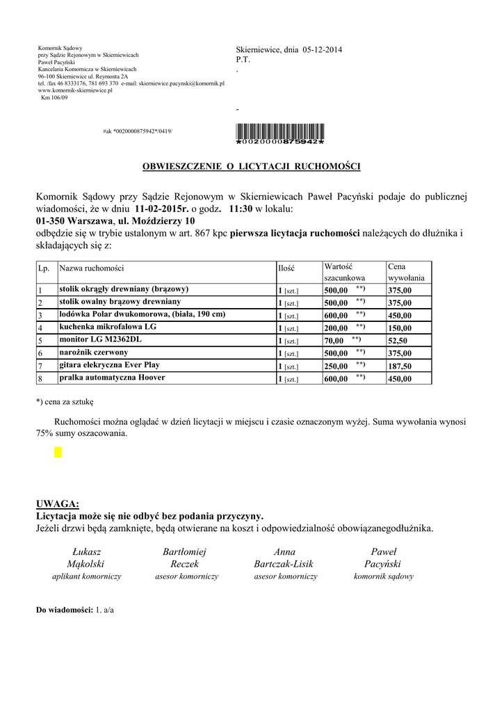 Komornik Sądowy przy Sądzie Rejonowym w Skierniewicach Paweł Pacyński Kancelaria Komornicza w Skierniewicach 96-100 Skierniewice ul. Reymonta 2A tel. /fax 46 8333176, 781 693 370 e-mail: [email protected] www.komornik-skierniewice.pl Km 106/09 Skierniewice, dnia 05-12-2014 P.T. . #ak *0020000875942*/0419/ *0020000875942* OBWIESZCZENIE O LICYTACJI RUCHOMOŚCI Komornik Sądowy przy Sądzie Rejonowym w Skierniewicach Paweł Pacyński podaje do publicznej wiadomości, że w dniu 11-02-2015r. o godz. 11:30 w lokalu: 01-350 Warszawa, ul. Moździerzy 10 odbędzie się w trybie ustalonym w art. 867 kpc pierwsza licytacja ruchomości należących do dłużnika i składających się z: Lp. Nazwa ruchomości Ilość 1 2 3 4 5 6 7 8 stolik okrągły drewniany (brązowy) stolik owalny brązowy drewniany lodówka Polar dwukomorowa, (biała, 190 cm) kuchenka mikrofalowa LG monitor LG M2362DL narożnik czerwony gitara elekryczna Ever Play pralka automatyczna Hoover 1 [szt.] 1 [szt.] 1 [szt.] 1 [szt.] 1 [szt.] 1 [szt.] 1 [szt.] 1 [szt.] Wartość szacunkowa 500,00 **) 500,00 **) 600,00 **) 200,00 **) 70,00 **) 500,00 **) 250,00 **) 600,00 **) Cena wywołania 375,00 375,00 450,00 150,00 52,50 375,00 187,50 450,00 *) cena za sztukę Ruchomości można oglądać w dzień licytacji w miejscu i czasie oznaczonym wyżej. Suma wywołania wynosi 75% sumy oszacowania. UWAGA: Licytacja może się nie odbyć bez podania przyczyny. Jeżeli drzwi będą zamknięte, będą otwierane na koszt i odpowiedzialność obowiązanegodłużnika. Łukasz Mąkolski Bartłomiej Reczek Anna Bartczak-Lisik Paweł Pacyński aplikant komorniczy asesor komorniczy asesor komorniczy komornik sądowy Do wiadomości: 1. a/a