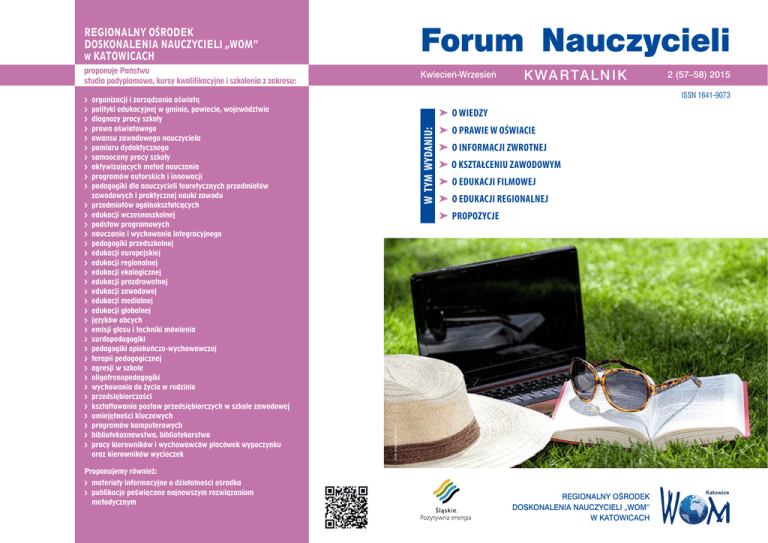 Regionalny Ośrodek Doskonalenia Nauczycieli „WOM” w Katowicach Forum Nauczycieli proponuje Państwu studia podyplomowe, kursy kwalifikacyjne i szkolenia z zakresu: Kwiecień-Wrzesień W tym wydaniu: ➤ O wiedzy ➤ O prawie w oświacie ➤ O informacji zwrotnej ➤ O kształceniu zawodowym ➤ O edukacji filmowej ➤ O edukacji regionalnej ➤ PROPOZYCJE Foto: www.fotolia.com zawodowych i praktycznej nauki zawodu przedmiotów ogólnokształcących edukacji wczesnoszkolnej podstaw programowych nauczania i wychowania integracyjnego pedagogiki przedszkolnej edukacji europejskiej edukacji regionalnej edukacji ekologicznej edukacji prozdrowotnej edukacji zawodowej edukacji medialnej edukacji globalnej języków obcych emisji głosu i techniki mówienia surdopedagogiki pedagogiki opiekuńczo-wychowawczej terapii pedagogicznej agresji w szkole oligofrenopedagogiki wychowania do życia w rodzinie przedsiębiorczości kształtowania postaw przedsiębiorczych w szkole zawodowej umiejętności kluczowych programów komputerowych bibliotekoznawstwa, bibliotekarstwa pracy kierowników i wychowawców placówek wypoczynku oraz kierowników wycieczek Proponujemy również: › materiały informacyjne o działalności ośrodka › publikacje poświęcone najnowszym rozwiązaniom metodycznym 2 (57–58) 2015 ISSN 1641-9073 › organizacji i zarządzania oświatą › polityki edukacyjnej w gminie, powiecie, województwie › diagnozy pracy szkoły › prawa oświatowego › awansu zawodowego nauczyciela › pomiaru dydaktycznego › samooceny pracy szkoły › aktywizujących metod nauczania › programów autorskich i innowacji ›pedagogiki dla nauczycieli teoretycznych przedmiotów › › › › › › › › › › › › › › › › › › › › › › › › › › Kw a r ta l n i k Regionalny Ośrodek Doskonalenia nauczycieli „WOM” w Katowicach FORUM NAUCZYCIELI Nr 2 (57–58) 2015 Od Redakcji Kwartalnik Regionalnego Ośrodka Doskonalenia Nauczycieli „WOM” Redaktor naczelny: Bohdan Doboszyński Zespół redakcyjny: Anna Zakrzewska-Zamora Iwona Kruszewska-Stoły Współpraca merytoryczna: Zespół doradców języka polskiego Redakcja i korekta: Iwona Kruszewska-Stoły Projekt okładki: Bożena Kik, Karina Łopata Skład komputerowy, druk: Drukarnia Archidiecezjalna w Katowicach ul. Wita Stwosza 11 40-042 Katowice www.drukarch.com.pl Wydawca: Regionalny Ośrodek Doskonalenia Nauczycieli „WOM” w Katowicach (Akredytacja Śląskiego Kuratora Oświaty KB.ZA.AD.42018/1/05 8 lutego 2005) Adres Redakcji: Regionalny Ośrodek Doskonalenia Nauczycieli „WOM” 40-132 Katowice ul. kard. Wyszyńskiego 7 tel. (32) 203 59 67 w. 201 fax (32) 258 18 52 e-mail: [email protected] © Copyright by Regionalny Ośrodek Doskonalenia Nauczycieli „WOM” w Katowicach Nakład: 1000 egz. Redakcja nie ponosi odpowiedzialności za treść artykułów, ogłoszeń i reklam oraz zastrzega sobie prawo skracania tekstów. Materiałów nie zamówionych nie zwracamy. Za nadesłane materiały redakcja nie wypłaca honorariów. I. 2 O wiedzy Krzysztof Bednarek W poszukiwaniu dowodów Regionalny Ośrodek Doskonalenia Nauczycieli „WOM” 40-132 Katowice ul. ks. kard. Stefana Wyszyńskiego 7 3 adres internetowy: strona internetowa: centrala telefoniczna: 5 mgr Anna Zakrzewska-Zamora [email protected] www.womkat.edu.pl (32) 258 13 97, 203 59 67 II. O prawie w oświacie Ewa Jakubowska Już sam § wygląda jak narzędzie tortury – Stanisław Jerzy Lec Dyrektor tel. (32) 258 22 09; e-mail: [email protected] Wicedyrektor dr Tomasz Grad III. O informacji zwrotnej Krystyna Błażusiak, Krystyna DębskaPacewicz, Cezary Lempa, Magdalena Leśniak, Małgorzata Mike, Małgorzata Sokół Jak monitorować i dokumentować tworzenie informacji zwrotnej dla ucznia? (na wybranych przykładach) Zastępca Dyrektora ds. Administracyjno-Ekonomicznych mgr Beata Żurowicz 8 IV. O kształceniu zawodowym Maria Kaczmarek Możliwości stosowania elementów strategii oceniania kształtującego w kształceniu zawodowym Jerzy Kropka Tekst przewodni w praktyce 13 16 V. O edukacji filmowej Urszula Wykurz Kadry rzeczywistości: o edukacyjnych wartościach Filmoteki Szkolnej tel. (32) 258 22 09; e-mail: [email protected] 18 tel. w. 220; e-mail: [email protected] Pracownia Rozwoju Zawodowego Nauczycieli dr Barbara Ziółkowska – kierownik mgr Joanna Drążek mgr Ewa Jakubowska mgr Marianna Kłyk mgr Mariola Lux dr Paweł Matyszkiewicz mgr Maria Syta tel. w. 224; e-mail: [email protected] tel. bezp. (32) 258 38 01; w. 122; e-mail: [email protected] tel. w. 202; e-mail: [email protected] tel. w. 224; e-mail: [email protected] tel. (32) 259 98 85; w. 119; e-mail: [email protected] tel. bezp. (32) 258 38 01; w. 122; e-mail: [email protected] tel. (32) 259 98 85; w. 119; e-mail: [email protected] Pracownia Zarządzania i Analiz Oświatowych mgr Elżbieta Drobiec – kierownik mgr Krzysztof Bednarek mgr Cezary Lempa mgr Jolanta Nędzyńska-Fudalej mgr Renata Stanek-Kozłowska tel. bezp. (32) 259 98 35; w. 203; e-mail: [email protected] tel. w. 221; e-mail: [email protected] tel. w. 221; e-mail: [email protected] tel. bezp. (32) 259 98 35; w. 203; e-mail: [email protected] tel. w. 217; e-mail: [email protected] Pracownia Edukacji Zawodowej i Międzykulturowej VI. O edukacji regionalnej Łucja Staniczek Edukacja regionalna jako działanie wieloaspektowe 21 mgr Anna Czarlińska-Wężyk – kierownik mgr Maria Kaczmarek dr inż. Jerzy Kropka mgr Małgorzata Łukaszewska tel. w. 223; e-mail: [email protected] tel. bezp. (32) 259 98 48; w. 212; e-mail: [email protected] tel. bezp. (32) 259 98 48; w. 212; e-mail: [email protected] tel. w. 208; e-mail: [email protected] Pracownia Informacji Pedagogicznej VII. Propozycje Betyna Hem 26 Drugie życie książki Aneta Bednarek Szkolne potyczki frazeologiczne to dla nas 28 bułka z masłem Tomasz Ptaszek Przestrzeń kosmiczna i bezkres oceanu w filmie Stanleya Kubricka „2001: Odyseja kosmiczna” 35 i