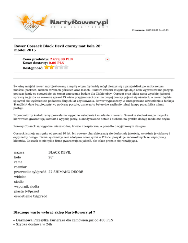 Utworzono: 2017-03-04 04:43:13 Rower Cossack Black Devil czarny mat koła 28'' model 2015 Cena produktu: 2 699,00 PLN Koszt dostawy: 0,00 PLN Dostępność: Świetny miejski rower zaprojektowany z myślą o tym, by każdy mógł cieszyć się z przejażdżek po zatłoczonym mieście, parkach, niskich terenach górskich oraz lasach. Budowa roweru miejskiego daje nam wyprostowaną pozycję podczas jazdy co spowoduje, że temat zmęczenia będzie dla Ciebie obcy. Osprzęt oraz lekka rama wysokiej jakości, sprawią że jazda na rowerze sprawi Ci wiele przyjemności oraz na twojej twarzy pojawi się uśmiech, a rower będzie spisywał się wyśmienicie podaczas długich lat użytkowania. Rower wyposażony w zintegrowane oświetlenie a funkcja Standlicht daje bezpieczeństwo podczas postoju, oznacza to bateryjne zasilenie tylnej lampy przez kilka minut postoju. Ergonomiczny kształt ramy pozwala na wygodne wsiadanie i zsiadanie z roweru. Szerokie siodło-kanapa i wysoka kierownica gwarantują komfort i wygodę jazdy, a anodyzowane detale i niebanalna grafika dodają modelowi szyku. Rowery Cossack są wygodne, niezawodne, trwałe i bezpieczne, a ponadto o wyjątkowym designu. Cossack istnieje na rynku od ponad 10 lat. Ich rowery charakteryzują się doskonałą jakością, wyróżnia je ciekawy i oryginalny design. Firma systematycznie zdobywa nowe rynki w Polsce, pozyskuje zadowolonych ze współpracy klientów. Cossack to nie tylko firma gwarantująca jakość, ale także prężnie się rozwijająca. nazwa BLACK DEVIL koło 28″ rama rozmiar przerzutka tył/przód 27 SHIMANO DEORE widelec siodło wspornik siodła piasta tył/przód oświetlenie tył/przód Dlaczego warto wybrać sklep NartyRowery.pl ? ● ● Darmowa Przesyłka Kurierska dla zamówień już od 400 PLN Szybka dostawa w 24h ● ● ● ● ● ● ● ● ● ● ● Możliwość zwrotu lub wymiany towaru w ciągu 10 dni od zakupu W naszym sklepie internetowym są tylko aktualnie dostępne produkty (zredukowaliśmy do minimum ryzyko braku dostępności zamówionego towaru) Możliwość negocjacji cen Częste promocje i rabaty ( obniżki cen, rabat na akcesoria, gratisy do rowerów) Fachowe doradztwo Pozytywne opinie w niezależnych serwisach m.in. Opineo, Allegro i porównywarkach cen Możliwość zakupu na raty - obsługujemy systemy Żagiel i Cetelem Sprzedajemy rowery wyregulowane i przesmarowane Do każdego zamówienia otrzymasz paragon lub fakturę stanowiący podstawę gwarancji Szczegółowe informacje o statusie zamówienia i wysyłce na adres e-mail podany w zamówieniu Obsługujemy płatności internetowe i Paypal Dołożono wszelkich starań, aby opisy i zdjęcia produktów były dokładne i aktualne. Specyfikacje i ceny mogą ulec zmianie bez uprzedzenia Płeć Przeznaczenie Damski Trekkingowy Widelec/ amortyzator - Manetki - Przerzutka przód SHIMANO DEORE Kaseta/ wolnobieg - Przerzutka tył SHIMANO DEORE Korbowód - Pedały - Hamulce - Piasta przód - Piasta tył - Obręcze - Szprychy - Kolekcja 2015 Opony - Stery - Mostek - Kierownica - Chwyty - Siodło - Sztyca - Waga - Rama - Hamulce V-Brake Damper - Pegi - Łańcuch Gwarancja Ilość biegów Adres: http://nartyrowery.pl/ 24 miesiące 27 Telefon: 34 365 66 09, 793 61 04 29 Email: [email protected] Gadu-Gadu: Skype: