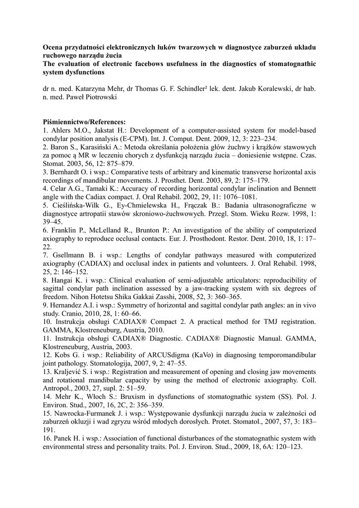 Ocena przydatności elektronicznych łuków twarzowych w diagnostyce zaburzeń układu ruchowego narządu żucia The evaluation of electronic facebows usefulness in the diagnostics of stomatognathic system dysfunctions dr n. med. Katarzyna Mehr, dr Thomas G. F. Schindler² lek. dent. Jakub Koralewski, dr hab. n. med. Paweł Piotrowski Piśmiennictwo/References: 1. Ahlers M.O., Jakstat H.: Development of a computer-assisted system for model-based condylar position analysis (E-CPM). Int. J. Comput. Dent. 2009, 12, 3: 223–234. 2. Baron S., Karasiński A.: Metoda określania położenia głów żuchwy i krążków stawowych za pomoc ą MR w leczeniu chorych z dysfunkcją narządu żucia – doniesienie wstępne. Czas. Stomat. 2003, 56, 12: 875–879. 3. Bernhardt O. i wsp.: Comparative tests of arbitrary and kinematic transverse horizontal axis recordings of mandibular movements. J. Prosthet. Dent. 2003, 89, 2: 175–179. 4. Celar A.G., Tamaki K.: Accuracy of recording horizontal condylar inclination and Bennett angle with the Cadiax compact. J. Oral Rehabil. 2002, 29, 11: 1076–1081. 5. Cieślińska-Wilk G., Ey-Chmielewska H., Frączak B.: Badania ultrasonograficzne w diagnostyce artropatii stawów skroniowo-żuchwowych. Przegl. Stom. Wieku Rozw. 1998, 1: 39–45. 6. Franklin P., McLelland R., Brunton P.: An investigation of the ability of computerized axiography to reproduce occlusal contacts. Eur. J. Prosthodont. Restor. Dent. 2010, 18, 1: 17– 22. 7. Gsellmann B. i wsp.: Lengths of condylar pathways measured with computerized axiography (CADIAX) and occlusal index in patients and volunteers. J. Oral Rehabil. 1998, 25, 2: 146–152. 8. Hangai K. i wsp.: Clinical evaluation of semi-adjustable articulators: reproducibility of sagittal condylar path inclination assessed by a jaw-tracking system with six degrees of freedom. Nihon Hotetsu Shika Gakkai Zasshi, 2008, 52, 3: 360–365. 9. Hernandez A.I. i wsp.: Symmetry of horizontal and sagittal condylar path angles: an in vivo study. Cranio, 2010, 28, 1: 60–66. 10. Instrukcja obsługi CADIAX® Compact 2. A practical method for TMJ registration. GAMMA, Klostreneuburg, Austria, 2010. 11. Instrukcja obsługi CADIAX® Diagnostic. CADIAX® Diagnostic Manual. GAMMA, Klostreneuburg, Austria, 2003. 12. Kobs G. i wsp.: Reliability of ARCUSdigma (KaVo) in diagnosing temporomandibular joint pathology. Stomatologija, 2007, 9, 2: 47–55. 13. Kraljević S. i wsp.: Registration and measurement of opening and closing jaw movements and rotational mandibular capacity by using the method of electronic axiography. Coll. Antropol., 2003, 27, supl. 2: 51–59. 14. Mehr K., Włoch S.: Bruxism in dysfunctions of stomatognathic system (SS). Pol. J. Environ. Stud., 2007, 16, 2C, 2: 356–359. 15. Nawrocka-Furmanek J. i wsp.: Występowanie dysfunkcji narządu żucia w zależności od zaburzeń okluzji i wad zgryzu wśród młodych dorosłych. Protet. Stomatol., 2007, 57, 3: 183– 191. 16. Panek H. i wsp.: Association of functional disturbances of the stomatognathic system with environmental stress and personality traits. Pol. J. Environ. Stud., 2009, 18, 6A: 120–123. 17. Panek H.: Systemy komputerowe w diagnostyce zaburzeń układu stomatognatycznego [w:] Panek H. (red.): Nowe technologie w protetyce stomatologicznej. Akademia Medyczna we Wrocławiu, Wrocław 2006. 18. Petrie C.S., Woolsey G.D., Williams K.: Comparison of recordings obtained with computerized axiography and mechanical pantography at 2 time intervals. J. Prosthodont., 2003, 12, 2: 102–110. 19. Sadat-Khonsari R. i wsp.: Mandibular instantaneous centers of rotation in patients with and without temporomandibular dysfunction. J. Orofac. Orthop., 2003, 64, 4: 256–264. 20. Shibasaki K. i wsp.: Development of a new device for recording condylar head movement. J. Oral Rehabil., 2000, 27, 3: 245–249.