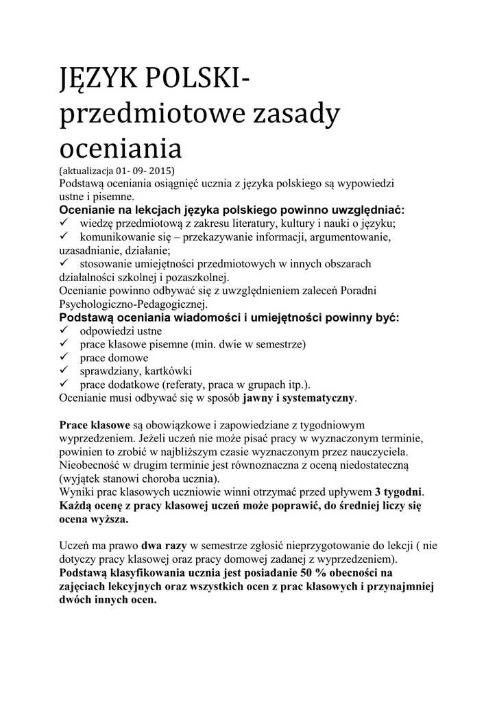 JĘZYK POLSKIprzedmiotowe zasady oceniania (aktualizacja 01- 09- 2015) Podstawą oceniania osiągnięć ucznia z języka polskiego są wypowiedzi ustne i pisemne. Ocenianie na lekcjach języka polskiego powinno uwzględniać: wiedzę przedmiotową z zakresu literatury, kultury i nauki o języku; komunikowanie się – przekazywanie informacji, argumentowanie, uzasadnianie, działanie; stosowanie umiejętności przedmiotowych w innych obszarach działalności szkolnej i pozaszkolnej. Ocenianie powinno odbywać się z uwzględnieniem zaleceń Poradni Psychologiczno-Pedagogicznej. Podstawą oceniania wiadomości i umiejętności powinny być: odpowiedzi ustne prace klasowe pisemne (min. dwie w semestrze) prace domowe sprawdziany, kartkówki prace dodatkowe (referaty, praca w grupach itp.). Ocenianie musi odbywać się w sposób jawny i systematyczny. Prace klasowe są obowiązkowe i zapowiedziane z tygodniowym wyprzedzeniem. Jeżeli uczeń nie może pisać pracy w wyznaczonym terminie, powinien to zrobić w najbliższym czasie wyznaczonym przez nauczyciela. Nieobecność w drugim terminie jest równoznaczna z oceną niedostateczną (wyjątek stanowi choroba ucznia). Wyniki prac klasowych uczniowie winni otrzymać przed upływem 3 tygodni. Każdą ocenę z pracy klasowej uczeń może poprawić, do średniej liczy się ocena wyższa. Uczeń ma prawo dwa razy w semestrze zgłosić nieprzygotowanie do lekcji ( nie dotyczy pracy klasowej oraz pracy domowej zadanej z wyprzedzeniem). Podstawą klasyfikowania ucznia jest posiadanie 50 % obecności na zajęciach lekcyjnych oraz wszystkich ocen z prac klasowych i przynajmniej dwóch innych ocen. Ocenę celującą otrzymuje uczeń, który: opanował wiadomości i umiejętności na poziomie ponadpodstawowym; zna i prezentuje lektury dodatkowe podane przez polonistę; bierze udział w szkolnych konkursach języka polskiego; bierze udział w Olimpiadzie Literatury i Języka Polskiego; bierze udział w innych pozaszkolnych konkursach i przedsięwzięciach twórczych związanych z językiem polskim. Uczeń ma obowiązek uzupełnić notatki z lekcji, które opuścił oraz zaliczyć materiał z lekcji, na których był nieobecny (niezależnie od przyczyn nieobecności). Termin i formę zaliczenia ustala nauczyciel. Uczeń może podwyższyć ocenę roczną z przedmiotu poprzez poddanie się kontroli wiadomości i umiejętności w formie pisemnej. Chęć taką musi zgłosić przed wystawieniem oceny ostatecznej. Uczeń, który otrzyma wysoką ocenę z pomiaru (wyższą niż ocena sugerowana roczna) może mieć podniesioną ocenę roczną o jeden stopień. KRYTERIA OCENY PRAC KLASOWYCH: celujący > 95% bardzo dobry 85% - 94% dobry 70% - 84% dostateczny 50% - 69% dopuszczający 30% - 49% niedostateczny < 29% SPOSÓB WYSTAWIANIA OCENY SEMESTRALNEJ I ROCZNEJ Z JĘZYKA POLSKIEGO: Podstawą wystawienia oceny semestralnej będzie średnia ważona ocen otrzymanych w ciągu semestru, zaś rocznej – średnia ważona wszystkich ocen otrzymanych w całym roku szkolnym. WAGI OCEN: prace klasowe – waga 6 odpowiedzi ustne – waga 5 prace domowe, sprawdziany – waga 3 inne (kartkówki, praca w grupie, referaty, aktywność, itp.) – waga 2 Ocena na koniec semestru jest wystawiana wg zasady zaokrąglania: profil podstawowy i rozszerzony od 0,50 w górę (wyjątek stanowi ocena dopuszczająca, którą można otrzymać po uzyskaniu średniej 1,7). Ocena na świadectwie maturalnym jest wystawiana na podstawie średniej ważonej ocen rocznych uzyskanych w całym cyklu kształcenia wg zasady: Klasa I – waga 2 Klasa II – waga 2 Klasa III – waga 6 Zaokrąglanie w obu profilach od 0,50 w górę. Zespół przedmiotowy: Katarzyna Maciesza Beata Orzech Danuta Huszcza-Sawicka Jan Zaborowski