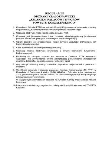 REGULAMIN ODZNAKI KRAJOZNAWCZEJ „SZLAKIEM PAŁACÓW I DWORÓW POWIATU KOSZALIŃSKIEGO” 1. Koszaliński Oddział PTTK na wniosek Komisji Krajoznawczej ustanawia odznakę krajoznawczą „Szlakiem pałaców i dworów powiatu koszalińskiego”. 2. Odznakę zdobywać może każda osoba powyżej 7 lat. 3. Odznaka jest jednostopniowa i jest odznaką wielodyscyplinową (zdobywana podczas wycieczek: pieszych, rowerowych, autokarowych itp.). 4. Celem odznaki jest propagowanie wśród turystów zabytków architektury, ich historii i teraźniejszości. 5. Czas zdobywania odznaki jest nieograniczony. 6. Odznakę można zdobywać równolegle z innymi odznakami turystycznokrajoznawczymi. 7. Podstawą do zdobycia odznaki jest złożenie w Oddziale PTTK książeczki wycieczek lub prowadzenie kroniki zawierającej potwierdzenie zwiedzanych obiektów (fotografie, pieczątki, rysunki, wykonany opis). 8. Aby zdobyć odznakę należy odwiedzić piętnaście miejscowości z pałacami i dworami. 9. Weryfikacji dokonuje i odznakę przyznaje Komisja Krajoznawcza ZO PTTK w Koszalinie ul. Dworcowa 4 telefon (0-94) 342-46-41. Odznaka, której cena wynosi 11 zł, jest do nabycia w biurze Oddziału na podstawie legitymacji, którą otrzymuje zdobywający przy weryfikacji. W wyjątkowych przypadkach odznaka na wniosek Komisji może zostać nadana honorowo. 10. Interpretacja niniejszego regulaminu należy do Komisji Krajoznawczej ZO PTTK Koszalin. WYKAZ MIEJSCOWOŚCI, W KTÓRYCH ZNAJDUJĄ SIĘ PAŁACE LUB DWORY: Miejscowość: Biesiekierz Bożniewice Cetuń Chocimino Cieszyn Cybulino Dargiń Dobrociechy Dunowo Dworek Garbno Gąski Giezkowo Głodowa Grzybnica Kępsko Kładno Kłanino Kopaniewo Koszalin Kraśnik Mielno Mścice Nacław Nosowo Osieki Parnowo Parsowo Pleśna Rzeczyca Skibno Strzekęcino Strzekęcino Strzepowo Wielin Wietrzno Wyszebórz Żydowo Opis: Pałac Gerlachów z XIX w. Dwór z 1850 r. Pałac neogotycki z wewnętrznym dziedzińcem z XIX w. Dwór – przebudowany po 1930 r. Dwór z 1900 r. Pałac trzykondygnacyjny z 1879 r. Dwór z XIX w. Pałac z XIX w. Dwór z XIX w. Pałac neoklasycystyczny z XIX w. Dwór klasycystyczny z XVIII w. Pałac z XIX w. – obecnie ośrodek wypoczynkowy Dwór z XIX w. Dwór z XIX w. Pałac z kolista wieżą ze stożkowatym hełmem z XIX w. Dwór neoklasycystyczny Pałac neoklasycystyczny z XIX w. Pałac w stylu eklektycznym z XIX w. Pałac myśliwski w stylu neogotyckim z XIX w. Pałac Młynarzy z 1842 r. – obecnie Muzeum Okręgowe Pałac w stylu klasycystycznym z XIX w. Dwór z XIX w. Dwór z 1918r. Pałac rodu Senden w stylu eklektycznym z XIX w. Pałac neorenesansowy z 1850r. – obecnie ośrodek szkoleniowy Dwór ryglowy z XIX w. – obecnie hotel Pałac z XIX w. – obecnie Dom Pomocy Społecznej Pałac barokowy z 1717-82 r., przebudowany w XX w. Pałac z XVII/XIX w. – obecnie ośrodek wczasowy Dwór z XX w. Dwór ryglowy z XX w. Pałac eklektyczny z 1899-1901 r. zwany Bursztynowym Hotelem Dwór z 1935 r. Pałac w stylu eklektycznym z XIX w. Pałac neobarokowy z 1794 r. Zespół pałacowo-folwarczny z XIX/XX w. Pałac neobarokowy z trzema kolistymi wieżami z XIX w. Dwór murowany z XX w. Powiat koszaliński obejmuje dziewięć gmin położonych w północno-wschodniej części województwa zachodniopomorskiego i ponad stutysięczny Koszalin. LITERATURA: Jarosław Ellwart – „Pomorze Środkowe – przewodnik krajoznawczy”, wyd. Region. Wszelkich informacji o Odznace udziela kol. Janusz Skowyrski tel. 0-604 059 886 2