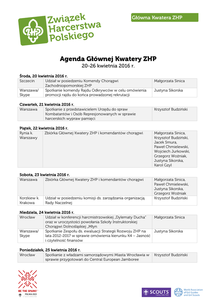 Agenda Głównej Kwatery ZHP 20-26 kwietnia 2016 r. Środa, 20 kwietnia 2016 r. Szczecin Udział w posiedzeniu Komendy Chorągwi Zachodniopomorskiej ZHP Warszawa/ Spotkanie komendy Rajdu Odkrywców w celu omówienia Skype promocji rajdu do końca prowadzonej rekrutacji Czwartek, 21 kwietnia 2016 r. Warszawa Spotkanie z przedstawicielem Urzędu do spraw Kombatantów i Osób Represjonowanych w sprawie harcerskich wypraw pamięci Piątek, 22 kwietnia 2016 r. Rynia k. Zbiórka Głównej Kwatery ZHP i komendantów chorągwi Warszawy Sobota, 23 kwietnia 2016 r. Warszawa Zbiórka Głównej Kwatery ZHP i komendantów chorągwi Korzkiew k. Krakowa Udział w posiedzeniu komisji ds. zarządzania organizacją Rady Naczelnej Małgorzata Sinica Justyna Sikorska Krzysztof Budziński Małgorzata Sinica, Krzysztof Budziński, Jacek Smura, Paweł Chmielewski, Wojciech Jurkowski, Grzegorz Woźniak, Justyna Sikorska, Karol Gzyl Małgorzata Sinica, Paweł Chmielewski, Justyna Sikorska, Grzegorz Woźniak Krzysztof Budziński Niedziela, 24 kwietnia 2016 r. Wrocław Udział w konferencji harcmistrzowskiej „Dylematy Ducha” Małgorzata Sinica oraz w uroczystości powołania Szkoły Instruktorskiej Chorągwi Dolnośląskiej „Młyn Warszawa/ Spotkanie Zespołu ds. ewaluacji Strategii Rozwoju ZHP na Justyna Sikorska Skype lata 2012-2017 w sprawie omówienia kierunku K4 – Jasność i czytelność finansów Poniedziałek, 25 kwietnia 2016 r. Wrocław Spotkanie z władzami samorządowymi Miasta Wrocławia w sprawie przygotowań do Central European Jamboree Krzysztof Budziński Lublin Spotkanie w komendzie Chorągwi Lubelskiej ZHP Warszawa/ Skype Spotkanie Harcerskiego Instytutu Badawczego w celu omówienia badania drużynowego 2016 Wtorek, 26 kwietnia 2016 r. Warszawa Robocze spotkanie Członków Głównej Kwatery ZHP Warszawa Spotkanie z Dowódcą Garnizonu Warszawa Warszawa Warszawa/ Skype Warszawa Spotkanie z Komendantem Hufca ZHP Jordanów Spotkanie Harcerskiego Instytutu Badawczego w celu omówienia badań i publikacji na rok 2016/2017 Spotkanie robocze ws. dokumentów potwierdzających członkostwo w ZHP Paweł Chmielewski Grzegorz Woźniak Justyna Sikorska Wszyscy Członkowie GK ZHP Małgorzata Sinica, Krzysztof Budziński Małgorzata Sinica Justyna Sikorska Małgorzata Sinica Krzysztof Budziński Paweł Chmielewski Justyna Sikorska Karol Gzyl Uwaga! Agenda nie zawiera codziennych zadań i wewnętrznych spotkań Członków Głównej Kwatery ZHP. 2016-04-26 23.00 KGZ