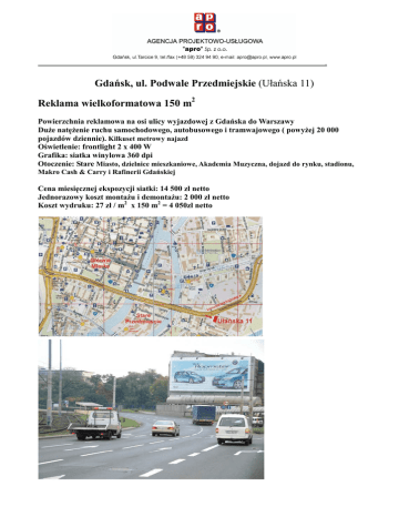 . Gdańsk, ul. Podwale Przedmiejskie (Ułańska 11) Reklama wielkoformatowa 150 m2 Powierzchnia reklamowa na osi ulicy wyjazdowej z Gdańska do Warszawy Duże natężenie ruchu samochodowego, autobusowego i tramwajowego ( powyżej 20 000 pojazdów dziennie). Kilkuset metrowy najazd Oświetlenie: frontlight 2 x 400 W Grafika: siatka winylowa 360 dpi Otoczenie: Stare Miasto, dzielnice mieszkaniowe, Akademia Muzyczna, dojazd do rynku, stadionu, Makro Cash & Carry i Rafinerii Gdańskiej Cena miesięcznej ekspozycji siatki: 14 500 zł netto Jednorazowy koszt montażu i demontażu: 2 000 zł netto Koszt wydruku: 27 zł / m2 x 150 m2 = 4 050zł netto AGENCJA PROJEKTOWO - USŁUGOWA “APRO” 80-718 Gdańsk ul. Tarcice 9 tel. (058) 324 94 90 fax. 324 94 90 w. 12 www.apro.pl; e-mail: [email protected] USYTUOWANIE SIATKI REKLAMOWEJ zdjęcie w kierunku siatki m2 Nr tablicy GA/S/11 150 miasto: Gdańsk ulica: Ułańska 11 opis: na wysokości ul. Łąkowej. Główna arteria miasta, widoczna z ul. Podwale Przedmiejskie dzielnica: Śródmieście MAPA zdjęcie od strony siatki SKRZYŻOWANIE T- JUNCTION PROSTA DROGA B B A A A A Podwale Przedmiejskie B Łąkowa RODZAJ WOLNOSTOJĄCA PŁOT/MUR NAŚCIENNA piętro RUCH PIESZY DUŻY ŚREDNI MAŁY BRAK OŚWIETLENIE TABLICY RUCH SAMOCHODOWY DUŻY ŚREDNI MAŁY BRAK WŁASNE I MIEJSKIE WŁASNE CENTRUM MIASTA BRAK MIEJSKIE DZIELNICA MIESZKANIOWA ZAKŁADY PRZEMYSŁOWE TRASA WYLOTOWA SUPERMARKET CENTRUM HANDLOWE PRZESZKODA BRAK NIEWIELKA LATEM TARGOWISKO OŚWIETLENIE TABLICY DUŻA LATEM STAŁA PROSTOPADŁE POD KĄTEM “+“ POD KĄTEM RÓWNOLEGŁE “-“ SKLEPY BIURA SZKOŁY UNIWERSYTET SZPITAL / APTEKA STACJA BENZYNOWA DWORZEC KOLEJOWY PLANSZA DOBRZE WIDZIANA Z ODLEGŁOŚCI DALEKIEJ ŚREDNIEJ MAŁEJ BLISKIEJ PRAWA STRONA LEWA STRONA SYGNALIZACJA ŚWIETLNA PRZYSTANEK KOMUNIKACJI MIEJSKIEJ ZAKAZ REKLAMOWANIA ARTYKUŁÓW ALKOHOLOWYCH ARTYKUŁÓW TYTONIOWYCH