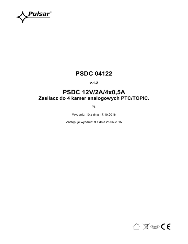 PSDC 04122 v.1.2 PSDC 12V/2A/4x0,5A Zasilacz do 4 kamer analogowych PTC/TOPIC. PL Wydanie: 10 z dnia 17.10.2016 Zastępuje wydanie: 9 z dnia 25.05.2015 www.pulsar.pl PSDC04122 Cechy zasilacza: wyjście zasilania 4x0,5A/12V DC do 4 kamer analogowych regulacja napięcia wyjściowego 12V÷15V DC 4 wyjścia zabezpieczone bezpiecznikami 0,5A możliwość wyboru bezpiecznika za pomocą zworki: topikowy lub polimerowy PTC szeroki zakres napięcia zasilania 85÷264V AC wysoka sprawność 75% sygnalizacja optyczna LED wyjście techniczne FPS sygnalizacji zadziałania bezpiecznika zabezpieczenia: przeciwzwarciowe SCP nadnapięciowe OVP przepięciowe przeciążeniowe OLP antysabotażowe gwarancja – 3 lata od daty produkcji Przykład zasilania 4 kamer analogowych. Wszystkie kanały regulowane 12V ÷ 15V DC, 4 x 0,5A SPIS TREŚCI: 1. Opis techniczny. 1.1. Opis ogólny 1.2. Schemat blokowy 1.3. Opis elementów i złącz zasilacza 1.4. Parametry techniczne 2. Instalacja. 2.1. Wymagania 2.2. Procedura instalacji 3. Sygnalizacja pracy zasilacza. 3.1. Sygnalizacja optyczna 3.2. Wyjścia techniczne 4. Obsługa oraz eksploatacja. 4.1. Przeciążenie lub zwarcie wyjścia zasilacza 4.2. Zadziałanie układu OVP zasilacza 4.3. Konserwacja 2 www.pulsar.pl PSDC04122 1. Opis techniczny. 1.1. Opis ogólny. Zasilacz stabilizowany PSDC04122 przeznaczony jest do zasilania kamer analogowych lub innych urządzeń wymagających stabilizowanego napięcia o wartości 12V DC. Zakres regulacji napięcia wyjściowego regulowany jest potencjometrem w zakresie 12V÷15V DC. Zasilacz posiada 4 wyjścia zabezpieczone niezależnie bezpiecznikami topikowymi lub polimerowymi PTC. Awaria (zwarcie) w obwodzie wyjścia spowoduje przepalenie bezpiecznika topikowego lub zadziałanie bezpiecznika PTC i odłączenie obwodu od zasilania DC (+U). Zasilacz umieszczony jest w obudowie metalowej z panelem sygnalizacyjnym wyposażonej w mikroprzełącznik sygnalizujący otwarcie drzwiczek (czołówki). 1.2. Schemat blokowy (rys.1). Rys.1. Schemat blokowy zasilacza. 1.3. Opis elementów i złącz zasilacza. Tabela 1. Elementy płyty pcb zasilacza (patrz rys. 2). Element nr Opis [1] L1…..L4 (zielone) diody LED (sygnalizują zadziałanie bezpiecznika) [2] F1…F4 bezpieczniki topikowe w obwodach AUX (+) [3] IN wejście zasilania listwy LB4/AW [4] AUX1…. AUX4 wyjścia, wspólny zacisk COM (-) LFPS (czerwona) dioda sygnalizująca awarie jednego z wyjść [5] (zadziałanie bezpiecznika) FPS wyjście sygnalizujące awarię jednego z wyjść, typ OC [6] (stan normalny L, awaria hi-Z) Zworka zmiany rodzaju bezpiecznika PTC/ topikowy Fx Fx.x [7] założona zworka Fx, wybrany bezpiecznik polimerowy Fx Fx.x założona zworka Fx.x, wybrany bezpiecznik topikowy 3 www.pulsar.pl PSDC04122 Rys. 2. Widok płyty pcb zasilacza. Tabela 2. Elementy zasilacza (patrz rys. 3). Element nr Opis [1] L-N złącze zasilania 230V AC, Złącze ochrony PE [2] [3] [4] [5] [6] [7] F bezpiecznik w obwodzie 230V AC Moduł zasilacza VADJ, potencjometr, regulacja napięcia wyjściowego w zakresie 12V÷15V DC LED sygnalizacja optyczna stanu zasilania DC, głównego modułu zasilacza LB4/AW listwa bezpiecznikowa, z wyjściami zasilania i sygnalizacją optyczną Tamper, styk ochrony antysabotażowej (NC) Rys.3. Widok zasilacza. 4 www.pulsar.pl PSDC04122 1.4. Parametry techniczne: - parametry elektryczne (tab.3) - parametry mechaniczne (tab.4) - bezpieczeństwo użytkowania (tab.5) - parametry eksploatacyjne (tab.6) Parametry elektryczne (tab. 3). Napięcie zasilania Pobór prądu Moc zasilacza Sprawność Napięcie wyjściowe Prąd wyjściowy Zakres regulacji napięcia wyjściowego Napięcie tętnienia Zabezpieczenie przed zwarciem SCP Zabezpieczenie przed przeciążeniem OLP Zabezpieczenie przepięciowe Zabezpieczenie nadnapięciowe OVP Zabezpieczenie antysabotażowe -TAMPER sygnalizujące otwarcie obudowy zasilacza Wyjścia techniczne: - FPS wyjścia sygnalizujące awarię bezpiecznika (przepalenie) listw LB4/AW (zadziałanie SCP) Bezpieczniki F1÷ F4 85 ÷ 264V AC 0,3A @230V AC max. 30Wmax. 75% 12V DC 4x0,5A lub 2x1A (bezpieczniki z zestawu) ΣI= 2A 12V÷15V DC 100mV p-p max. LISTWA LB4/AW 4x F 0,5A bezpiecznik topikowy lub polimerowy PTC 0,5A MODUŁ ZASILACZA 105% ÷ 150% mocy zasilacza, ograniczenie elektroniczne prądu 105% ÷ 150% mocy zasilacza, ograniczenie elektroniczne prądu warystory >16V (przywracanie automatyczne) - microswitch, styki NC (obudowa zamknięta), 0,5A@50V DC (max.) - typ OC, 50mA max, stan normalny: poziom L (0V), awaria: poziom hi-Z F 0,5A/250V lub PTC 0,5A (wybór ręczny) Parametry mechaniczne (tab. 4). 230 x 167 x 50+8 (WxHxD) [mm] (+/- 2) Patrz rysunek 3 1,2/1,3 kg Blacha stalowa, DC01 0,7mm kolor RAL 9003 Wkręt walcowy: od czoła obudowy Zasilanie 230 V AC: Φ0,63-2,05 (AWG 22-12) Wyjścia AUX: Φ0,51- 2,05 (AWG 24-12) LB4/AW: Φ0,51- 2,05 (AWG 24-12) Wyjście TAMPER: przewody 25cm Uwagi Obudowa posiada dystans od podłoża montażowego w celu prowadzenia okablowania. Chłodzenie konwekcyjne. Wymiary obudowy Mocowanie Waga netto/brutto Obudowa Zamykanie Złącza Bezpieczeństwo użytkowania (tab.5). Klasa ochronności PN-EN 60950-1:2007 Stopień ochrony PN-EN 60529: 2002 (U) Wytrzymałość elektryczna izolacji: - pomiędzy obwodem wejściowym (sieciowym) a obwodami wyjściowymi zasilacza (I/P-O/P) - pomiędzy obwodem wejściowym a obwodem ochronnym PE (I/P-FG) - pomiędzy obwodem wyjściowym a obwodem ochronnym PE (O/P-FG) Rezystancja izolacji: - pomiędzy obwodem wejściowym a wyjściowym lub ochronnym I (pierwsza) IP20 3000V/AC min. 1500V/AC min. 500V/AC min. 100 MΩ, 500V/DC Parametry eksploatacyjne (tab.6). Temperatura pracy Temperatura składowania Wilgotność względna Wibracje w czasie pracy Udary w czasie pracy Nasłonecznienie bezpośrednie Wibracje i udary w czasie transportu -10ºC...+50ºC -25ºC...+60ºC 20%...90%, bez kondensacji niedopuszczalne niedopuszczalne niedopuszczalne Wg PN-83/T-42106 5 www.pulsar.pl PSDC04122 2. Instalac
