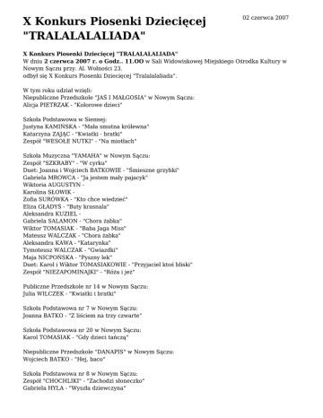 X Konkurs Piosenki Dziecięcej "TRALALALALIADA" 02 czerwca 2007 X Konkurs Piosenki Dziecięcej "TRALALALALIADA" W dniu 2 czerwca 2007 r. o Godz.. 11.OO w Sali Widowiskowej Miejskiego Ośrodka Kultury w Nowym Sączu przy. Al. Wolności 23. odbył się X Konkurs Piosenki Dziecięcej "Tralalalaliada". W tym roku udział wzięli: Niepubliczne Przedszkole "JAŚ I MAŁGOSIA" w Nowym Sączu: Alicja PIETRZAK - "Kolorowe dzieci" Szkoła Podstawowa w Siennej: Justyna KAMIŃSKA - "Mała smutna królewna" Katarzyna ZAJĄC - "Kwiatki - bratki" Zespół "WESOŁE NUTKI" - "Na miotłach" Szkoła Muzyczna "YAMAHA" w Nowym Sączu: Zespół "SZKRABY" - "W cyrku" Duet: Joanna i Wojciech BATKOWIE - "Śmieszne grzybki" Gabriela MROWCA - "Ja jestem mały pajacyk" Wiktoria AUGUSTYN Karolina SŁOWIK Zofia SURÓWKA - "Kto chce wiedzieć" Eliza GŁADYŚ - "Buty krasnala" Aleksandra KUZIEL Gabriela SALAMON - "Chora żabka" Wiktor TOMASIAK - "Baba Jaga Miss" Mateusz WALCZAK - "Chora żabka" Aleksandra KAWA - "Katarynka" Tymoteusz WALCZAK - "Gwiazdki" Maja NICPOŃSKA - "Pyszny lek" Duet: Karol i Wiktor TOMASIAKOWIE - "Przyjaciel ktoś bliski" Zespół "NIEZAPOMINAJKI" - "Róża i jeż" Publiczne Przedszkole nr 14 w Nowym Sączu: Julia WILCZEK - "Kwiatki i bratki" Szkoła Podstawowa nr 7 w Nowym Sączu: Joanna BATKO - "Z liściem na trzy czwarte" Szkoła Podstawowa nr 20 w Nowym Sączu: Karol TOMASIAK - "Gdy dzieci tańczą" Niepubliczne Przedszkole "DANAPIS" w Nowym Sączu: Wojciech BATKO - "Hej, baco" Szkoła Podstawowa nr 8 w Nowym Sączu: Zespół "CHOCHLIKI" - "Zachodzi słoneczko" Gabriela HYLA - "Wyszła dziewczyna" "OSTOJA" Zespół Pomocy Psychologiczno-Pedagogicznej w Nowym Sączu: Tercet: Małgorzata, Krzysiu i Zuzia CZERWIŃSCY - "Jak Dawid..." Protokół z obrad Komisji Artystycznej X Konkursu Piosenki Dziecięcej TRALALALALIADA, który się odbył w Miejskim Ośrodku Kultury w Nowym Sączu, w dniu 2 czerwca 2007 r. Komisja Artystyczna w składzie : Krystyna Pielichowska Małgorzata Czech Małgorzata Stobierska Józef Bartusiak – przewodniczący, po wysłuchaniu i obejrzeniu 28 prezentacji, postanowiła przyznać następujące nagrody i wyróżnienia : w kategorii występów solowych : I nagroda - Wojciech Batko z Niepublicznego Przedszkola „DANAPIS” w Nowym Sączu II nagroda - Alicja Pietrzak z Niepublicznego Przedszkola „Jaś i Małgosia” w Nowym Sączu III nagroda - Gabriela Hyla ze Szkoły Podstawowej nr 8 w Nowym Sączu Wyróżnienia - Katarzyna Zając ze Szkoły Podstawowej w Siennej Justyna Kamińska ze Szkoły Podstawowej w Siennnej Julia Wilczek z Publicznego Przedszkola nr 14 w Nowym Sączu w kategorii występów zespołowych : I nagroda - Tercet: Małgorzata, Krzysiu i Zuzia Czerwińscy z Zespołu Pomocy Psychologiczno-Pedagogicznej „OSTOJA” w Nowym Sączu II nagroda - Duet : Karol i Wiktor Tomasiakowie ze Szkoły Muzycznej YAMAHA w Nowym Sączu III nagroda - Zespół „CHOCHLIKI” ze Szkoły Podstawowej nr 8 w Nowym Sączu Wszyscy uczestnicy Przeglądu otrzymują pamiątkowe dyplomy i upominki, a laureaci nagrody ufundowane przez organizatora, czyli Miejski Ośrodek Kultury w Nowym Sączu. Na tym protokól zakończono i podpisano. Nowy Sącz, dnia 2 czerwca 2007 r. Galeria zdjęć