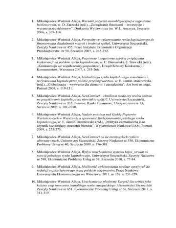 1. Mikołajewicz-Woźniak Alicja, Warunki pożyczki euroobligacyjnej a zagrożenie bankructwem, w: D. Zarzecki (red.), „Zarządzanie finansami – inwestycje i wycena przedsiębiorstw”, Drukarnia Wydawnicza im. W.L. Anczyca, Szczecin 2006, s. 307-314. 2. Mikołajewicz-Woźniak Alicja, Perspektywy wykorzystania rynku kapitałowego do finansowania działalności małych i średnich spółek, Uniwersytet Szczeciński, Zeszyty Naukowe nr 455, Prace Instytutu Ekonomiki i Organizacji Przedsiębiorstw nr 50, Szczecin 2007, s. 245-252. 3. Mikołajewicz-Woźniak Alicja, Pozytywne i negatywne aspekty zwiększenia konkurencji na polskim rynku kapitałowym, w: C. Banasiński, E. Stawicki (red.), „Konkurencja we współczesnej gospodarce”, Urząd Ochrony Konkurencji i Konsumentów, Warszawa 2007, s. 253-266. 4. Mikołajewicz-Woźniak Alicja, Globalizacja rynku kapitałowego a możliwości pozyskiwania kapitału przez polskie przedsiębiorstwa, w: E. Jantoń-Drozdowska (red.), „Globalizacja – wyzwania dla ekonomii i zarządzania”, Ars boni et aequi, Poznań 2008, s. 119-131. 5. Mikołajewicz-Woźniak Alicja, NewConnect – chwilowa moda czy realna szansa na pozyskiwanie kapitału przez niewielkie spółki?, Uniwersytet Szczeciński, Zeszyty Naukowe nr 515, Finanse, Rynki Finansowe, Ubezpieczenia nr 13, Szczecin 2008, s. 201-2010. 6. Mikołajewicz-Woźniak Alicja, Nadzór państwa nad Giełdą Papierów Wartościowych w Warszawie a sprawność funkcjonowania polskiego rynku kapitałowego, w: E. Jantoń-Drozdowska (red.), „Polityka ekonomiczna jako czynnik kształtujący otoczenie biznesu”, Wydawnictwo Naukowe UAM, Poznań 2009, s. 255-273. 7. Mikołajewicz-Woźniak Alicja, NewConnect na tle europejskich rynków alternatywnych, Uniwersytet Szczeciński, Zeszyty Naukowe nr 550, Ekonomiczne Problemy Usług nr 40, Szczecin 2009, s. 376-381. 8. Mikołajewicz-Woźniak Alicja, Wpływ uruchomienia systemu kdpw_stream na rozwój polskiego rynku kapitałowego, Uniwersytet Szczeciński, Zeszyty Naukowe nr 598, Ekonomiczne Problemy Usług nr 58, Szczecin 2010, s. 77-84. 9. Mikołajewicz-Woźniak Alicja, Możliwość wykorzystania struktur opcyjnych do redukcji ryzyka kursowego przez polskich eksporterów, Prace Naukowe Uniwersytetu Ekonomicznego we Wrocławiu 2011, nr 158, s. 251-259. 10. Mikołajewicz-Woźniak Alicja, Uruchomienie platformy Target2-Securities jako kolejny etap tworzenia jednolitego rynku europejskiego, Uniwersytet Szczeciński Zeszyty Naukowe nr 651, Ekonomiczne Problemy Usług nr 68, Szczecin 2011, s. 311-319. 11. Mikołajewicz-Woźniak Alicja, System emerytalny w Szwajcarii. Możliwość implementacji jego zasad w Polsce, [w:] "Przegląd Ekonomiczny. Kwartalnik Polskiego Towarzystwa Ekonomicznego" 2012, nr 6, s. 17-27. 12. Mikołajewicz-Woźniak Alicja, Minimalna wymagana stopa zwrotu a zyskowność aktywów gromadzonych w polskich i szwajcarskich funduszach emerytalnych [w:] „Zarządzanie i Finanse” 2013, nr 2, cz. 5, s. 147-159. 13. Mikołajewicz-Woźniak Alicja, Załamanie systemu zielonych certyfikatów a finansowanie wytwarzania energii z odnawialnych źródeł, Prace Naukowe Uniwersytetu Ekonomicznego we Wrocławiu 2013, nr 32, str. 96-105. 14. Mikołajewicz-Woźniak Alicja, Minimalna wymagana stopa zwrotu a zyskowność aktywów gromadzonych w polskich i szwajcarskich funduszach emerytalnych, Zarządzanie i Finanse 2013, nr 11, str. 147-159. 15. Mikołajewicz-Woźniak Alicja, Siciński Robert, Zarządzanie ryzykiem walutowym przez niefinansowe spółki wchodzące w skład indeksu WIG30, Roczniki Naukowe Wyższej Szkoły Bankowej w Toruniu 2013, nr 12, str. 243-261. 16. Mikołajewicz-Woźniak Alicja, Wpływ walut wirtualnych na skuteczność polityki pieniężnej, Zeszyty Naukowe Wyższej Szkoły Bankowej w Poznaniu 2014, nr 56, str. 139-152. 17. Mikołajewicz-Woźniak Alicja, Scheibe Anna, Virtual currency schemes – the future of financial services, Foresight - The journal of future studies, strategic thinking and policy 2015. [praca zaakceptowana do druku]