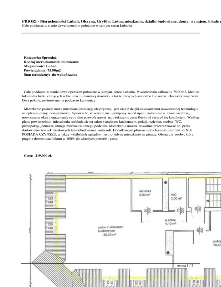 PRIORI - Nieruchomości Lubań, Olszyna, Gryfów, Leśna, miezkania, działki budowlane, domy, wynajem, lokale u Całe poddasze w stanie deweloperskim położone w samym sercu Lubania Kategoria: Sprzedaż Rodzaj nieruchomości: mieszkanie Miejscowość: Lubań Powierzchnia: 75,90m2 Stan techniczny: do wykończenia Całe poddasze w stanie deweloperskim położone w samym sercu Lubania. Powierzchnia całkowita 75,90m2. Idealne lokum dla ludzi ceniących sobie urok Lubańskiej starówki, a także chcących samodzielnie nadać charakter wnętrzom. Dwa pokoje, usytuowane na poddaszu kamienicy. Mieszkanie posiada nową miedzianą instalację elektryczną, jest ciepłe dzięki zastosowaniu nowoczesnej technologii ocieplenia- piany ociepleniowej. Sprawia to, iż w lecie nie ugotujemy się od upału, natomiast w zimie szczelne, nowoczesne okna i ogrzewanie centralne pozwolą nawet największemu zmarźluchowi cieszyć się komfortem. Według planu powierzchnia mieszkania rozkłada się na salon z aneksem kuchennym, pokój, łazienkę, osobne WC, przedpokój, jednakże istnieje możliwość innego podziału. Mieszkanie można dowolnie przearanżować np. przez dostawienie ścianek działowych lub dobudowanie antresoli. Dodatkowym plusem nieruchomości jest fakt, iż NIE POSIADA CZYNSZU, a także wścibskich sąsiadów- jest to jedyne mieszkanie na piętrze. Oferta dla osoby, która pragnie dostosować lokum w 100% do własnych potrzeb i gustu. Cena: 219.000 zł. strona 1 / 2 PRIORI - Nieruchomości Lubań, Olszyna, Gryfów, Leśna, miezkania, działki budowlane, domy, wynajem, lokale u Całe poddasze w stanie deweloperskim położone w samym sercu Lubania strona 2 / 2