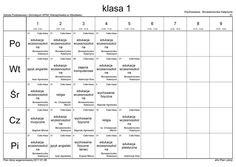klasa 1 Wychowawca : Bonawenturska Katarzyna 31 Szkoła Podstawowa i Gimnazjum SPSK Warząchewka w Włocławku 31 Po 2 3 4 5 6 7 8 9 8:00 - 8:45 8:50 - 9:35 9:50 - 10:35 10:45 - 11:30 11:45 - 12:30 12:35 - 13:20 13:25 - 14:10 14:15 - 15:00 15:05 - 15:50 Cała klasa 31 edukacja wczesnoszkol na Bonawenturska Katarzyna Bonawenturska Katarzyna Cała klasa 31 31 Cała klasa 31 edukacja wczesnoszkol na 31 Cz Cała klasa edukacja muzyczne Cała klasa Cała klasa religia 31 Cała klasa 31 Cała klasa edukacja wczesnoszkol język angielski na Bonawenturska Katarzyna Plan lekcji wygenerowany:2017-01-06 Iwan Agnieszka 31 Bonawenturska Katarzyna 28 Cała klasa zajęcia komputerowe Cała klasa Bonawenturska Katarzyna 31 31 Cała klasa edukacja wczesnoszkol na Bonawenturska Katarzyna k Cała klasa wychowanie fizyczne taniec Kujawa Milena Cała klasa Bonawenturska Katarzyna Bonawenturska Katarzyna k Cała klasa wychowanie fizyczne Stępniak Agnieszka 15 Cała klasa religia 31 31 Cała klasa edukacja wczesnoszkol na Bonawenturska Katarzyna Cała klasa edukacja wczesnoszkol na ks. Chrzęszczyk Marcin Stępniak Agnieszka Cała klasa 31 edukacja wczesnoszkol na wychowanie fizyczne k Cała klasa edukacja wczesnoszkol na Adamczyk Ewa edukacja wczesnoszkol na Bonawenturska Katarzyna Cała klasa edukacja edukacja wczesnoszkol wczesnoszkol na na ks. Chrzęszczyk Marcin Bagiński Michał 31 31 Bonawenturska Katarzyna Bonawenturska Katarzyna Pi Cała klasa edukacja język angielski wczesnoszkol na Iwan Agnieszka Śr Cała klasa edukacja wczesnoszkol na 31 Wt 1 Bonawenturska Katarzyna 31 Cała klasa edukacja plastyczna Adamczyk Ewa aSc Plan Lekcji klasa 2 Wychowawca : Drożdżewska Monika 1 Szkoła Podstawowa i Gimnazjum SPSK Warząchewka w Włocławku 1 Po 1 2 3 4 5 6 7 8 9 8:00 - 8:45 8:50 - 9:35 9:50 - 10:35 10:45 - 11:30 11:45 - 12:30 12:35 - 13:20 13:25 - 14:10 14:15 - 15:00 15:05 - 15:50 Cała klasa 1 edukacja wczesnoszkol na Cała klasa 15 język angielski matematyka Drożdżewska Monika Drożdżewska Monika k Wt Cała klasa 15 wychowanie fizyczne Śr Cała klasa 31 Cz 1 Pi matematyka Cała klasa edukacja plastyczna Iwan Agnieszka Cała klasa Cała klasa matematyka 1 Cała klasa edukacja wczesnoszkol na Stępniak Agnieszka 1 Cała klasa edukacja wczesnoszkol na 1 edukacja wczesnoszkol na 28 1 Cała klasa edukacja wczesnoszkol na Cała klasa k Cała klasa wychowanie fizyczne matematyka Cała klasa edukacja wczesnoszkol na 15 zajęcia komputerowe Adamczyk Ewa 1 Cała klasa 1 Cała klasa edukacja wczesnoszkol na Cała klasa religia 1 Cała klasa edukacja wczesnoszkol na ks. Chrzęszczyk Marcin Drożdżewska Monika Adamczyk Ewa Drożdżewska Monika Drożdżewska Monika Drożdżewska Monika Plan lekcji wygenerowany:2017-01-06 Cała klasa ks. Chrzęszczyk Marcin Drożdżewska Monika Drożdżewska Monika Drożdżewska Monika język angielski 1 Cała klasa religia Drożdżewska Monika Cała klasa 1 15 Bagiński Michał Drożdżewska Monika Drożdżewska Monika Drożdżewska Monika edukacja wczesnoszkol na 10 Iwan Agnieszka edukacja muzyczne Drożdżewska Monika 1 Cała klasa Cała klasa k Cała klasa wychowanie fizyczne taniec Kujawa Milena aSc Plan Lekcji klasa 3 Szkoła Podstawowa i Gimnazjum SPSK Warząchewka w Włocławku 13 Po Wt 1 2 3 4 5 6 7 8 9 8:00 - 8:45 8:50 - 9:35 9:50 - 10:35 10:45 - 11:30 11:45 - 12:30 12:35 - 13:20 13:25 - 14:10 14:15 - 15:00 15:05 - 15:50 Cała klasa 13 edukacja wczesnoszkol na Stępniak Agnieszka Stępniak Agnieszka Cała klasa 15 wychowanie fizyczne 13 13 Cała klasa Cała klasa język angielski Iwan Agnieszka 13 Cała klasa Stępniak Agnieszka 13 Cała klasa matematyka Stępniak Agnieszka Stępniak Agnieszka Stępniak Agnieszka Cała klasa 13 Cała klasa 15 edukacja język angielski wczesnoszkol na 13 Cała klasa Cała klasa matematyka edukacja wczesnoszkol na Stępniak Agnieszka Stępniak Agnieszka Plan lekcji wygenerowany:2017-01-06 Cała klasa religia ks. Chrzęszczyk Marcin Stępniak Agnieszka 13 15 Cała klasa edukacja wczesnoszkol na Stępniak Agnieszka 13 Cała klasa 13 edukacja edukacja wczesnoszkol wczesnoszkol na na edukacja wczesnoszkol na Iwan Agnieszka Pi Bagiński Michał 15 edukacja wczesnoszkol na 10 Cz Cała klasa Cała klasa edukacja muzyczne Drożdżewska Monika Śr Cała klasa matematyka k 13 28 Cała klasa zajęcia komputerowe Adamczyk Ewa Stępniak Agnieszka 15 Cała klasa religia Cała klasa matematyka Stępniak Agnieszka k Cała klasa wychowanie fizyczne ks. Chrzęszczyk Marcin Drożdżewska Monika 13 Cała klasa edukacja wczesnoszkol na Stępniak Agnieszka k 13 Cała klasa edukacja plastyczna Adamczyk Ewa Cała klasa wychowanie fizyczne taniec Kujawa Milena aSc Plan Lekcji klasa 4 Szkoła Podstawowa i Gimnazjum SPSK Warząchewka w Włocławku 15 Po 1 2 3 4 5 6 7 8 9 8:00 - 8:45 8:50 - 9:35 9:50 - 10:35 10:45 - 11:30 11:45 - 12:30 12:35 - 13:20 13:25 - 14:10 14:15 - 15:00 15:05 - 15:50 Cała klasa k język angielski Iwan Agnieszka 15 Wt Cała klasa Cała klasa k Cała klasa wychowanie fizyczne wychowanie fizyczne Lewiński Radosław Lewiński Radosław 3 muzyka Cała klasa 15 język polski Śr Cała klasa 15 język angielski Cała klasa język polski Cz Cała klasa zajęcia techniczne 15 15 Pi Cała klasa wychowanie fizyczne taniec Kujawa Milena Plan lekcji wygenerowany:2017-01-06 15 Cała klasa matematyka Bącela Elżbieta Cała klasa 2 Cała klasa matematyka 15 język angielski Iwan Agnieszka 15 Cała klasa Ryniec Karolina 15 Cała klasa przyroda Cała klasa zajęcia komputerowe Adamczyk Ewa 15 2 Cała klasa 15 przyroda Bonawenturska Katarzyna Cała klasa plastyka Bącela Elżbieta Cała klasa 15 Adamczyk Ewa 15 Cała klasa kółko matematyczn e Bonawenturska Katarzyna matematyka 13 Cała klasa kółko przyrodnicze Molenda Dariusz Bonawenturska Katarzyna 28 Cała klasa kółko historyczne ks. Chrzęszczyk Marcin 10 Cała klasa Edukacyjny Klub Dyskusyj ny religia ks. Chrzęszczyk Marcin Cała klasa Cała klasa język polski Bącela Elżbieta religia 15 13