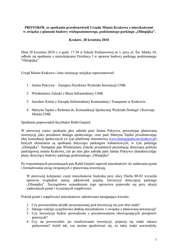 PROTOKÓŁ ze spotkania przedstawicieli Urzędu Miasta Krakowa z mieszkańcami w związku z planami budowy wielopoziomowego, podziemnego parkingu „Olimpijka”. Kraków, 28 kwietnia 2010 Dnia 28 kwietnia 2010 r. o godz. 17.30 w Szkole Podstawowej nr 1, przy ul. Św. Marka 34, odbyło się spotkanie z mieszkańcami Dzielnicy I w sprawie budowy parkingu podziemnego "Olimpijka". Urząd Miasta Krakowa i inne instytucje miejskie reprezentowali: 1. Janina Pokrywa – Zastępca Dyrektora Wydziału Inwestycji UMK 2. Włodzimierz Zaleski z Biura Infrastruktury UMK 3. Jarosław Kielar z Zarządu Infrastruktury Komunalnej i Transportu w Krakowie 4. Martyna Tajduś z Referatu ds. Komunikacji Społecznej Wydziału Strategii i Rozwoju Miasta UMK Spotkanie poprowadził facylitator Rafał Garpiel. W pierwszej części spotkania głos zabrała pani Janina Pokrywa, prezentując planowaną inwestycję jako przedmiot dialogu społecznego, oraz pani Martyna Tajduś przedstawiając ideę konsultacji społecznych (w tym platformę internetową www.dialogspoleczny.krakow.pl) których elementem są spotkania dotyczące parkingów kubaturowych, w tym parkingu „Olimpijka”. Następnie pan Włodzimierz Zaleski przedstawił prezentację dotyczącą polityki parkingowej miasta Krakowa, zaś po nim głos zabrała pani Janina Pokrywa charakteryzując plany dotyczące budowy parkingu podziemnego „Olimpijka”. Po wspomnianych prezentacjach pan Rafał Garpiel zaprosił mieszkańców do zadawania pytań i formułowania uwag związanych z planowaną inwestycją. W pierwszej kolejności część mieszkańców budynku przy ulicy Dietla 80-82 wyraziła sprzeciw względem samej, jakkolwiek pojętej, inwestycji dotyczącej parkingu „Olimpijka”. Szczegółowe uzasadnienie tego sprzeciwu pojawiało się przy okazji zadawanych pytań i wyrażanych wątpliwości. Pośród pytań i wątpliwości mieszkańców odnotowano następujące kwestie: 1. Czy powierzchnia działki przeznaczonej pod inwestycję nie jest zbyt mała? 2. Jakiego rodzaju uciążliwości dotkną mieszkańców z związku z planowaną inwestycją? 3. Czy inwestycja będzie prowadzona z poszanowaniem obowiązujących przepisów prawnych? 4. Czy na powierzchni, po zrealizowaniu inwestycji, pojawią się znaki zakazu parkowania? Jeżeli tak, czy można spodziewać się, że takie znaki zawierałyby 1 adnotację „nie dotyczy mieszkańców”? 5. Jakiego rodzaju rozwiązania parkingowe dla mieszkańców są przewidywane? 6. Cz przy 2-3 kondygnacyjnym wykopie sąsiadujące budynki nie zostaną narażone na uszkodzenia? 7. Czy decyzja o powstaniu parkingu „Olimpijka” jest ostateczna? 8. Jakiego rodzaju korzyści/rekompensaty dla mieszkańców są przewidywane? Czy w ogóle przewiduje się jakiekolwiek? 9. Czy ten teren, jako stare koryto Wisły, nadaje się do realizacji tego rodzaju inwestycji? 10. Czy po 25 latach mieszkania w sąsiedztwie stacji benzynowej mieszkańcy narażeni będą na podobnie uciążliwe sąsiedztwo wjazdu na parking? 11. Jakiego rodzaju rozwiązania dotyczące wyprowadzania spalin z parkingu są przewidywane? 12. Dlaczego, w sytuacji braku szczegółowego planu i koncepcji parkingu, drzewa na terenie planowanej inwestycji zostały wycięte w zeszłym (2009) roku? 13. Czy planowana, ograniczona kubatura obiektów handlowych zlokalizowanych nad podziemnym parkingiem będzie utrzymana? Czy inwestor nie będzie dążył do jej zwiększenia? 14. Biorąc pod uwagę fakt, że w 1972 roku nie udało się (ze względów geologicznych) zlokalizować w tym miejscu przejścia podziemnego, budowa tego parkingu w takim miejscu może okazać się zbyt trudna lub zbyt droga. 15. Jak się ma planowana inwestycja do postulatów decentralizacji i przenoszenia parkingów na obrzeża miasta? Budowa parkingu w centrum miasta stymuluje ruch miast go ograniczać. 16. Czy dookoła placu Na Groblach zlikwidowano miejsca parkingowe dla mieszkańców? 17. Czy polityka parkingowa miasta nie powinna iść w kierunku rozbudowy ekologicznej komunikacji miejskiej zamiast parkingów w centrum miasta? 18. Czy rozwój miasta musi oznaczać degradację terenów zielonych? 19. Czy jeżeli mieszkańcy nie zgodzą się na parking, zostaną pozbawieni zieleni na terenie planowanej inwestycji? 20. Jaki i czy w ogóle będzie dojazd do posesji (mieszkańców budynków przylegających do obszaru planowanej inwestycji)? 21. Czy w związku z planowaną inwestycją wzrosną koszty parkowania dla mieszkańców tego rejonu? 22. Dlaczego miasto nie zrezygnuje z poszukiwania inwestora dla tej inwestycji? 23. Dlaczego nie przeprowadzono stosownych badań geologicznych jako poprzedzających planowanie inwestycji parkingowej? 24. Czy na etapie rozmów z potencjalnym inwestorem jest możliwość negocjowania „widełek” cenowych za parkowanie, jeżeli nie dla wszystkich, to chociaż dla mieszkańców? 25. Jakie pożytki dla miasta miałyby wynikać z realizacji tej inwestycji? 26. Obecnie samochody nie krążą gdy kierowcy poszukują miejsc parkingowych ponieważ od razu widać, że w danym miejscu można lub nie można zaparkować. 27. Kto personalnie wskazał ten teren jako lokalizację planowanego parkingu? 28. Dlaczego miasto wycofało się z koncepcji budowy parkingu pod Halą Targową (lepsza lokalizacja)? 29. Teren ten powinien być zrewitalizowany bez budowy parkingu. 30. Biorąc pod uwagę fakt, że strefy (B) ograniczonego parkowania się rozszerza istnieje niebezpieczeństwo, że parking, po jego wybudowaniu, znajdzie się w strefie. Czy to uczciwe wobec inwestora? Parkingi powinny być sytuowane poza obwodnicą. 31. Jak planowany parking wpłynie na zdrowie mieszkańców okolicznych budynków? 2 32. W Krakowie są zbyt ograniczone możliwości poruszania się bez samochodów w porównaniu do innych miast. Poza tym mieszkańcy zgłaszali zastrzeżenia o charakterze ogólnym: 33. Dlaczego konsultacje w tej sprawie prowadzone są dopiero teraz? 34. Czy zdanie mieszkańców 