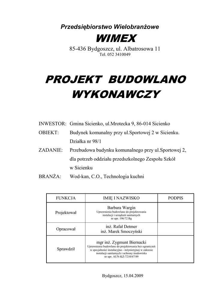 Przedsiębiorstwo WielobranŜowe WIMEX 85-436 Bydgoszcz, ul. Albatrosowa 11 Tel. 052 3410049 PROJEKT BUDOWLANO WYKONAWCZY INWESTOR: Gmina Sicienko, ul.Mrotecka 9, 86-014 Sicienko OBIEKT: Budynek komunalny przy ul.Sportowej 2 w Sicienku. Działka nr 98/1 ZADANIE: Przebudowa budynku komunalnego przy ul.Sportowej 2, dla potrzeb oddziału przedszkolnego Zespołu Szkół w Sicienku BRANśA: Wod-kan, C.O., Technologia kuchni FUNKCJA IMIĘ I NAZWISKO Projektował Uprawnienia budowlane do projektowania instalacji i urządzeń sanitarnych nr upr. 196/72 Bg Barbara Wargin Opracował inŜ. Rafał Detmer inŜ. Marek Smoczyński mgr inŜ. Zygmunt Biernacki Sprawdził Uprawnienia budowlane do projektowania bez ograniczeń w specjalności instalacyjno - inŜynieryjnej w zakresie instalacji sanitarnych i ochrony środowiska nr upr. AUN-KZ-7210/67/89 Bydgoszcz, 15.04.2009 PODPIS ZAWARTOŚĆ TECZKI 1.0. CZĘŚĆ OGÓLNA..........................................................................................................4 1.1. Karta informacyjna ....................................................................................................4 1.2. Podstawa opracowania ............................................................................................4 1.3. Przedmiot opracowania ............................................................................................4 1.4. Lokalizacja .......................................................................................................................4 2.0. CZĘŚĆ SZCZEGÓŁOWA............................................................................................4 2.1. Instalacja wodociągowa .................................................................................................4 2.2. Kanalizacja sanitarna .....................................................................................................6 2.3. Kanalizacja technologiczna ...........................................................................................6 2.4. Technologia kuchni.........................................................................................................7 2.4.1. Program uŜytkowy ...................................................................................................7 2.4.2. Działalność kuchni...................................................................................................7 2.4.3. Blok Ŝywieniowy.......................................................................................................7 2.4.4. Zatrudnienie............................................................................................................10 2.5. Instalacja c.o..................................................................................................................11 2.5.1. Charakterystyka stanu istniejącego...............................................................11 2.5.2. Charakterystyka stanu projektowanego........................................................11 2.6. Roboty ziemne ..............................................................................................................11 2.7. Uwagi końcowe .............................................................................................................12 2.8. Wytyczne materiałowe: ................................................................................................12 INFORMACJA DOTYCZĄCA BEZPIECZEŃSTWA I OCHRONY ZDROWIA............14 II CZĘŚĆ RYSUNKOWA Rys. nr 1 Mapa sytuacyjno wysokościowa Rys. nr 2 Rzut parteru – instalacja wod-kan Rys. nr 3 Rzut piętra – instalacja wod-kan Rys. nr 4 Rozwinięcie kanalizacji technologicznej Rys. nr 5 Rozwinięcie kanalizacji sanitarnej Rys. nr 6 Aksonometria instalacji wodociągowej Rys. nr 7 Rzut parteru – instalacja c.o. Rys. nr 8 Rzut piętra – instalacja c.o. Rys. nr 9 Rozwinięcie instalacji c.o. 1.0. CZĘŚĆ OGÓLNA 1.1. Karta informacyjna Zamawiający: Urząd Gminy w Sicienku, ul. Mrotecka 9, 86-014 Sicienko. Obiekt: Istniejący budynek komunalny przy ul. Sportowej 2 w Sicienku. Zadanie: Przebudowa części budynku z adaptacją pomieszczeń na oddział przedszkola, dla Zespołu Szkół w Sicienku. Instalacje wewnętrzne BranŜa: Technologia kuchni, wod-kan, c.o. 1.2. Podstawa opracowania Podstawę opracowania stanowią: - Zlecenie i umowa zawarta z Zamawiającym, - Wizja lokalna na terenie obiektu, - Inwentaryzacja pomieszczeń, - Mapa sytuacyjno-wysokościowa terenu, - Wypis i wyrys z miejscowego planu zagospodarowania przestrzennego, - Wytyczne Zamawiającego dot. koncepcji przebudowy budynku, - Aktualne normy oraz warunki techniczne projektowania. 1.3. Przedmiot opracowania Przedmiot opracowania stanowi projekt budowlany instalacji wewnętrznych wody zimnej, ciepłej i cyrkulacji oraz kanalizacji sanitarnej i technologicznej oraz projekt technologii kuchni wraz z zapleczem produkcyjno-magazynowym i socjalnym dla potrzeb oddziału przedszkolnego w Sicienku. Celem opracowania jest wyposaŜenie adaptowanych pomieszczeń w zespół urządzeń oraz przyborów i mebli dla potrzeb przygotowywania i wydawania posiłków w oddziale przedszkolnym w Sicienku. 1.4. Lokalizacja Wolnostojący budynek komunalny połoŜony jest na częściowo ogrodzonej działce przy ulicy Sportowej 2, przylegającej równieŜ do ulicy Stawowej. Działka i budynek stanowią własność Gminy Sicienko. Budynek posiada podłączenia do sieci wodociągowej, kanalizacji sanitarnej, kanalizacji deszczowej, sieci gazowej i energetycznej. 2.0. CZĘŚĆ SZCZEGÓŁOWA 2.1. Instalacja wodociągowa Instalację wody zimnej, ciepłej i cyrkulacji włączyć w istniejące rurociągi zgodnie z częścią rysunkową. Na etapie wykonawstwa sprawdzić średnice istniejących rurociągów i ewentualnie przewidzieć zwiększenie ich do średnic projektowanych. Rozprowadzenie przewodów wodociągowych odbywać się będzie częściowo w szachtach instalacyjnych oraz po ścianie. Ciepła woda i cyr