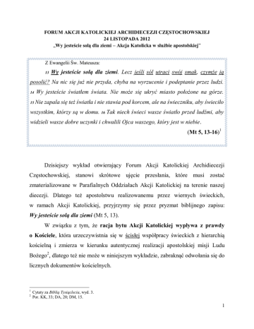 FORUM AKCJI KATOLICKIEJ ARCHIDIECEZJI CZĘSTOCHOWSKIEJ 24 LISTOPADA 2012 „Wy jesteście solą dla ziemi – Akcja Katolicka w służbie apostolskiej” Z Ewangelii Św. Mateusza: 13 Wy jesteście solą dla ziemi. Lecz jeśli sól utraci swój smak, czymże ją posolić? Na nic się już nie przyda, chyba na wyrzucenie i podeptanie przez ludzi. 14 Wy jesteście światłem świata. Nie może się ukryć miasto położone na górze. 15 Nie zapala się też światła i nie stawia pod korcem, ale na świeczniku, aby świeciło wszystkim, którzy są w domu. 16 Tak niech świeci wasze światło przed ludźmi, aby widzieli wasze dobre uczynki i chwalili Ojca waszego, który jest w niebie. (Mt 5, 13-16)1 Dzisiejszy wykład otwierający Forum Akcji Katolickiej Archidiecezji Częstochowskiej, stanowi skrótowe ujęcie przesłania, które musi zostać zmaterializowane w Parafialnych Oddziałach Akcji Katolickiej na terenie naszej diecezji. Dlatego też apostolstwu realizowanemu przez wiernych świeckich, w ramach Akcji Katolickiej, przyjrzymy się przez pryzmat biblijnego zapisu: Wy jesteście solą dla ziemi (Mt 5, 13). W związku z tym, że racja bytu Akcji Katolickiej wypływa z prawdy o Kościele, która urzeczywistnia się w ścisłej współpracy świeckich z hierarchią kościelną i zmierza w kierunku autentycznej realizacji apostolskiej misji Ludu Bożego2, dlatego też nie może w niniejszym wykładzie, zabraknąć odwołania się do licznych dokumentów kościelnych. 1 2 Cytaty za Biblią Tysiąclecia, wyd. 3. Por. KK, 33; DA, 20; DM, 15. 1 Pierwszorzędnie podkreślmy, że już sama konstrukcja zapisu wykładu odsyła nas na obszar teologii biblijnej, żądając przy tym właściwego przedstawienia symboliki soli. Tym samym, w pierwszej kolejności odkrywamy, że termin: sól występuje w Piśmie Świętym zaledwie trzydzieści trzy razy, i jest używany w różnym kontekście3. W istocie jednak, pod symboliką biblijnej soli ukrywa się nieposłuszeństwo oraz błogosławieństwo4. Z dziewiętnastego rozdziału Księgi Rodzaju dowiadujemy się, że Bóg wychodzącemu z Sodomy Lotowi dał następujący zakaz: Nie oglądaj się za siebie i nie zatrzymuj się nigdzie w tej okolicy, ale szukaj schronienia w górach, bo inaczej zginiesz! (Rdz 19,17). Tymczasem żona Lota łamie niniejsze prawo. Za swój brak posłuszeństwa zostaje ukarana i zamieniona w słup soli56. Biblia opisuje ten fakt następująco: żona Lota, która szła za nim, obejrzała się i stała się słupem soli (Rdz 19, 26 ). Tym samym sól staje się symbolem przekleństwa, nieposłuszeństwa i realizowaniem własnych planów. Nowy Testament przywraca symbolice soli jej pierwotny wymiar. Sam Chrystus w Ewangelii św. Marka stwierdza, że: każdy ogniem będzie posolony (Mt 9,49). Ponadto, mówi dalej, że: Dobra jest sól; lecz jeśli sól smak utraci, czymże ją przyprawicie? Miejcie sól w sobie i zachowujcie pokój między sobą! (tamże). W rozumieniu św. Mateusza Apostoła i Ewangelisty, to człowiek wierzący 3 Por. J. Flis, Konkordancja biblijna do Pisma Świętego Starego i Nowego testamentu Biblii Tysiąclecia, Warszawa 1996, s. 1324. 4 Por. P. Achtemeier, Encyklopedia biblijna, przekł. i oprac. merytoryczne P. Pachciarek, Warszawa 1999, s. 1131. 5 Por. Rdz 19, 26 6 12 Mężowie rzekli do Lota: „Kogokolwiek jeszcze masz w tym mieście, zięcia, synów i córki oraz wszystkich bliskich, wyprowadź stąd. 13 Mamy bowiem zamiar zniszczyć to miasto, ponieważ oskarżenie przeciw niemu do Pana tak się wzmogło, że Pan posłał nas, aby je zniszczyć”. 14 Wyszedł więc Lot, aby powiedzieć tym, którzy jako [przyszli] zięciowie mieli wziąć jego córki za żony: „Chodźcie, wyjdźcie z tego miasta, bo Pan ma je zniszczyć!” Oni jednak myśleli, że on żartuje. 15 Gdy już zaczynało świtać, aniołowie przynaglali Lota, mówiąc: „Prędzej, weź żonę i córki, które są przy tobie, abyś nie zginął z winy tego miasta”. 16 Kiedy zaś on zwlekał, mężowie ci chwycili go, jego żonę i dwie córki za ręce - Pan bowiem litował się nad nim - i wyciągnęli ich, i wyprowadzili poza miasto. 17 A gdy ich już wyprowadzili z miasta, rzekł jeden z nich: „Uchodź, abyś ocalił swe życie. Nie oglądaj się za siebie i nie zatrzymuj się nigdzie w tej okolicy, ale szukaj schronienia w górach, bo inaczej zginiesz!” (…) 23 Słońce wzeszło już nad ziemią, gdy Lot przybył do Soaru. 24 A wtedy Pan spuścił na Sodomę i Gomorę deszcz siarki i ognia od Pana „z nieba”. 25 I tak zniszczył te miasta oraz całą okolicę wraz ze wszystkimi mieszkańcami miast, a także roślinność. 26 Żona Lota, która szła za nim, obejrzała się i stała się słupem soli (Rdz 19, 12-17. 23-26 ). 2 w Chrystusa musi być solą dla ziemi7. Tym samym, zwrot: sól dla ziemi (Mt 5,13), przynależy uczniowi Chrystusa, który w sposób wolny i świadomy bierze odpowiedzialność za Kościół i świat 8 . Niniejszą odpowiedzialność za Kościół i świat, w przypadku Akcji Katolickiej, jak i wszystkich świeckich członków Ludu Bożego, realizuje się na mocy sakramentu chrztu i bierzmowania9. Taka okoliczność wymusza dokładne poznanie problematyki Kościoła i świata. Na tym styku działają katolicy świeccy. Tym samym płaszczyzna styczna porządku boskiego i świeckiego przedstawiać się będzie jako bardzo newralgiczne miejsce, na obszarze którego występować będą liczne problemy10. Warto zatem przeprowadzić autentyczną analizę świata i jego problematyki. W niniejszej kwestii skupimy się na wypowiedzi Pawła VI, który podczas audiencji ogólnej, 12 lipca 1967 roku przedstawił posoborowy projekt wznoszenia pomostu łączącego Kościół ze światem współczesnym. Dokonana przez Pawła VI pod koniec lat sześćdziesiątych analiza świata nie tylko zatrważa odbiorcę, ale uświadamia mu aktualność papieskiego przesłania w XXI wieku. W swym nauczaniu Papież stwierdza że: 