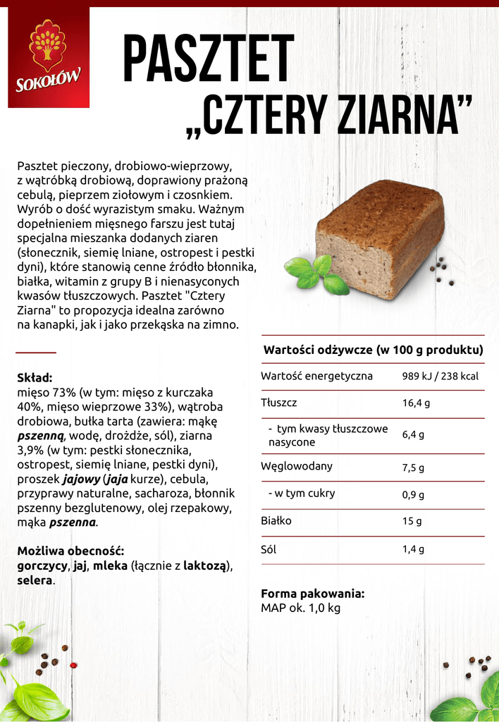 Pasztet pieczony, drobiowo-wieprzowy, z wątróbką drobiową, doprawiony prażoną cebulą, pieprzem ziołowym i czosnkiem. Wyrób o dość wyrazistym smaku. Ważnym dopełnieniem mięsnego farszu jest tutaj specjalna mieszanka dodanych ziaren (słonecznik, siemię lniane, ostropest i pestki dyni), które stanowią cenne źródło błonnika, białka, witamin z grupy B i nienasyconych kwasów tłuszczowych. Pasztet "Cztery Ziarna" to propozycja idealna zarówno na kanapki, jak i jako przekąska na zimno. Wartości odżywcze (w 100 g produktu) Skład: mięso 73% (w tym: mięso z kurczaka 40%, mięso wieprzowe 33%), wątroba drobiowa, bułka tarta (zawiera: mąkę pszenną, wodę, drożdże, sól), ziarna 3,9% (w tym: pestki słonecznika, ostropest, siemię lniane, pestki dyni), proszek jajowy (jaja kurze), cebula, przyprawy naturalne, sacharoza, błonnik pszenny bezglutenowy, olej rzepakowy, mąka pszenna. Wartość energetyczna 989 kJ / 238 kcal Tłuszcz 16,4 g Białko 15 g Możliwa obecność: gorczycy, jaj, mleka (łącznie z laktozą), selera. Sól 1,4 g - tym kwasy tłuszczowe nasycone 6,4 g Węglowodany 7,5 g - w tym cukry 0,9 g Forma pakowania: MAP ok. 1,0 kg