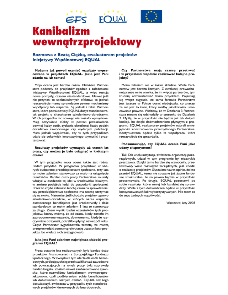 Kanibalizm wewnątrzprojektowy Rozmowa z Beatą Ciężką, ewaluatorem projektów Inicjatywy Wspólnotowej EQUAL Możemy już powoli oceniać rezultaty wypracowane w projektach EQUAL. Jakie jest Pani zdanie na ich temat? Czy Partnerstwa mają szansę przetrwać i w przyszłości wspólnie realizować kolejne projekty? Moja ocena jest bardzo różna. Niektóre Partnerstwa podeszły do projektów zgodnie z założeniami Inicjatywy Wspólnotowej EQUAL, a więc testują nowe pomysły, czasem niestandardowe. Nawet jeśli nie przynosi to spektakularnych efektów, to jednak rzeczywiście mamy sprawdzone pewne mechanizmy współpracy lub wsparcia. Są jednak i takie Partnerstwa, które potraktowały EQUAL dosyć standardowo, jak projekt o charakterze szkoleniowo-doradczym. W ich przypadku nic nowego nie zostało wymyślone. Mają oczywiście efekty w postaci przeszkolenia pewnej liczby osób, zyskania określonej liczby godzin doradztwa zawodowego czy wydanych publikacji. Mam jednak wątpliwości, czy w tych przypadkach udało się cokolwiek innowacyjnego wymyślić i przetestować. Moim zdaniem nie w takim składzie. Wiele Partnerstw jest bardzo licznych. Z ewaluacji prowadzonej przeze mnie wynika, że im więcej partnerów, tym trudniej administrować takim projektem. Pojawiają się wręcz sugestie, że sama formuła Partnerstwa jest jeszcze w Polsce dosyć niedojrzała, co znaczy, że nie jest to twór, który miałby jakiekolwiek umocowanie prawne. Widzimy, że w Działaniu 3 Partnerstwa mocno się odchudziły w stosunku do Działania 2. Myślę, że w przyszłości nie będzie już tak dużych koalicji, bo dzięki doświadczeniom płynącym z programu EQUAL realizatorzy projektów nabrali umiejętności konstruowania przemyślanego Partnerstwa. Kontynuowana będzie tylko ta współpraca, która rzeczywiście się sprawdziła. Rezultaty projektów wymagały aż trzech lat pracy, czy można je było osiągnąć w krótszym czasie? W tym przypadku moja ocena także jest różna. Podam przykład. W przypadku projektów, w których budowano przedsiębiorstwa społeczne, trzy lata to moim zdaniem stanowczo za mało na osiągnięcie rezultatów. Bardzo dużo pracy Partnerstwa musiały włożyć w osadzenie tej idei w środowisku lokalnym, w zmianę podejścia ludzi do gospodarki społecznej. Przez to chyba zabrakło trochę czasu na sprawdzenie, czy przedsiębiorstwo społeczne ma szansę utrzymać się na rynku. Natomiast jeśli chodzi o projekty typowo szkoleniowo-doradcze, w których okres wsparcia ostatecznego beneficjenta jest krótkotrwały i dość standardowy, to moim zdaniem 3 lata to stanowczo za długo. Znam wyniki badań uczestników tych projektów, którzy mówią, że od czasu, kiedy zostało im zaproponowane wsparcie, do momentu, kiedy je rzeczywiście otrzymali, potrafiło upłynąć nawet pół roku. Część Partnerstw sygnalizowała zresztą, że muszą przeprowadzić ponowną rekrutację uczestników projektu, bo wielu z nich zrezygnowało. Jaka jest Pani zdaniem największa słabość programu EQUAL? Przez ostatnie lata realizowanych było bardzo dużo projektów finansowanych z Europejskiego Funduszu Społecznego. W związku z tym oferta dla osób bezrobotnych, próbujących się przekwalifikować zawodowo lub powracających na rynek pracy była naprawdę bardzo bogata. Zostało nawet zaobserwowane zjawisko, które nazwaliśmy kanibalizmem wewnątrzprojektowym, czyli podbieraniem sobie beneficjentów lub dublowaniem różnych działań. EQUAL też tego doświadczył, zwłaszcza w przypadku tych standardowych projektów kierowanych do bezrobotnych. Podsumowując, czy EQUAL ocenia Pani jako udany eksperyment? Tak. Dla wielu instytucji, zwłaszcza organizacji pozarządowych, udział w tym programie był niezwykle prestiżowy. Dzięki temu bardzo się wzmocniły, przetestowały wiele rozwiązań zarządczych, jeśli chodzi o realizację projektów. Słyszałam nawet opinie, że kto przeżył EQUAL, temu nie straszne już żadne fundusze strukturalne. To na pewno będzie w przyszłości procentowało. Po drugie, EQUAL pozostawił po sobie rezultaty, które mniej lub bardziej się sprawdziły. Wiele z tych doświadczeń będzie w przyszłości kontynuowanych lub wykorzystywanych. Nie mam co do tego żadnych wątpliwości. Warszawa, luty 2008