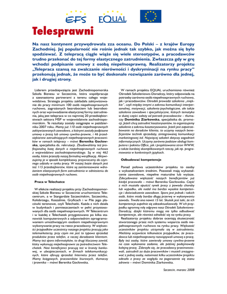 Telesprawni Na nasz kontynent przywędrowała zza oceanu. Do Polski – z krajów Europy Zachodniej. Jej popularność nie rośnie jednak tak szybko, jak można się było spodziewać. Z telepracą ciągle wiąże się wiele stereotypów, a pracodawców trudno przekonać do tej formy elastycznego zatrudnienia. Zwłaszcza gdy w grę wchodzi podpisanie umowy z osobą niepełnosprawną. Realizatorzy projektu „Telepraca szansą na zwalczanie nierówności i dyskryminacji na rynku pracy” przekonują jednak, że może to być doskonałe rozwiązanie zarówno dla jednej, jak i drugiej strony. Liderem przedsięwzięcia jest Zachodniopomorska Szkoła Biznesu w Szczecinie, która współpracuje z szesnastoma partnerami z terenu całego województwa. Strategia projektu zakładała zaktywizowanie do pracy minimum 100 osób niepełnosprawnych ruchowo, zagrożonych bezrobociem lub bezrobotnych oraz wprowadzenie elastycznej formy zatrudnienia, jaką jest telepraca w co najmniej 20 przedsiębiorstwach sektora MŚP w województwie zachodniopomorskim. Te rezultaty zostały osiągnięte w październiku 2007 roku. Mamy już 110 osób niepełnosprawnych zaktywizowanych zawodowo, z którymi zostały podpisane umowy o pracę lub umowy cywilno-prawne, i 46 przedsiębiorstw zatrudniających niepełnosprawnych pracowników w ramach telepracy – mówi Berenika Gocłowska, specjalistka ds. rekrutacji. Zbudowaliśmy też profesjonalną bazę danych o niepełnosprawnych ruchowo z województwa zachodniopomorskiego. Są w niej 462 osoby, które przeszły naszą formalną weryfikację. Aktywizujemy je w sposób kompleksowy, przywracamy do czynnego udziału w rynku pracy. W naszej bazie danych jest też 115 przedsiębiorstw, które są zainteresowane wdrażaniem elastycznych form zatrudnienia w odniesieniu do osób niepełnosprawnych ruchowo. Praca w Telechatce W efekcie realizacji projektu przy Zachodniopomorskiej Szkole Biznesu w Szczecinie uruchomiono Telecentrum, a w Stargardzie Szczecińskim, Szczecinku, Kołobrzegu, Koszalinie, Gryficach i w Pile jego placówki terenowe, czyli Telechatki. Każda z nich działa w budynkach i pomieszczeniach w pełni przystosowanych dla osób niepełnosprawnych. W Telecentrum i w każdej z Telechatek przygotowano po kilka stanowisk komputerowych z odpowiednim oprogramowaniem umożliwiającym osobom niepełnosprawnym wykonywanie pracy na rzecz pracodawcy. W większości przypadków uczestnicy naszego projektu pracują jako telemarketerzy, przy czym nie jest to typowa sprzedaż produktów przez telefon, a raczej doradzanie klientom. Mamy też sporo informatyków, to drugi kluczowy zawód, który wykonują niepełnosprawni za pośrednictwem Telechatek. Nasi beneficjenci pracują też w branży bankowej, w ubezpieczeniach, w firmach telekomunikacyjnych, które oferują sprzedaż Internetu przez telefon. Mamy księgowych, pracowników biurowych, tłumaczy i prawnika – mówi Berenika Gocłowska. W ramach projektu EQUAL uruchomiono również Ośrodek Szkoleniowo-Doradczy, który odpowiada na potrzeby zarówno osób niepełnosprawnych ruchowo, jak i pracodawców. Ośrodek prowadzi szkolenia „miękkie”, czyli między innymi z zakresu komunikacji interpersonalnej, motywacji, szkolenia psychologiczne, ale także szkolenia zawodowe i specjalistyczne, których tematyka w dużej części zależy od potrzeb pracodawców – tłumaczy Dominika Ziarkowska, specjalistka ds. promocji. Jeżeli chcą zatrudnić kosztorysantów, to organizujemy szkolenie z zakresu kosztorysowania. Jeżeli jest zapotrzebowanie na doradców klienta, to uczymy naszych beneficjentów technik sprzedaży, zintegrowanej komunikacji marketingowej itd. Najwięcej szkoleń dotyczy zagadnień informatycznych. Uczymy zarówno podstaw obsługi komputera i pakietu Office, jak i projektowania stron WWW, a także bardziej skomplikowanych rzeczy, jak np. programowania w konkretnych językach. Odbudować kompetencje Ponad połowa uczestników projektu to osoby z wykształceniem średnim. Pozostali mają wykształcenie zawodowe, niepełne maturalne lub wyższe. Zdecydowana większość naszych beneficjentów już kiedyś pracowała – mówi Berenika Gocłowska. Część z nich musiała opuścić rynek pracy z powodu choroby lub wypadku, ale nadal ma bardzo wysokie kompetencje i doświadczenie zawodowe. Sporo jest jednak i takich osób, które miały bardzo długą przerwę w wykonywaniu zawodu. Trwała ona nawet 15 lat. Skutek jest taki, że ich kompetencje zupełnie się zdezaktualizowały. W ich przypadku ogromną rolę odgrywa nasz Ośrodek SzkoleniowoDoradczy, dzięki któremu mogą nie tylko odbudować kompetencje, ale również odnaleźć się na rynku pracy. Realizatorzy projektu dobrze oceniają skuteczność stworzonego przez nich systemu wsparcia osób niepełnosprawnych ruchowo na rynku pracy. Większość uczestników projektu utrzymała się w zatrudnieniu. Mieliśmy oczywiście kilkanaście przypadków, że pracodawca lub niepełnosprawny rozwiązywali umowę o pracę. Były też osoby, które zawierały umowy cywilno-prawne na czas wykonania zadania, ale później podejmowały kolejną pracę. Zdarzyło się, że pracodawcy przeinwestowali, zatrudnili za dużo pracowników i musieli zrezygnować z jednej osoby, natomiast kilku uczestników projektu odeszło z pracy ze względu na pogorszenie się stanu zdrowia – mówi Dominika Ziarkowska. Szczecin, marzec 2008