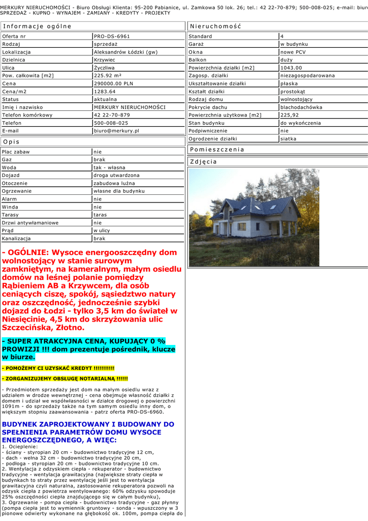 MERKURY NIERUCHOMOŚCI - Biuro Obsługi Klienta: 95-200 Pabianice, ul. Zamkowa 50 lok. 26; tel.: 42 22-70-879; 500-008-025; e-mail: biuro SPRZEDAŻ - KUPNO - WYNAJEM - ZAMIANY - KREDYTY - PROJEKTY Informacje ogólne Nieruchomość Oferta nr PRO-DS-6961 Standard 4 Rodzaj sprzedaż Garaż w budynku Lokalizacja Aleksandrów Łódzki (gw) Okna nowe PCV Dzielnica Krzywiec Balkon duży Ulica Życzliwa Powierzchnia działki [m2] 1043.00 Pow. całkowita [m2] 225.92 m² Zagosp. działki niezagospodarowana Cena 290000.00 PLN Ukształtowanie działki płaska Cena/m2 1283.64 Kształt działki prostokąt Status aktualna Rodzaj domu wolnostojący Imię i nazwisko MERKURY NIERUCHOMOŚCI Pokrycie dachu blachodachówka Telefon komórkowy 42 22-70-879 Powierzchnia użytkowa [m2] 225,92 Telefon 500-008-025 Stan budynku do wykończenia E-mail [email protected] Podpiwniczenie nie Ogrodzenie działki siatka Opis Plac zabaw nie Pomieszczenia Gaz brak Zdjęcia Woda tak - własna Dojazd droga utwardzona Otoczenie zabudowa luźna Ogrzewanie własne dla budynku Alarm nie Winda nie Tarasy taras Drzwi antywłamaniowe nie Prąd w ulicy Kanalizacja brak - OGÓLNIE: Wysoce energooszczędny dom wolnostojący w stanie surowym zamkniętym, na kameralnym, małym osiedlu domów na leśnej polanie pomiędzy Rąbieniem AB a Krzywcem, dla osób ceniących ciszę, spokój, sąsiedztwo natury oraz oszczędność, jednocześnie szybki dojazd do Łodzi - tylko 3,5 km do świateł w Niesięcinie, 4,5 km do skrzyżowania ulic Szczecińska, Złotno. - SUPER ATRAKCYJNA CENA, KUPUJĄCY 0 % PROWIZJI !!! dom prezentuje pośrednik, klucze w biurze. - POMOŻEMY CI UZYSKAĆ KREDYT !!!!!!!!!!! - ZORGANIZUJEMY OBSŁUGĘ NOTARIALNĄ !!!!!! - Przedmiotem sprzedaży jest dom na małym osiedlu wraz z udziałem w drodze wewnętrznej - cena obejmuje własność działki z domem i udział we współwłasności w działce drogowej o powierzchni 1091m - do sprzedaży także na tym samym osiedlu inny dom, o większym stopniu zaawansowania - patrz oferta PRO-DS-6960. BUDYNEK ZAPROJEKTOWANY I BUDOWANY DO SPEŁNIENIA PARAMETRÓW DOMU WYSOCE ENERGOSZCZĘDNEGO, A WIĘC: 1. Ocieplenie: - ściany - styropian 20 cm - budownictwo tradycyjne 12 cm, - dach - wełna 32 cm - budownictwo tradycyjne 20 cm, - podłoga - styropian 20 cm - budownictwo tradycyjne 10 cm. 2. Wentylacja z odzyskiem ciepła - rekuperator - budownictwo tradycyjne - wentylacja grawitacyjna (największe straty ciepła w budynkach to straty przez wentylację jeśli jest to wentylacja grawitacyjna czyli naturalna, zastosowanie rekuperatora pozwoli na odzysk ciepła z powietrza wentylowanego: 60% odzysku spowoduje 25% oszczędności ciepła znajdującego się w całym budynku), 3. Ogrzewanie - pompa ciepła - budownictwo tradycyjne - gaz płynny (pompa ciepła jest to wymiennik gruntowy - sonda - wpuszczony w 3 pionowe odwierty wykonane na głębokość ok. 100m, pompa ciepła do działania potrzebuje energii elektrycznej, pompa zaprojektowana do budynku przy mocy grzewczej 16,8 kW pobiera 3,4 kW co daje wysoki współczynnik efektywności tj. 4,9. Jest to tanie, bezobsługowe i ekologiczne źródło energii. Obok pompy ciepła dodatkowym źródłem energii będzie rekuperator. 4. Instalacje przygotowane do współpracy z inteligentnym systemem zarządzania budynkiem. PRZYBLIŻONE KOSZTY EKSPLOATACYJNE: budynek WYSOCE ENERGOSZCZĘDNY - roczne koszty eksploatacyjne 2.736,85 zł (przy domu wybudowanym w technologii tradycyjnej 10.604,31 zł). Powyższe dane zawarte są w załączniku do projektu budowlanego analizie kosztów budynku wysoce energooszczędnego. - ROK BUDOWY/ODBIÓR TECHNICZNY: pozwolenie na budowę wydane w 2009 r., budowa w trakcie realizacji. - STAN TECHNICZNO-UŻYTKOWY: stan surowy zamknięty ze stolarka okienną i drzwiową, przykryty dachem, woda w budynku, prąd zrobione przyłącze przed budynkiem. - RODZAJ MATERIAŁU BUDOWLANEGO: mury - Porotherm, docieplenie zewnętrzne wełna mineralna 20 cm (ściana od lasu 23m), współczynnik przenikania 0,15 [W/m²K] - OKNA/DRZWI: PCV, nowego typu firmy DRUTEX, współczynnik przenikania 0,78 - 1,03 [W/m²K], okna dachowe połaciowe współczynnik przenikania U = 1,1 [W/m²K], - PODŁOGA: na gruncie, ocieplona warstwą styropianu 20 cm, współczynnik przenikania ciepła 0,16 [W/m²K] - ZEWNĘTRZNE WYKOŃCZENIE BUDYNKU: tynk tradycyjny + planowane elementy drewniane - MEDIA/INSTALACJE: prąd, woda, ogrzewanie własne w projekcie pompy ciepła, - ZABEZPIECZENIA/SYSTEMY ALARMOWE: w projekcie instalacja alarmowa przygotowana do podłączenia do monitoringu - STANDARD WYKOŃCZEŃ: stan surowy zamknięty ze stolarka okienną i drzwiową, przykryty dachem z dachówka betonową. - UWAGA: szacunkowy łączny koszt doprowadzenia budynku do typowego standardu deweloperskiego nie więcej niż 180-200 tyś. zł, dopuszczalna jest opcja wykończenia budynku także pod klucz po ustaleniu ceny końcowej oraz szczegółowego zakresu robót do wykonania przez Sprzedającego. - OPIS KONDYGNACJI - szczegółowa dokumentacja budowlana w biurze wraz z rzutami kondygnacji, - PARTER: łączna powierzchnia 117,04m, w tym: wiatrołap, 3,99m, hol 14,90m, salon z jadalnią 29,07m, kuchnia 13,46m, gabinet 13,29m, garaż 25,16m, wc 3,78m, pomieszczenie techniczne 7,58m, klatka schodowa 5,81m. - PIĘTRO: łączna powierzchnia 108,88m, w tym: hol 14,91m, sypialnia 19,49m z garderobą 4,37m, łazienka z wc 10,18m, 3 pokoje 19,19m, 15,53m, 9,46m, gabinet 15,73m, - GARAŻ: na 1 samochód, brama uchylna na pilota, - INNE ZABUDOWANIA: brak, - ZAGOSPODAROWANIE DZIAŁKI/NASADZENIA: brak, część działki o szerokości ok. 4-4,5m zajmuje las, - OGRODZENIE/BRAMA: siatka stalowa w elementach, - OTOCZENIE/STAN ZURBANIZOWANIA: duża polana w lesie, którą część od strony południowej zajmuje działka z tworzącym się nowym osiedlem 8 domów wolnostojących, obecnie wybudowane 2 domy na działkach bezpośrednio przy drodze dojazdowej, w sąsiedztwie w promieniu 500m nowe dom