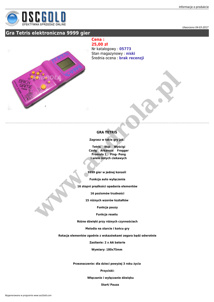 Informacje o produkcie Utworzono 04-03-2017 Gra Tetris elektroniczna 9999 gier Cena : 25,00 zł ro la .p l Nr katalogowy : 05773 Stan magazynowy : niski Średnia ocena : brak recenzji GRA TETRIS nd Zagrasz w takie gry jak: w .a Tetris Wąż Wyścigi Czołg Arkanoid Frogger Fromuła 1 Ping- Pong i wiele innych ciekawych 9999 gier w jednej konsoli Funkcja auto wyłączenia w w 16 stopni prędkości opadania elementów 16 poziomów trudności 15 różnych wzorów kształtów Funkcja pauzy Funkcja resetu Różne dźwięki przy różnych czynnościach Melodia na starcie i końcu gry Rotacja elementów zgodnie z wskazówkami zegara bądź odwrotnie Zasilanie: 2 x AA baterie Wymiary: 180x75mm Przeznaczenie: dla dzieci powyżej 3 roku życia Przyciski: Włączanie i wyłączanie dźwięku Start/ Pauza Wygenerowano w programie www.oscGold.com Reset Włącznik ON/ OFF 4 Klawisze Nawigacyjne Klawisz rotacji Stan: Nowy w w w .a nd ro la .p l Opakowanie: Folia