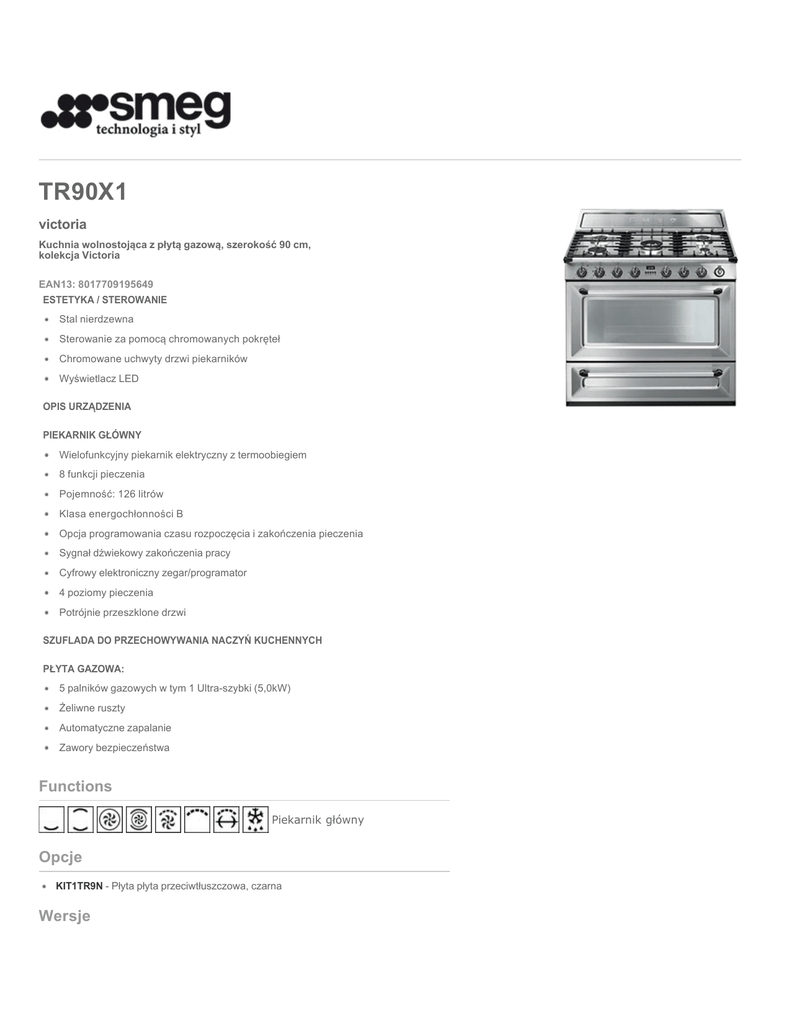 TR90X1 victoria Kuchnia wolnostojąca z płytą gazową, szerokość 90 cm, kolekcja Victoria EAN13: 8017709195649 ESTETYKA / STEROWANIE Stal nierdzewna Sterowanie za pomocą chromowanych pokręteł Chromowane uchwyty drzwi piekarników Wyświetlacz LED OPIS URZĄDZENIA PIEKARNIK GŁÓWNY Wielofunkcyjny piekarnik elektryczny z termoobiegiem 8 funkcji pieczenia Pojemność: 126 litrów Klasa energochłonności B Opcja programowania czasu rozpoczęcia i zakończenia pieczenia Sygnał dźwiekowy zakończenia pracy Cyfrowy elektroniczny zegar/programator 4 poziomy pieczenia Potrójnie przeszklone drzwi SZUFLADA DO PRZECHOWYWANIA NACZYŃ KUCHENNYCH PŁYTA GAZOWA: 5 palników gazowych w tym 1 Ultra-szybki (5,0kW) Żeliwne ruszty Automatyczne zapalanie Zawory bezpieczeństwa Functions Piekarnik główny Opcje KIT1TR9N - Płyta płyta przeciwtłuszczowa, czarna Wersje TR90P1 - kremowy Smeg Polska Sp. z o.o. ul. Cybernetyki 9 02-677 Warszawa Tel. +48 22 276 14 00 TR90X1 victoria wolnostojące 90 cm stal nierdzewna rodzaj płyty kuchennej: gazowa rodzaj piekarnika: elektryczny klasa energochłonności B Piekarnik główny GRZAŁKA DOLNA: Funkcja ta jest najbardziej odpowiednia do przygotowania potraw wymagających wysokiej temepratury od spodu, bez potrzeby przypiekania lub do powolnego pieczenia. Do ciast, pizzy, potrawek, lub zapiekanek. GRZAŁKA GÓRNA I DOLNA: Włączenie tych 2 grzałek stosuje się w pieczeniu tradycyjnym, odpowiednim do przygotowanie potraw wymagających delikatnego podgrzewania, jak np. pieczenie ciasta. Piekarnik powinien zostać wstępnie nagrzany do wymaganej temperatury, a naczynie ustawione po środku. Jest to metoda , która najlepiej sprawdza się w przypadku większych, pojedynczych wypieków. WENTYLATOR, GRZAŁKA PIERŚCIENIOWA: Grzałka w połączeniu z wentylatorem zapewniają równomierną temperaturę w całej komorze, na wszystkich półkach. Podczas pieczenia potraw ponad 20 minut, niepotrzebne jest stosowanie wstepnego rozgrzania piekarnika. Jest to metoda dająca oszczędność energii, kótszy czas podgrzewania. idealna do odgrzewania zimnych potraw. WENTYLATOR, GRZAŁKA PIERŚCIENIOWA, GÓRNA I DOLNA: Grzałki w połączeniu z wentylatorem zapewniają równomierną temperaturę w całej komorze, na wszystkich półkach. Jest to metoda dająca podobne efekty do pieczenia na rożnie, poruszając powietrze wokół potrawy zamiast poruszać potrawą. WENTYLATOR I GRZAŁKA GRILLA: Pieczenie przy uzyciu tej funkcji musi przebiegać przy zamkniętych drzwiczkach. Wentylator łagodzi silne grzanie grilla, jednocześnie zapewniając doskonałe grillowanie bez potrzeby odwracania pieczonej potrawy. Otrzymujemy potrawę doskonale przypieczoną, a zarazem soczystą. Najlepsze efekty zapewnia pieczenie na dwóch górnych półkach. Dolna część piekarnika może być w tym czasie wykorzystana do podgrzania innych potraw. GRZAŁKA GRILLA: Funkcja uzywana do szybkiego podgrzewania. Aby uzyskać najlepsze rezultaty należy małe potrawy umieścić na górnej półce, a potrawy większe - na dolnej (np. mięso, lub kiełbasę). Najlepsze efekty uzyskuje się przy zamkniętych drzwiczkach, chyba że przepis podpowiada co innego. ROŻEN ORAZ GRZAŁKA GRILLA: Ten symbol pozwala na wybranie funkcji rożna z całą grzałką grilla. ROZMRAŻANIE: Po wybraniu tej funkcji, urządzenie wyłacza grzałki nawet wtedy jeśli jest nastawiony termostat. Smeg Polska Sp. z o.o. ul. Cybernetyki 9 02-677 Warszawa Tel. +48 22 276 14 00 TR90X1 victoria wolnostojące 90 cm stal nierdzewna rodzaj płyty kuchennej: gazowa rodzaj piekarnika: elektryczny klasa energochłonności B Smeg Polska Sp. z o.o. ul. Cybernetyki 9 02-677 Warszawa Tel. +48 22 276 14 00