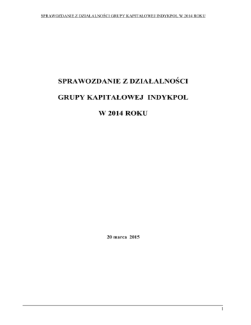 SPRAWOZDANIE Z DZIAŁALNOŚCI GRUPY KAPITAŁOWEJ INDYKPOL W 2014 ROKU SPRAWOZDANIE Z DZIAŁALNOŚCI GRUPY KAPITAŁOWEJ INDYKPOL W 2014 ROKU 20 marca 2015 1 SPRAWOZDANIE Z DZIAŁALNOŚCI GRUPY KAPITAŁOWEJ INDYKPOL W 2014 ROKU 1) Opis organizacji Grupy Kapitałowej Emitenta .............................................................................. 3 2) Charakterystyka struktury aktywów i pasywów skonsolidowanego bilansu ................................ 4 3) Podstawowe Informacje o podmiocie dominującym.................................................................... 5 4) Informacje o kapitale zakładowym podmiotu dominujacego........................................................ 5 5) Władze podmiotu dominującego ................................................................................................... 6 6) Ważniejsze zdarzenia .................................................................................................................... 7 7) Opis struktury głównych lokat kapitałowych lub głównych inwestycji kapitałowych ................. 8 8) Charakterystyka polityki w zakresie kierunków rozwoju grupy kapitałowej emitenta; ............... 8 9) Opis istotnych pozycji pozabilansowych ...................................................................................... 9 10) Czynniki ryzyka i zagrożenia. ..................................................................................................... 9 11) Główne cechy stosowanych w Indykpol SA systemów kontroli wewnętrznej i zarządzania ..... 9 12) Informacje o podstawowych produktach, towarach lub usługach ............................................... 9 13) Informacje o rynkach zbytu ....................................................................................................... 10 14) Informacja o źródła zaopatrzenia w materiały do produkcji, w towary i usługi ....................... 11 15) Informacje o zawartych umowach znaczących dla działalności emitenta ................................ 12 16) Informacje o umowach kredytów i pożyczek; ........................................................................... 15 17) Informacje o udzielonych w danym roku obrotowym pożyczkach ........................................... 15 18) Informacje o poręczeniach i gwarancjach, ................................................................................ 15 19) Opis wykorzystania przez emitenta wpływów z emisji............................................................. 15 20) Objaśnienie różnic pomiędzy wynikami finansowymi wykazanymi w raporcie rocznym a wcześniej publikowanymi prognozami wyników ............................................................................ 15 21) Ocena, zarządzania zasobami finansowymi .............................................................................. 15 22) Ocena możliwości realizacji zamierzeń inwestycyjnych .......................................................... 16 23) Ocena czynników i nietypowych zdarzeń mających wpływ na wynik z działalności .............. 16 24) Charakterystyka zewnętrznych i wewnętrznych czynników istotnych dla rozwoju przedsiębiorstwa .............................................................................................................................. 16 25) Zmiany w podstawowych zasadach zarządzania przedsiębiorstwem emitenta i jego grupą kapitałową; ....................................................................................................................................... 18 26) Umowy między emitentem a osobami zarządzającymi ............................................................ 18 27) Informacja o wynagrodzeniach ................................................................................................ 18 28) Akcje (udziały) emitenta oraz w jednostkach powiązanych emitenta, będących w posiadaniu osób zarządzających i nadzorujących .............................................................................................. 18 29) Zmiany w proporcjach posiadanych akcji przez dotychczasowych akcjonariuszy i obligatariuszy; .................................................................................................................................. 19 30) Polityka zatrudnienia ................................................................................................................. 19 31) Informacje o systemie kontroli programów akcji pracowniczych. ............................................ 20 32) Inwestycje proekologiczne ........................................................................................................ 20 33) Działania prospołeczne .............................................................................................................. 20 34) Umowa zawarta z podmiotem uprawionym do badania sprawozdań finansowych. ................. 21 35) Oświadczenia o rzetelności sprawozdania i wyboru audytora .................................................. 21 2 SPRAWOZDANIE Z DZIAŁALNOŚCI GRUPY KAPITAŁOWEJ INDYKPOL W 2014 ROKU 1) Opis organizacji Grupy Kapitałowej Emitenta Na koniec 2014 roku Grupa Kapitałowa Indykpol liczyła osiem podmiotów w tym siedem polskich spółek i jeden podmiot zagraniczny. Podmiot dominujący – Indykpol S.A. a) Spółki zależne polskie: Lubuskie Zakłady Drobiarskie „Eldrob” S.A. z siedzibą w Świebodzinie (99,00%) Nutripol Sp. z o.o. (100,00%) „Indykpol Brand Management” Sp. z o.o. Sp.k. z siedzibą w Warszawie (99,99%) „Indykpol Brand Management” Sp. z o.o. z siedzibą w Warszawie (100,00%) „Ozkom” Sp. z o.o. z siedzibą w Olsztynie (100,00%) b) Spółki zależne zagraniczne: Wołżańskie Delikatesy” Sp. z o. o. - z siedzibą w Wierchniem Usłonie w Republice Tatarstan (Federacja Rosyjska) (100,00%) c) Filie: Filia w Lublinie Ośrodek Hodowli Indyków Frednowy Filarem Grupy jest spółka Indykpol S.A., która jako inwestor strategiczny p