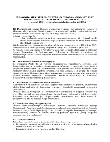 SPRAWOZDANIE Z REALIZACJI DZIAŁAŃ OŚRODKA AGRO-INFO PRZY BIŁGORAJSKIEJ AGENCJI ROZWOJU REGIONALNEGO SA II – gi kwartał 2005 ( według planu działania ośrodka na 2005r). III. Diagnozowanie potrzeb klientów prowadzimy w czasie indywidualnych rozmów z klientami odwiedzającymi Ośrodek, podczas okazjonalnych spotkań z mieszkańcami wsi, przedstawicielami samorządów (np. szkolenia, targi handlowe lokalne) Z badań tych wynika, że: - rolnicy najbardziej zainteresowani są programami pomocowymi, z których środki można przeznaczyć na inwestycje w gospodarstwach rolnych, na zakup ziemi, pomoc dla młodych rolników etc. Wiedzę o potrzebach informacyjnych mieszkańców wsi czerpiemy też z publikacji np. GUS, ośrodków badania opinii społecznej, Instytutu Rozwoju Wsi i Rolnictwa, prasy etc. W ramach dobrej współpracy z Powiatowym Zespołem Doradztwa Rolniczego i oddziałem Agencji Modernizacji i Restrukturyzacji Rolnictwa w Biłgoraju wymieniamy na bieżąco uwagi i doświadczenia dotyczące zapotrzebowania mieszkańców wsi na określone rodzaje usług. IV. Uświadamianie potrzeb informacyjnych Po wstąpieniu Polski do UE wzrosło zainteresowanie mieszkańców sprawami Unii Europejskiej. Jest to wynikiem przekazywanych informacji o możliwości korzystania z programów pomocowych UE. Uświadamianiu tych potrzeb służą ulotki, biuletyny, które rozdajemy indywidualnie klientom odwiedzającym nasz Ośrodek. W II kwartale br rozdano ponad 200 ulotek i broszur. Są to ulotki opracowane przez nasz ośrodek oraz otrzymane z Urzędu Komitetu Integracji Europejskiej, Funduszu Współpracy w Warszawie, Regionalnych Centrów Informacji Europejskiej. V. Inspirowanie /aktywizowanie mieszkańców wsi Aktywizowaniu mieszkańców wsi służą organizowane spotkania w gminach, kolportowane ulotki, które zachęcają do korzystania z porad i konsultacji dotyczących programów pomocowych. Ośrodek nasz we współpracy z Towarzystwem Gospodarczym w Biłgoraju utworzył we wszystkich gminach powiatu biłgorajskiego Gminne Punkty Informacji o Unii Europejskiej. Zadaniem tych Punktów jest aktywizowanie mieszkańców wsi, inspirowanie do podejmowania działań na rzecz swojej społeczności. VI. Współpraca z innymi organizacjami Ośrodek ściśle współpracuje z Powiatowym Zespołem Doradztwa Rolniczego, Agencją Modernizacji i Restrukturyzacji Rolnictwa, samorządami, innymi organizacjami jak Fundacja Fundusz Lokalny Ziemi Biłgorajskiej, Klub „Leśnik” , Leżąjskie Stowarzyszenie Rozwoju, Współpracujemy również w ramach lubelskiej podsieci Agro-Info (mamy podpisane porozumienia na tę okoliczność). VII. Działania ośrodka 1. Przekazywanie informacji o działaniach Ośrodka odbywa się poprzez: - bezpośrednie rozmowy indywidualne z klientami w ośrodku ( w tym czasie około ośrodek odwiedziło ponad 50 klientów - kolportaż ulotek i broszur ( rozdano około 500 ulotek) - informacje o programach zamieszczano za pośrednictwem Punktów informacji o we wszystich gminach powiatu biłgorajskiego przekazano około 200 ulotek do szkół ponadpodstawowych Wydawnictwa Zainteresowani klienci odwiedzający nasz ośrodek otrzymują za niewielką odpłatnością ( 10 zł) przewodnik „100 pomysłów na działalność gospodarczą”. Przewodniki te wysyłamy również za zaliczeniem pocztowym. W II kwartale ponad 10 klientów zakupiło przewodnik. 3. Szkolenia W II-gim kwartale br. z uwagi na prace polowe nie były planowane szkolenia. Po przeprowadzeniu cyklu szkoleń w I-szym kwartale, w których wzięło udział ponad 800 osób ( mieszkańcy obszarów wiejskich). Kolejne szkolenia zaplanowane są na okres październik – grudzień. 4.Konsultacje, doradztwo Każdy klient zgłaszający się do ośrodka otrzymuje pomoc. W sytuacji, gdy jest potrzebna bardziej złożona i specjalistyczna porada, wtedy uzgadniamy termin ponownego spotkania lub przekazanie informacji telefonicznie, po dokładnym rozpoznaniu problemu. Z indywidualnych porad i konsultacji skorzystało w tym czasie około 100 klientów. VIII. Formy promocji ośrodka Efektywne wykonanie zadań jest w dużym stopniu uzależnione od działań promocyjnych. W tym celu: • przed siedzibą umieszczono tablicę informacyjną o Ośrodku Agro-Info • przekazywano informacje o działalności ośrodka podczas spotkań w naszej instytucji, współpracującym z Ośrodkiem Towarzystwem Gospodarczym, Fundacją Fundusz Lokalny Ziemi Biłgorajskiej, podczas okolicznościowych wydarzeń • zamieszczono w Lokalnej Telewizji Kablowej informacje na temat prowadzonych działań w naszym Ośrodku, z jednoczesnym zaproszeniem do korzystania ze szkoleń, porad i informacji. Tą drogą informacja dotarła do około 20 tys. osób, odbiorców telewizji lokalnej. • zamieszczona jest informacja o Ośrodku na stronie internetowej • w budynku „Centrum Informacji i Obsługi Biznesu w Biłgoraju, w którym znajduje się siedziba Ośrodka umieszczono dużą tablicę z informacjami skierowanymi do mieszkańców obszarów wiejskich. Informacje te są na bieżąco aktualizowane. • w siedzibie Ośrodka znajduje się gablota z wyłożonymi dla klientów ulotkami • udzielono 2-ch wywiadów radiowych IX. Tworzenie własnej bazy informacyjnej - Na bieżąco uzupełniane są zasoby biblioteczne w publikacje, książki, biuletyny, publikacje multimedialne, pakiety informacyjne zawierające kompendium wiedzy o UE, a w szczególności dotyczące przedsiębiorczości, rozwoju regionalnego, funduszy strukturalnych. Korzystamy ponadto z bogatych zasobów internetowych takich instytucji jak Ministerstwa, Urząd Marszałkowski, Agencje Rolnicze, Fundusz Współpracy inne instytucje zajmujące się problematyką UE i rolnictwa. X. Tworzenie własnej sieci Współpracujemy nie tylko w ramach ogólnopolskiej Sieci Agro-Info, ale także podsieci woj. lubelskiego, w ramach której dzielimy się doświadczeniem, przekazujemy informacje, udzielamy pomocy doradczej i 
