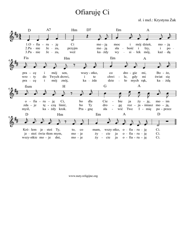 Ofiaruję Ci sł. i mel.: Krystyna Żak A7 4 D 1.O 2.Pa 3.Pa 4 ję zu, zu, Em Ci przyjm weź mo ją mo ją ka żdy cę ty cę i mój sen, do Twych drzwi, i mój znój, wszy stko, i te ka żde A moc sła wy i mój dzień, bość i łzy, si łek mój, Em A co chwi dzie dro gie mi, le, gdy mi ło mych rąk, Hm mo i każ ją po dą Bo że, świat się ka żdą A G H fism o fia zda je myśl, 8 ru Je Je Fis pra wro pra 6 fia nie nie D7 Hm D ru tę ka ję Ci, czą lśnić, żdy krok. bo bo Pra Cie dro sła Em Hm Kró lem je steś Ty, je steś świa tłem mym, wszy stkie mo je dni, dla Ty gnę to, co mo je mo je bie ja gę roz wić Twe D A mam, wszy stko, o ży cie ja o ży cie ja o www.nuty.religijne.org ży ję, mo im ja śniasz mo ją, I mię po przez fia ru fia ru fia ru ję ję ję Ci. Ci. Ci.