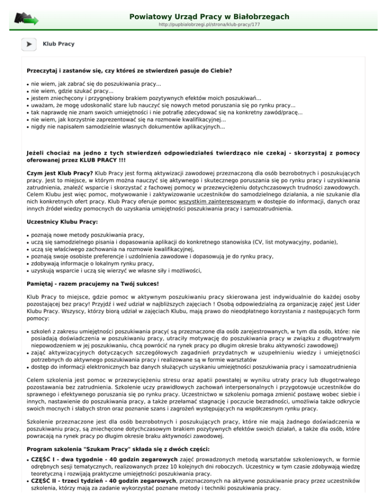 Powiatowy Urząd Pracy w Białobrzegach http://pupbialobrzegi.pl/strona/klub-pracy/177 Klub Pracy Przeczytaj i zastanów się, czy któreś ze stwierdzeń pasuje do Ciebie? ● ● ● ● ● ● ● nie wiem, jak zabrać się do poszukiwania pracy... nie wiem, gdzie szukać pracy... jestem zniechęcony i przygnębiony brakiem pozytywnych efektów moich poszukiwań... uważam, że mogę udoskonalić stare lub nauczyć się nowych metod poruszania się po rynku pracy... tak naprawdę nie znam swoich umiejętności i nie potrafię zdecydować się na konkretny zawód/pracę... nie wiem, jak korzystnie zaprezentować się na rozmowie kwalifikacyjnej... nigdy nie napisałem samodzielnie własnych dokumentów aplikacyjnych... Jeżeli chociaż na jedno z tych stwierdzeń odpowiedziałeś twierdząco nie czekaj - skorzystaj z pomocy oferowanej przez KLUB PRACY !!! Czym jest Klub Pracy? Klub Pracy jest formą aktywizacji zawodowej przeznaczoną dla osób bezrobotnych i poszukujących pracy. Jest to miejsce, w którym można nauczyć się aktywnego i skutecznego poruszania się po rynku pracy i uzyskiwania zatrudnienia, znaleźć wsparcie i skorzystać z fachowej pomocy w przezwyciężeniu dotychczasowych trudności zawodowych. Celem Klubu jest więc pomoc, motywowanie i zaktywizowanie uczestników do samodzielnego działania, a nie szukanie dla nich konkretnych ofert pracy. Klub Pracy oferuje pomoc wszystkim zainteresowanym w dostępie do informacji, danych oraz innych źródeł wiedzy pomocnych do uzyskania umiejętności poszukiwania pracy i samozatrudnienia. Uczestnicy Klubu Pracy: ● ● ● ● ● ● poznają nowe metody poszukiwania pracy, uczą się samodzielnego pisania i dopasowania aplikacji do konkretnego stanowiska (CV, list motywacyjny, podanie), uczą się właściwego zachowania na rozmowie kwalifikacyjnej, poznają swoje osobiste preferencje i uzdolnienia zawodowe i dopasowują je do rynku pracy, zdobywają informacje o lokalnym rynku pracy, uzyskują wsparcie i uczą się wierzyć we własne siły i możliwości, Pamiętaj - razem pracujemy na Twój sukces! Klub Pracy to miejsce, gdzie pomoc w aktywnym poszukiwaniu pracy skierowana jest indywidualnie do każdej osoby pozostającej bez pracy! Przyjdź i weź udział w najbliższych zajęciach ! Osobą odpowiedzialną za organizację zajęć jest Lider Klubu Pracy. Wszyscy, którzy biorą udział w zajęciach Klubu, mają prawo do nieodpłatnego korzystania z następujących form pomocy: ● ● ● szkoleń z zakresu umiejętności poszukiwania pracy( są przeznaczone dla osób zarejestrowanych, w tym dla osób, które: nie posiadają doświadczenia w poszukiwaniu pracy, utraciły motywację do poszukiwania pracy w związku z długotrwałym niepowodzeniem w jej poszukiwaniu, chcą powrócić na rynek pracy po długim okresie braku aktywności zawodowej) zająć aktywizacyjnych dotyczących szczegółowych zagadnień przydatnych w uzupełnieniu wiedzy i umiejętności potrzebnych do aktywnego poszukiwania pracy i realizowane są w formie warsztatów dostęp do informacji elektronicznych baz danych służących uzyskaniu umiejętności poszukiwania pracy i samozatrudnienia Celem szkolenia jest pomoc w przezwyciężeniu stresu oraz apatii powstałej w wyniku utraty pracy lub długotrwałego pozostawania bez zatrudnienia. Szkolenie uczy prawidłowych zachowań interpersonalnych i przygotowuje uczestników do sprawnego i efektywnego poruszania się po rynku pracy. Uczestnictwo w szkoleniu pomaga zmienić postawę wobec siebie i innych, nastawienie do poszukiwania pracy, a także przełamać stagnację i poczucie bezradności, umożliwia także odkrycie swoich mocnych i słabych stron oraz poznanie szans i zagrożeń występujących na współczesnym rynku pracy. Szkolenie przeznaczone jest dla osób bezrobotnych i poszukujących pracy, które nie mają żadnego doświadczenia w poszukiwaniu pracy, są zniechęcone dotychczasowym brakiem pozytywnych efektów swoich działań, a także dla osób, które powracają na rynek pracy po długim okresie braku aktywności zawodowej. Program szkolenia "Szukam Pracy" składa się z dwóch części: ● ● CZĘŚĆ I - dwa tygodnie - 40 godzin zegarowych zajęć prowadzonych metodą warsztatów szkoleniowych, w formie odrębnych sesji tematycznych, realizowanych przez 10 kolejnych dni roboczych. Uczestnicy w tym czasie zdobywają wiedzę teoretyczną i rozwijają praktyczne umiejętności poszukiwania pracy. CZĘŚĆ II - trzeci tydzień - 40 godzin zegarowych, przeznaczonych na aktywne poszukiwanie pracy przez uczestników szkolenia, którzy mają za zadanie wykorzystać poznane metody i techniki poszukiwania pracy. W trakcie zajęć wykorzystywane są aktywne i nowoczesne metody dydaktyczne (wykład, ćwiczenia, testy, dyskusje, praca grupowa, odgrywanie ról, prezentacje indywidualne), różnorodne materiały edukacyjne oraz środki i urządzenia multimedialne. Tematyka sesji szkoleniowych obejmuje: ● ● ● ● ● ● ● ● ● ● ● ● ● ● ● Metody nauki stosowane podczas szkolenia; Reakcje w trudnych sytuacjach; Kompetencje i predyspozycje zawodowe; Bariery na drodze do zatrudnienia; Zarządzanie sobą podczas poszukiwania zatrudnienia; Analiza rynku pracy; Formy zatrudnienia; Wizytówka zawodowa – dokumenty aplikacyjne; Sztuka mówienia i prezentacji; Zachowania asertywne w poszukiwaniu pracy; Oferty na rynku pracy; Przygotowanie do rozmowy z pracodawcą; Rozmowa kwalifikacyjna; Edukacja na rynku pracy; Plan poszukiwania pracy; Uprawnienia osób w okresie odbywania szkolenia: ● ● Osobom posiadającym status osoby bezrobotnej podczas trwania szkolenia przysługuje stypendium szkoleniowe w wysokości określonej ustawą. Osoby, które ukończą szkolenie otrzymają stosowne zaświadczenie o jego ukończeniu. ZAPRASZAMY !!! Osoby zainteresowane mogą uzyskać wszelkie informacje w Klubie Pracy w Powiatowy Urząd Pracy w Białobrzegach w pok. 17 oraz pod numerem telef