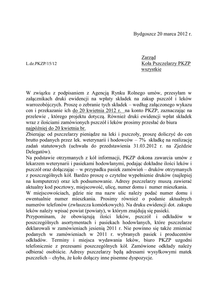 Bydgoszcz 20 marca 2012 r. L.dz.PKZP/15/12 Zarząd Koła Pszczelarzy PKZP wszystkie W związku z podpisaniem z Agencją Rynku Rolnego umów, przesyłam w załącznikach druki ewidencji na wpłaty składek na zakup pszczół i leków warrozobójczych. Proszę o zebranie tych składek – według załączonego wykazu cen i przekazanie ich do 20 kwietnia 2012 r. na konto PKZP, zaznaczając na przelewie , którego projektu dotyczą. Również druki ewidencji wpłat składek wraz z ilościami zamówionych pszczół i leków prosimy przesłać do biura najpóźniej do 20 kwietnia br. Zbierając od pszczelarzy pieniądze na leki i pszczoły, proszę doliczyć do cen brutto podanych przez lek. weterynarii i hodowców – 7% składkę na realizację zadań statutowych (uchwała do przedstawienia 31.03.2012 r. na Zjeździe Delegatów). Na podstawie otrzymanych z kół informacji, PKZP dokona zawarcia umów z lekarzem weterynarii i pasiekami hodowlanymi, podając dokładne ilości leków i pszczół oraz dołączając – w przypadku pasiek zamówień – druków otrzymanych z poszczególnych kół. Bardzo proszę o czytelne wypełnienie druków (najlepiej na komputerze) oraz ich podsumowanie. Adresy pszczelarzy muszą zawierać aktualny kod pocztowy, miejscowość, ulicę, numer domu i numer mieszkania. W miejscowościach, gdzie nie ma nazw ulic należy podać numer domu i ewentualnie numer mieszkania. Prosimy również o podanie aktualnych numerów telefonów (zwłaszcza komórkowych). Na druku ewidencji dot. zakupu leków należy wpisać powiat (powiaty), w którym znajdują się pasieki. Przypominam, że obowiązują ilości leków, pszczół i odkładów w poszczególnych asortymentach i pasiekach hodowlanych, które pszczelarze deklarowali w zamówieniach jesienią 2011 r. Nie powinno się także zmieniać podanych w zamówieniach w 2011 r. wybranych pasiek i producentów odkładów. Terminy i miejsca wydawania leków, biuro PKZP uzgodni telefonicznie z prezesami poszczególnych kół. Zamówione odkłady należy odbierać osobiście. Adresy pszczelarzy będą adresami wysyłkowymi matek pszczelich – chyba, że koło dołączy inne pisemne dyspozycje. Informacje dodatkowe: 1. Zarząd PKZP na posiedzeniu w dniu 13 marca br zdecydował, że pszczelarze zrzeszeni w naszym związku nie muszą w bieżącym roku zbierać próbek osypów. 2. Przypominam pszczelarzom, że zgodnie z wymogami ARR, nie można w tym sezonie otrzymać więcej matek i odkładów pszczelich łącznie, niż 50% liczby posiadanych przez pszczelarza rodzin pszczelich. 3. Wzorem ubiegłego roku prosimy, aby przy wpłatach składek na leki i matki, dokonać także wpłaty 7% składki na realizację zadań statutowych wynikającej z ilości zamówionych leków, matek i odkładów przez członków danego koła. Zwracamy szczególną uwagę na czytelny zapis na przelewach. Przykład takiego zapisu: 7% składka na realizację zadań statutowych – 1245,30 zł (leki), 7% składka na realizację zadań statutowych – 1759,27 zł (pszczoły). 4. Przypominam, że składki członkowskie i ulowe wpłacamy do 30 kwietnia br W opisie na przelewie proszę podać, które koło, za ilu członków i pni przekazuje składkę. Przykład zapisu: wpłata składek: członkowskiej 15 osób x 22,00 zł, ulowej 247 pni x 1,00 zł. Przypominam adres mailowy w biurze: [email protected] oraz adres internetowy naszej strony: www.pkzp.bydgoszcz.pl Na zbliżające się Święta Wielkiej Nocy, życzymy Pszczelarzom i Ich Rodzinom wszystkiego najlepszego, radości przeżywanej w gronie najbliższych, dobrego odpoczynku i wielkiego smacznego jaja. Wesołego Alleluja! Prezes Jacek Paul wraz z Zarządem oraz Ewelina Jodko Obowiązujące ceny (brutto/1szt.) matek pszczelich z pasiek hodowlanych w roku 2012. użytkowe unasienione sztucznie ze spr.czerwieniem użytkowe unasienione naturalnie użytkowe nieunasienione l.p imię i nazwisko 1. Krzysztof Loc 100,00 2. Maria Wilde 100,00 50,00 20,00 3. Maria Gembala 80,00 50,00 20,00 4. Wiesław Zmitrukiewicz 50,00 18,00 5. Janusz Kasztelewicz 80,00 120,00 40,00 18,00 6. Wojciech Smaruj 60,00 20,00 7. Pasieka w Parzniewie i Olecku 100,00 - 54,00 19,00 8. MCHiRZ – Zakład w Żelkowie 22,00 9. B.M.C Czermin k/Mielca 54,00 - 10. Maria Mrówka - 65,00 20,00 108,00 100,00 27,00 60,00 Pasieki oferujące odkłady pszczół: 1. Mirosław Wróblewski, Samostrzel 1a, 89-110 Sadki, tel. 052 385 01 32 odkłady 4-ramkowe z matką czerwiącą, wielkopolskie, około 565 odkładów. cena: 190,00 zł brutto. 2. Hanna Idziorek, ul. Morelowa 2, 85-362 Bydgoszcz, tel. 698.847.446 odkłady 4-ramkowe i 5-ramkowe wielkopolskie, około 120 odkładów. W odkładach istnieje możliwość wyboru matek reprodukc.rasy krainki, linii: Wielka, Niemka, Jugo, Alpejka, Prima, Gema, Kortówka 18,00 cena z matką czerwiącą: 180,00 zł brutto - odkłady 4-ramkowe 190,00 zł brutto- odkłady 5-ramkowe 3. Sławomir Wnuk, ul. Kościelna 27, 86-141 Lniano, tel. 052 332 31 60, 501.025.612 odkłady 4-ramkowe ostrowskie, około 350 odkładów. linia matek – Nieska i Kortówka. W zamówieniu proszę zaznaczyć, o którą linię chodzi. cena: 180 zł brutto 4. Tomasz Stanek, Lisi Kąt 4 Studzienki, 89-240 Kcynia, tel. 052 384 19 31 odkłady 4-ramkowe wielkopolskie, około 360 odkładów. Odkłady tworzone są na matkach użytkowych pochodzących od matek reprodukc. rasy krainki, linii: Alpejka, Nieska, Alpejka x Nieska. termin realizacji: czerwiec i lipiec cena: 180,00 zł brutto 5. Roman Gwóźdź, ul. Łokietka 9/82, 88-100 Inowrocław, tel. 505.434.036 odkłady 5-ramkowe ostrowskie z matkami rasy Carnika linii: Alpejka, CJ 10. około 50 odkładów. cena: 160,00 zł brutto 6. Wiesław Zmitrukiewicz, Kąsinowo 48, 64-500 Szamotuły, tel. 061 292 42 92 odkłady 4-ramkowe wielkopolskie, w tym czerw na 3 ramkach, jedna ramka (okrywowa) może być ramką z suszem lub ramką z węzą. cena: 180,00 zł brutto 7. Maria Wilde, ul. Księżycowa 8, 10-713 Olsztyn, t