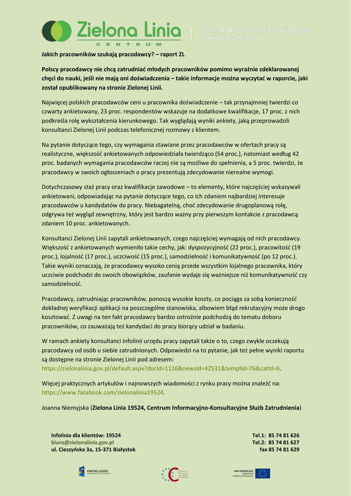 Jakich pracowników szukają pracodawcy? – raport ZL Polscy pracodawcy nie chcą zatrudniać młodych pracowników pomimo wyraźnie zdeklarowanej chęci do nauki, jeśli nie mają oni doświadczenia – takie informacje można wyczytać w raporcie, jaki został opublikowany na stronie Zielonej Linii. Najwięcej polskich pracodawców ceni u pracownika doświadczenie – tak przynajmniej twierdzi co czwarty ankietowany, 23 proc. respondentów wskazuje na dodatkowe kwalifikacje, 17 proc. z nich podkreśla rolę wykształcenia kierunkowego. Tak wyglądają wyniki ankiety, jaką przeprowadzili konsultanci Zielonej Linii podczas telefonicznej rozmowy z klientem. Na pytanie dotyczące tego, czy wymagania stawiane przez pracodawców w ofertach pracy są realistyczne, większość ankietowanych odpowiedziała twierdząco (54 proc.), natomiast według 42 proc. badanych wymagania pracodawców raczej nie są możliwe do spełnienia, a 5 proc. twierdzi, że pracodawcy w swoich ogłoszeniach o pracy prezentują zdecydowanie nierealne wymogi. Dotychczasowy staż pracy oraz kwalifikacje zawodowe – to elementy, które najczęściej wskazywali ankietowani, odpowiadając na pytanie dotyczące tego, co ich zdaniem najbardziej interesuje pracodawców u kandydatów do pracy. Niebagatelną, choć zdecydowanie drugoplanową rolę, odgrywa też wygląd zewnętrzny, który jest bardzo ważny przy pierwszym kontakcie z pracodawcą zdaniem 10 proc. ankietowanych. Konsultanci Zielonej Linii zapytali ankietowanych, czego najczęściej wymagają od nich pracodawcy. Większość z ankietowanych wymieniło takie cechy, jak: dyspozycyjność (22 proc.), pracowitość (19 proc.), lojalność (17 proc.), uczciwość (15 proc.), samodzielność i komunikatywność (po 12 proc.). Takie wyniki oznaczają, że pracodawcy wysoko cenią przede wszystkim lojalnego pracownika, który uczciwie podchodzi do swoich obowiązków, zaufanie wydaje się ważniejsze niż komunikatywność czy samodzielność. Pracodawcy, zatrudniając pracowników, ponoszą wysokie koszty, co pociąga za sobą konieczność dokładnej weryfikacji aplikacji na poszczególne stanowiska, albowiem błąd rekrutacyjny może drogo kosztować. Z uwagi na ten fakt pracodawcy bardzo ostrożnie podchodzą do tematu doboru pracowników, co zauważają też kandydaci do pracy biorący udział w badaniu. W ramach ankiety konsultanci infolinii urzędu pracy zapytali także o to, czego zwykle oczekują pracodawcy od osób u siebie zatrudnionych. Odpowiedzi na to pytanie, jak też pełne wyniki raportu są dostępne na stronie Zielonej Linii pod adresem: https://zielonalinia.gov.pl/default.aspx?docId=1116&newsId=42531&templId=76&catId=6. Więcej praktycznych artykułów i najnowszych wiadomości z rynku pracy można znaleźć na: https://www.facebook.com/zielonalinia19524. Joanna Niemyjska (Zielona Linia 19524, Centrum Informacyjno-Konsultacyjne Służb Zatrudnienia) Infolinia dla klientów: 19524 [email protected] ul. Cieszyńska 3a, 15-371 Białystok Tel.1: 85 74 81 626 Tel.2: 85 74 81 627 fax 85 74 81 629 Infolinia dla klientów: 19524 [email protected] ul. Cieszyńska 3a, 15-371 Białystok Tel.1: 85 74 81 626 Tel.2: 85 74 81 627 fax 85 74 81 629