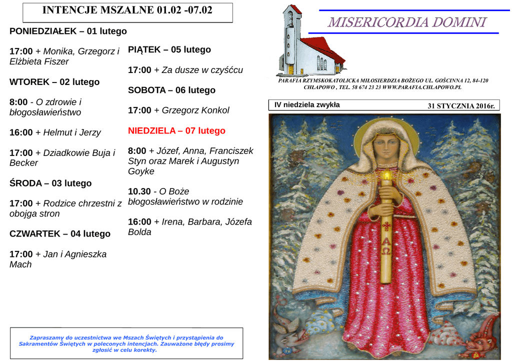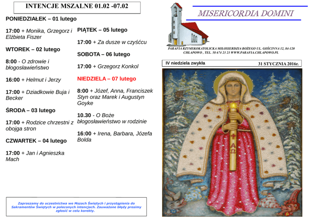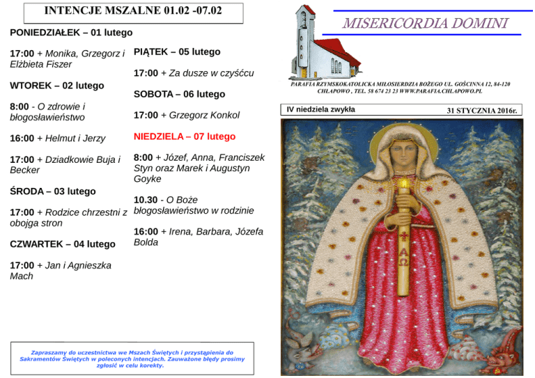INTENCJE MSZALNE 01.02 -07.02 PONIEDZIAŁEK – 01 lutego 17:00 + Monika, Grzegorz i PIĄTEK – 05 lutego Elżbieta Fiszer 17:00 + Za dusze w czyśćcu WTOREK – 02 lutego SOBOTA – 06 lutego 8:00 - O zdrowie i 17:00 + Grzegorz Konkol błogosławieństwo 16:00 + Helmut i Jerzy NIEDZIELA – 07 lutego 17:00 + Dziadkowie Buja i Becker 8:00 + Józef, Anna, Franciszek Styn oraz Marek i Augustyn Goyke ŚRODA – 03 lutego 10.30 - O Boże 17:00 + Rodzice chrzestni z błogosławieństwo w rodzinie obojga stron 16:00 + Irena, Barbara, Józefa Bolda CZWARTEK – 04 lutego 17:00 + Jan i Agnieszka Mach Zapraszamy do uczestnictwa we Mszach Świętych i przystąpienia do Sakramentów Świętych w poleconych intencjach. Zauważone błędy prosimy zgłosić w celu korekty. PARAFIA RZYMSKOKATOLICKA MIŁOSIERDZIA BOŻEGO UL. GOŚCINNA 12, 84-120 CHŁAPOWO , TEL. 58 674 23 23 WWW.PARAFIA.CHLAPOWO.PL IV niedziela zwykła 31 STYCZNIA 2016r. IV Niedziela Zwykła 1 CZYTANIE: (Jr 1,4-5.17-19) 2 CZYTANIE: (1 Kor 12,3113,13) EWANGELIA: (Łk 4,21-30) POCHYLENI NAD SŁOWEM Jest to jedna z najbardziej dramatycznych scen Ewangelii i tragicznych momentów w życiu Jezusa: został On odrzucony przez swoich najbliższych: rówieśników i ziomków. Po nieprzychylnym Betlejem i rzezi Niewiniątek, stanowiło to kolejną zapowiedź tego, co później dopełni się pod pałacem Piłata i na Kalwarii, i w tylu jeszcze miejscach i momentach ludzkich dziejów. Człowiek nie chce Boga! Bóg umiłował człowieka i oddał swego Syna z miłości, a człowiek nie chce tego daru, nie chce Bożej miłości, nie chce Boga! Czy to możliwe?Ano możliwe i chyba sami niejednokrotnie byliśmy świadkami czy wręcz uczestnikami takiego buntu przeciw Bogu. Z czego to wynika? Co pcha człowieka do takiej rozpaczliwej i tragicznej decyzji? Warto chyba się nad tym zastanowić.Wszystko rozpoczęło się w raju, kiedy to człowiek skuszony przez szatana po raz pierwszy sprzeciwił się Bogu. Grzech raz posiany, rozkrzewił się wszędzie i wszystko przerósł swymi śmiercionośnymi kłączami. Nieufność człowieka wobec Boga i związany z tym lęk, przeszły na wszystkich ludzi, rodząc nienawiść i agresję. Grzech pierworodny: nie potrzebuję Ciebie, nie chcę! Sam będę o sobie decydował! Czyż i dziś nie rozpoznajemy wokół siebie i w sobie takiej postawy?Ale Bóg sie nie zniechęca, Jego miłość jest cierpliwa i gotowa na wszystko. Najpierw posyła patriarchów, potem proroków, wreszcie swego Syna, w nadziei, że Jego uszanują. Nic z tego, a nawet wręcz przeciwnie: to dopiero doprowadza człowieka do wściekłości! Ta wściekłość ma swoje wyraźne i jednoznaczne źródło właśnie w nienawiści do Boga. Dlatego właśnie Jezus musiał umrzeć, bo był Synem Bożym i głośno to wyznał. A człowiek nie chce Boga tak blisko siebie. No, w niebie niech już sobie ten Bóg będzie, ale tu, u nas, na ziemi? Przenigdy! Niech wraca skąd przyszedł!Czyż nie echo takiej postawy słyszymy w dzisiejszej Ewangelii? Zrazu chętnie Go słuchali, bo schlebiała im Jego mądrość, pewnie przypisali ją także swojemu wpływowi i zasługom. Ale gdy tylko Jezus przytoczył mesjańskie proroctwo Izajasza, natychmiast zmienił sie nastrój. Oni chcieli mieć Jezusa na swoją małą, ludzką miarę. Chcieli mieć Jezusa do spełniania życzeń i zaspokajania codziennych potrzeb. Chcieli mieć Jezusa na posyłki, na każde zawołanie. A gdy Jezus nie chciał się do nich dostosować, gdy najpierw chciał ich wiary, wtedy Go odrzucili.Chyba dobrze wiedzieli i przeczuwali, dlaczego Go nie chcą. Albowiem wiara jest rzeczą trudną, jeśli ktoś siebie uznaje za pępek świata. A tak myśleli Żydzi. Pogańska wdowa i Syryjczyk Naaman, byli dla nich wielkim zgorszeniem i kamieniem obrazy: jak Bóg mógł przedłożyć pogan ponad swój Naród? Jak Jezus może obcych cenić wyżej niż swoich współziomków? Jak Bóg śmie kazać im czekać i wierzyć? To my sami będziemy decydować, co Bóg ma zrobić i kiedy! A jak nie, to wynocha!Taki jest człowiek: chce, by jego wola liczyła się najbardziej, chce być panem samego siebie. Czy my jesteśmy lepsi? Każdy sam musi sobie na to pytanie odpowiedzieć. Jeśli potrafimy odpowiedzieć szczerze, mamy otwartą drogę do przebaczenia i wiary; jeśli uniesiemy się pychą i buntem, dołączymy do nazaretańczyków i tych spod krzyża.A Bóg pomimo to nie traci cierpliwości. Czeka na każdego z nas, aż zrozumiemy i zechcemy Go z zaufaniem przyjąć. Czy przyjmiemy? OGŁOSZENIA DUSZPASTERSKIE NA IV NIEDZIELĘ ZWYKŁĄ 31 STYCZNIA 2016 r. 1. Wtorek - Święto Matki Bożej Gromnicznej. Msze św. odprawiamy o godz. 8:00, 16:00 - dla dzieci i 17:00. Na każdej Mszy św. poświęcamy gromnice. Jest to Światowy Dzień Życia Konsekrowanego. 2. Środa - św. Błażeja. Po Mszy udzielamy błogosławieństwa za przyczyną św. Błażeja, orędownika i opiekuna w chorobach gardła. 3. W tym tygodniu przypadają pierwszy czwartek, pierwszy piątek i pierwsza sobota lutego. - pierwszy piątek - odwiedzanie chorych od godz. 9:00. Spowiedź dla dzieci o godz. 16:00. Ze względu na zimę, dzieci przystąpią do komunii św. bezpośrednio po spowiedzi św. w piątek jest wspomnienie św. Agaty. Poświęcamy chleb, wodę i sól. - sobota - wspomnienie Świętych Męczenników Pawła Miki i Towarzyszy. 4. Przyszła niedziela - o godz. 14.15 Różaniec Róż Różańcowych. Będziemy modlili się o dialog wiary chrześcijańskiej i ludów Azji. 5. Dziękuję za sprzątnięcie kościoła. W piątek o godz. 17:45 bardzo proszę Państwa z ul. Gościnnej, Poprzecznej i Strażackiej. Ks. Proboszcz Wiesław Wett