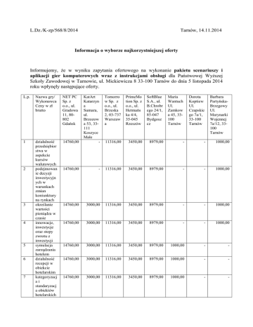 Tarnów, 14.11.2014 L.Dz./K-zp/568/8/2014 Informacja o wyborze najkorzystniejszej oferty Informujemy, że w wyniku zapytania ofertowego na wykonanie pakietu scenariuszy i aplikacji gier komputerowych wraz z instrukcjami obsługi dla Państwowej Wyższej Szkoły Zawodowej w Tarnowie, ul. Mickiewicza 8 33-100 Tarnów do dnia 5 listopada 2014 roku wpłynęły następujące oferty. L.p. Nazwa gry/ Wykonawca Ceny w zł brutto NET PC Sp. z o.o., ul. Gradowa 11, 80802 Gdańsk 1 działalność przedsiębior stwa w aspekcie kursów walutowych podejmowan ie decyzji inwestycyjn ych w warunkach zmian koniunktury na rynkach określanie wartości pieniądza w czasie innowacje, inwestycje oraz stopy zwrotu z inwestycji symulacja zarządzania hotelem działalność recepcji w obiekcie hotelarskim kategoryzacj ai standaryzacj a obiektów hotelarskich 2 3 4 5 6 7 Tomorro w Sp. z o.o., ul. Brzeska 2, 03-737 Warszaw a PrimeMo tion Sp. z o.o., ul. Hetmańs ka 4/4, 35-045 Rzeszów SoftBlue S.A., ul. B.Chrobr ego 24/1, 85-047 Bydgosz cz Maria Wantuch Ul. Zamkow a 45, 33100 Tarnów Dorota Koptiew Ul. Czapskie go 7a/1, 33-100 Tarnów 14760,00 KatArt Katarzyn a Sumara, ul. Brzozow a 53, 33111 Koszyce Małe - Barbara PartyńskaBrzegowy Ul. Marynarki Wojennej 7a/12, 33100 Tarnów 11316,00 3450,00 8979,00 - - 1000,00 14760,00 - 11316,00 3450,00 8979,00 - - 1000,00 14760,00 3000,00 11316,00 3450,00 8979,00 - - 1000,00 14760,00 3000,00 11316,00 3450,00 8979,00 - - 1000,00 14760,00 3000,00 11316,00 3450,00 8979,00 1000,00 - - 14760,00 3000,00 11316,00 3450,00 8979,00 1000,00 - - 14760,00 3000,00 11316,00 3450,00 8979,00 1000,00 - - 8 9 10 11 12 13 14 15 16 czynniki inflacji zarządzanie obiektem hotelarskim symulacja zarządzania przedsiębior stwem badania rynkowe i marketingow e teoria gier (dylemat więźnia) gospodarow anie budżetem domowym testowanie wiedzy i umiejętności z zakresu rozpoczynan ia działalności gospodarczej w dziedzinie turystyki teoria rynku proces decyzyjny Razem 14760,00 3000,00 11316,00 3450,00 8979,00 1000,00 - - 14760,00 - 11316,00 3450,00 8979,00 1000,00 - - 14760,00 3000,00 11316,00 3450,00 8979,00 - - 1000,00 14760,00 3000,00 11316,00 3450,00 8979,00 - - 1000,00 14760,00 3000,00 11316,00 3450,00 8979,00 - 1000,00 - 14760,00 3000,00 11316,00 3450,00 8979,00 - 1000,00 - 14760,00 - 11316,00 3450,00 8979,00 - 1000,00 - 14760,00 14760,00 - 11316,00 11316,00 3450,00 3450,00 8979,00 8979,00 - 1000,00 1000,00 - 236160,0 0 30000,00 181056,0 0 55200,00 143664,0 0 5000,00 5000,00 6000,00 Oferta Wykonawcy KatArt Katarzyna Sumara, ul. Brzozowa 53, 33-111 Koszyce Małe nie spełnia wymagań Zamawiającego – do oferty nie zostały załączone dokumenty potwierdzające doświadczenie Wykonawcy w szczególności, że w okresie ostatnich dwóch lat przed upływem terminu składania ofert Wykonawca wykonał co najmniej jedno zamówienie, które obejmowało wytworzenie gry edukacyjnej wraz ze scenariuszem i instrukcją obsługi. Pozostałe oferty spełniają wymagania Zamawiającego. Na podstawie kryterium cena 100% jako najkorzystniejsze wybrane zostały następujące oferty: Części zamówienia nr 1, 2, 3, 4, 10, 11 – Barbara Partyńska-Brzegowy, Ul. Marynarki Wojennej 7a/12, 33-100 Tarnów z ceną 6000 zł brutto Części zamówienia nr 5, 6, 7, 8, 9 – Maria Wantuch, Ul. Zamkowa 45, 33-100 Tarnów z ceną 5000 zł brutto Części zamówienia nr 12, 13, 14, 15, 16 - Dorota Koptiew, Ul. Czapskiego 7a/1, 33-100 Tarnów z ceną 5000 zł brutto Dziękujemy za złożenie ofert.