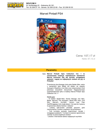 DEVCOM II Al. Korfantego 81 - Katowice 40-161 Tel. 32 259 27 19 - Serwis: 32 259 22 60 - Fax: 32 258 05 53 Marvel Pinball PS4 Cena: 107,17 zł Netto: 87,13 zł Parametry Opis Marvel Pinball: Epic Collection Vol. 1 to niesamowita kolekcja największych bohaterów Marvel Universe! Daj się porwać wciągającej zabawie i zagraj na najlepszych stołach do gry w Pinballa! Przemierzaj ulice Nowego Jorku jako Spider-Man, walcz z wampirami jako Blade lub dołącz do zespołu Avengers! Wspólnie z Iron Man oraz niesamowitym Hulk pokonasz wszystkich złoczyńców! Najpopularniejsi superbohaterowie tylko w kolekcji Marvel Pinball: Epic Collection Vol. 1! Cechy gry: - 10 stołów: Spider-Man, Doctor Strange, Iron Man, Blade, Marvel's The Avengers, World War Hulk, Civil War, Marvel's Ant-Man, Venom oraz Fear ItselfWciągający tryb single player i hot seat do 4 graczy to gwarancja udanej imprezy i zabawy! - Lokalny split-screen pozwala graczom grać równocześnie z limitem czasowym lub punktowym - Tryb turniejów pozwala organizować zacięte i wciągające pojedynki. Turnieje to czasowo ograniczone zawody na poszczególnych stołach - Lokalne i internetowe tablice najlepszych wyników 1/2 DEVCOM II Al. Korfantego 81 - Katowice 40-161 Tel. 32 259 27 19 - Serwis: 32 259 22 60 - Fax: 32 258 05 53 Data premiery 2016-11-18 Platforma Obsługiwany kontroler ruchu Gatunek Wersja językowa Tryby gry Tryby gry Wymagania wiekowe PlayStation 4 Nie Gra akcji Angielska Internet Singleplayer 12 Nośnik Blu-ray Wymagania sprzętowe - Konsola PlayStation 4 - Gra sieciowa wymaga opłacania abonamentu PlayStation Plus Video 2/2 Powered by TCPDF (www.tcpdf.org)