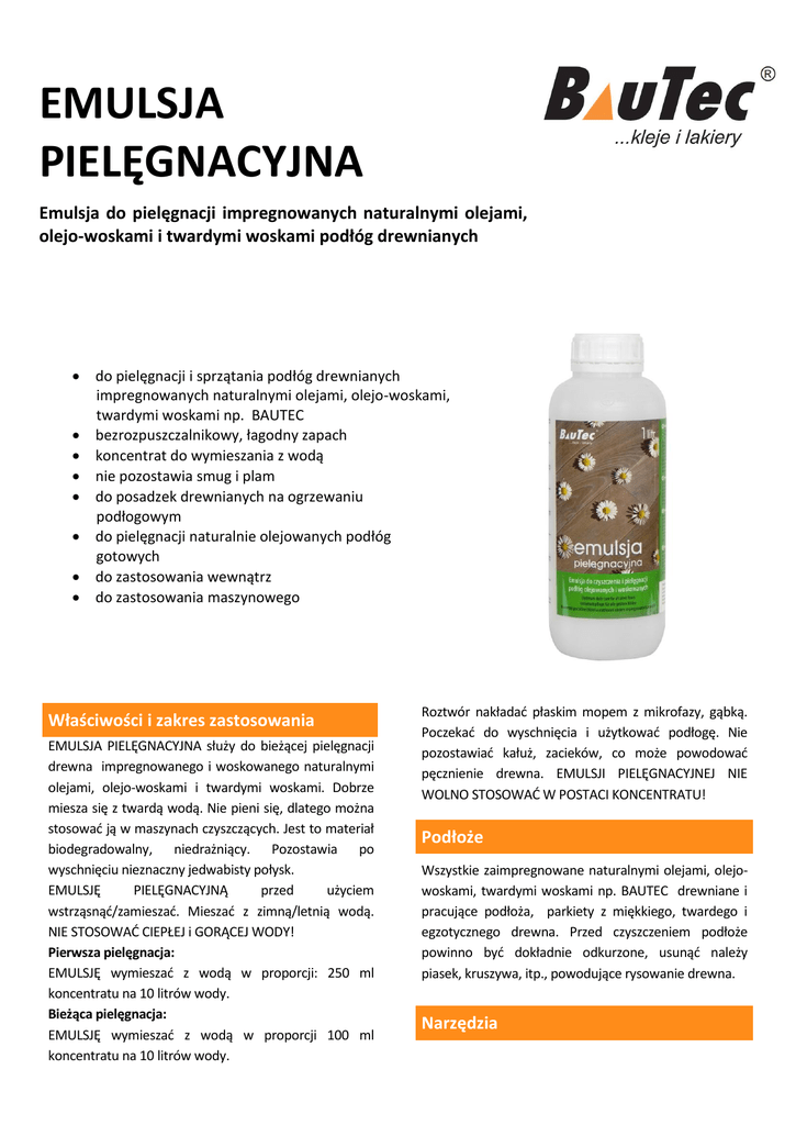 EMULSJA PIELĘGNACYJNA Emulsja do pielęgnacji impregnowanych naturalnymi olejami, olejo-woskami i twardymi woskami podłóg drewnianych do pielęgnacji i sprzątania podłóg drewnianych impregnowanych naturalnymi olejami, olejo-woskami, twardymi woskami np. BAUTEC bezrozpuszczalnikowy, łagodny zapach koncentrat do wymieszania z wodą nie pozostawia smug i plam do posadzek drewnianych na ogrzewaniu podłogowym do pielęgnacji naturalnie olejowanych podłóg gotowych do zastosowania wewnątrz do zastosowania maszynowego Właściwości i zakres zastosowania EMULSJA PIELĘGNACYJNA służy do bieżącej pielęgnacji drewna impregnowanego i woskowanego naturalnymi olejami, olejo-woskami i twardymi woskami. Dobrze miesza się z twardą wodą. Nie pieni się, dlatego można stosować ją w maszynach czyszczących. Jest to materiał biodegradowalny, niedrażniący. Pozostawia po wyschnięciu nieznaczny jedwabisty połysk. EMULSJĘ PIELĘGNACYJNĄ przed użyciem wstrząsnąć/zamieszać. Mieszać z zimną/letnią wodą. NIE STOSOWAĆ CIEPŁEJ i GORĄCEJ WODY! Pierwsza pielęgnacja: EMULSJĘ wymieszać z wodą w proporcji: 250 ml koncentratu na 10 litrów wody. Bieżąca pielęgnacja: EMULSJĘ wymieszać z wodą w proporcji 100 ml koncentratu na 10 litrów wody. Roztwór nakładać płaskim mopem z mikrofazy, gąbką. Poczekać do wyschnięcia i użytkować podłogę. Nie pozostawiać kałuż, zacieków, co może powodować pęcznienie drewna. EMULSJI PIELĘGNACYJNEJ NIE WOLNO STOSOWAĆ W POSTACI KONCENTRATU! Podłoże Wszystkie zaimpregnowane naturalnymi olejami, olejowoskami, twardymi woskami np. BAUTEC drewniane i pracujące podłoża, parkiety z miękkiego, twardego i egzotycznego drewna. Przed czyszczeniem podłoże powinno być dokładnie odkurzone, usunąć należy piasek, kruszywa, itp., powodujące rysowanie drewna. Narzędzia Gąbka, nakładka z mikrofazy do SPRAY-MOPA i płaskiego mopa, moherowa łasica. Czyszczenie narzędzi Czysta woda. Czas schnięcia Chodzi o wartości przybliżone, zależne od temperatury pomieszczenia, temperatury podłoża, wilgotności podłoża i od wilgotności względnej powietrza. Niska temperatura, podwyższona wilgotność względna powietrza, złe wietrzenie wydłużają lub skracają czas schnięcia. Dane techniczne Bezpieczeństwo i ochrona Podczas pracy używać gumowych rękawic. Po zakończeniu prac przewietrzyć pomieszczenie. Resztek produktu w opakowaniu nie wyrzucać tylko odpowiednio i bezpiecznie utylizować. EUH 208 – Zawiera Benzoizotiazolinon. Może powodować wystąpienie reakcji alergicznej. EUH 210 – Karta charakterystyki dostępna na żądanie. P101 – W razie konieczności zasięgnięcia porady lekarza należy pokazać pojemnik lub etykietę. P102 – Chronić przed dziećmi.P103 – Przed użyciem przeczytać etykietę. P301 + P310 – W PRZYPADKU POŁKNIĘCIA: Natychmiast skontaktować się z OŚRODKIEM ZATRUĆ lub z lekarzem. Ważne wskazówki Skład: Anionowe i niejonowe środki powierzchniowo czynne < 5%, rozpuszczalniki wodne, substancje pielęgnujące, substancje zapachowe, współczynnik pH =7 Kolor: bezbarwny Konsystencja: płynna Usuwanie: Nie wylewać do kanalizacji, płynne resztki zabezpieczyć i utylizować jako odpad niebezpieczny. Temperatura stosowania: od +10°C do +27°C Zużycie przy jednokrotnym ok. 1 - 4- ml/m2 sprzątaniu, koncentrat Czas schnięcia roztworu: ok. 10 - 20 minut Stosowanie Zawsze mieszać z wodą, 1:40 z wodą – 1:100 z wodą Składowanie temp. powyżej +5°C Magazynowanie 24 miesiące w suchych i chłodnych pomieszczeniach, w szczelnym opakowaniu. Chronić przed mrozem! Powyższe dane, przygotowanie i zastosowanie produktu oparto na naszej wiedzy i doświadczeniu. Niższe temperatury wydłużają czasy zastosowań, a wyższe skracają. Z powodu różnych niezależnych od nas czynników np. nietypowe podłoża, warunki zewnętrzne, jakość pracy, zalecamy przeprowadzenie własnych prób, aby stwierdzić, czy nasz produkt nadaje się do danego postępowania. Firma Bautec Polska nie ponosi odpowiedzialności z tego powodu. Przed użyciem należy zapoznać się z instrukcją techniczną i kartą charakterystyki produktu. Prace należy wykonywać zgodnie z zasadami BHP. Aktualizacja 22.01.2015 BAUTEC POLSKA SP. Z O.O. UL. TURNIEJOWA 8, 53-014 WROCŁAW TEL./FAX 71 796 26 02, +48 722-142-403 www.bautec.pl * [email protected]