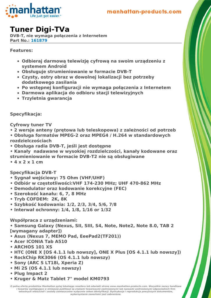 Tuner Digi-TVa DVB-T, nie wymaga połączenia z Internetem Part No.: 161879 Features: Odbieraj darmową telewizję cyfrową na swoim urządzeniu z systemem Android Obsługuje strumieniowanie w formacie DVB-T Czysty, ostry obraz w dowolnej lokalizacji bez potrzeby dodatkowego zasilania Po wstępnej konfiguracji nie wymaga połączenia z Internetem Darmowa aplikacja do odbioru stacji telewizyjnych Trzyletnia gwarancja Specyfikacja: Cyfrowy tuner TV • 2 wersje anteny (prętowa lub teleskopowa) z zależności od potrzeb • Obsługa formatów MPEG-2 oraz MPEG4 / H.264 w standardowych rozdzielczościach • Obsługa radia DVB-T, jeśli jest dostępne • Kanały nadawane w wysokiej rozdzielczości, kanały kodowane oraz strumieniowanie w formacie DVB-T2 nie są obsługiwane • 4 x 2 x 1 cm Specyfikacja DVB-T • Sygnał wejściowy: 75 Ohm (VHF/UHF) • Odbiór w częstotliwości:VHF 174-230 MHz; UHF 470-862 MHz • Demodulator oraz kodowanie korekcyjne (FEC) • Szerokość kanału: 6, 7, 8 MHz • Tryb COFDEM: 2K, 8K • Szybkość kodowania: 1/2, 2/3, 3/4, 5/6, 7/8 • Interwał ochronny: 1/4, 1/8, 1/16 or 1/32 Współpraca z urządzeniami: • Samsung Galaxy (Nexus, SII, SIII, S4, Note, Note2, Note 8.0, TAB 2 [wymagany adapter]) • Asus (Nexus 7, MEMO Pad, EeePad2(TF201)) • Acer ICONIA Tab A510 • ARCHOS 101 XS • HTC (ONE X [OS 4.1.1 lub nowszy], ONE X Plus [OS 4.1.1 lub nowszy]) • RockChip RK3066 (OS 4.1.1 lub nowszy) • Sony (ARC S LT18i, Xperia Z) • Mi 2S (OS 4.1.1 lub nowszy) • Plug Impact 2 • Kruger & Matz Tablet 7" model KM0793 O pełną ofertę produktów Manhattan pytaj lokalnego resellera lub odwiedź stronę www.manhattan-products.com. Wszystkie nazwy handlowe i towarów występujące w niniejszej publikacji są znakami towarowymi zastrzeżonymi lub nazwami zastrzeżonymi odpowiednich firm odnośnych właścicieli i zostały zamieszczone wyłącznie celem identyfikacji. Dystrybucja i reprodukcja powyższych dokumentów, wykorzystanie zawartości jest zabronione. • Modecom FreeTAB 9701 HD Minimalne wymagania systemowe: • Urządzenie z systemem Android z procesorem dual-core oraz obsługą NEON • Android 4.0.3 (Ice Cream Sandwich lub nowszy) • Zasięg DTT / Freeview / DVB-T • Urządzenie z Androidem musi obsługiwać standard USB OTG Zawartość opakowania: • Tuner Digi-TVa do Androida • Antena teleskopowa • Antena pretowa • Kabel USB A męski na micro-USB żeński • Adapter MCX • Instrukcja O pełną ofertę produktów Manhattan pytaj lokalnego resellera lub odwiedź stronę www.manhattan-products.com. Wszystkie nazwy handlowe i towarów występujące w niniejszej publikacji są znakami towarowymi zastrzeżonymi lub nazwami zastrzeżonymi odpowiednich firm odnośnych właścicieli i zostały zamieszczone wyłącznie celem identyfikacji. Dystrybucja i reprodukcja powyższych dokumentów, wykorzystanie zawartości jest zabronione. O pełną ofertę produktów Manhattan pytaj lokalnego resellera lub odwiedź stronę www.manhattan-products.com. Wszystkie nazwy handlowe i towarów występujące w niniejszej publikacji są znakami towarowymi zastrzeżonymi lub nazwami zastrzeżonymi odpowiednich firm odnośnych właścicieli i zostały zamieszczone wyłącznie celem identyfikacji. Dystrybucja i reprodukcja powyższych dokumentów, wykorzystanie zawartości jest zabronione.