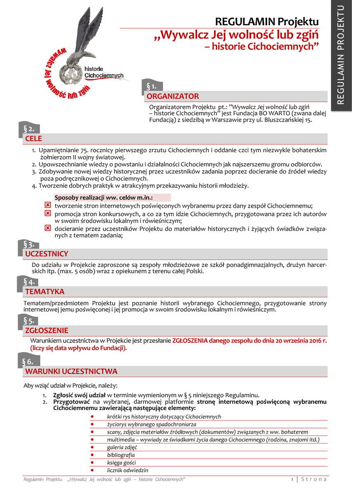 „Wywalcz Jej wolność lub zgiń – historie Cichociemnych” § 1. ORGANIZATOR Organizatorem Projektu pt.: ”Wywalcz Jej wolność lub zgiń – historie Cichociemnych” jest Fundacja BO WARTO (zwana dalej Fundacją) z siedzibą w Warszawie przy ul. Bluszczańskiej 15. § 2. CELE 1. Upamiętnianie 75. rocznicy pierwszego zrzutu Cichociemnych i oddanie czci tym niezwykle bohaterskim żołnierzom II wojny światowej. 2. Upowszechnianie wiedzy o powstaniu i działalności Cichociemnych jak najszerszemu gromu odbiorców. 3. Zdobywanie nowej wiedzy historycznej przez uczestników zadania poprzez docieranie do źródeł wiedzy poza podręcznikowej o Cichociemnych. 4. Tworzenie dobrych praktyk w atrakcyjnym przekazywaniu historii młodzieży. Sposoby realizacji ww. celów m.in.: tworzenie stron internetowych poświęconych wybranemu przez dany zespół Cichociemnemu; promocja stron konkursowych, a co za tym idzie Cichociemnych, przygotowana przez ich autorów w swoim środowisku lokalnym i rówieśniczym; docieranie przez uczestników Projektu do materiałów historycznych i żyjących świadków związanych z tematem zadania; § 3. UCZESTNICY Do udziału w Projekcie zaproszone są zespoły młodzieżowe ze szkół ponadgimnazjalnych, drużyn harcerskich itp. (max. 5 osób) wraz z opiekunem z terenu całej Polski. § 4. TEMATYKA Tematem/przedmiotem Projektu jest poznanie historii wybranego Cichociemnego, przygotowanie strony internetowej jemu poświęconej i jej promocja w swoim środowisku lokalnym i rówieśniczym. § 5. ZGŁOSZENIE Warunkiem uczestnictwa w Projekcie jest przesłanie ZGŁOSZENIA danego zespołu do dnia 20 września 2016 r. (liczy się data wpływu do Fundacji). § 6. WARUNKI UCZESTNICTWA Aby wziąć udział w Projekcie, należy: 1. Zgłosić swój udział w terminie wymienionym w § 5 niniejszego Regulaminu. 2. Przygotować na wybranej, darmowej platformie stronę internetową poświęconą wybranemu Cichociemnemu zawierającą następujące elementy: krótki rys historyczny dotyczący Cichociemnych życiorys wybranego spadochroniarza scany, zdjęcia materiałów źródłowych (dokumentów) związanych z ww. bohaterem multimedia – wywiady ze świadkami życia danego Cichociemnego (rodzina, znajomi itd.) galeria zdjęć bibliografia księga gości licznik odwiedzin Regulamin Projektu „Wywalcz Jej wolność lub zgiń – historie Cichociemnych” 1 | Strona REGULAMIN PROJEKTU REGULAMIN Projektu Każda strona musi zawierać informację o Projekcie, patronach oraz współfinansowaniu przekazane przez Fundację. Uwaga! Wszystkie informacje i zdjęcia na stronach konkursowych muszą być umieszczane z uwzględnieniem praw autorskich. 3. Zorganizować akcję promocyjną swojej strony i wybranego Cichociemnego w swoim środowisku lokalnym i rówieśniczym (promocja internetowa i bezpośrednia podczas małych spotkań lokalnych) 4. Opracować raport z realizacji akcji promocyjnej i przesłać do Fundacji do 7 grudnia 2016 r. na adres: Fundacja BO WARTO, ul. Bluszczańska 15, 00-712 Warszawa (decyduje data wpływu do Fundacji) Wzór raportu końcowego jest załącznikiem do Regulaminu. § 7. HARMONOGRAM do 20 września 2016 r. do 23 września 2016 r. 24 września – 5 grudnia 2016 r. Ostateczny termin nadsyłania zgłoszeń do projektu (data wpływu do Fundacji) Potwierdzenie rejestracji zgłoszenia i przygotowanie wykazu na stronę www.bowartopamietac.pl W przypadku wyboru tego samego Cichociemnego przez dwa lub więcej zespołów konkursowych zaproponowane zostanie, aby, jeśli to możliwe upamiętnić innego żołnierza z tej elitarnej grupy skoczków. Tworzenie stron internetowych poświęconych Cichociemnym Przeprowadzenie akcji promującej stronę i wybranego Cichociemnego listopad 2016 r. do 7 grudnia 2016 r. 8 – 15 grudnia 2016 r. 19 – 21 grudnia 2016 r. (1 dzień) Przygotowanie raportu z akcji promocyjnej i przesłanie go do Fundacji (liczy się data dostarczenia) Ocena stron i akcji promocyjnych Podsumowanie projektu i wręczenie nagród w Centrum Edukacyjnym IPN „Przystanek Historia” w Warszawie § 8. JURY 1. Organizatorzy powołają profesjonalne Jury, które dokona oceny przygotowanych stron i akcji promocyjnych. 2. Ocenie podlegać będzie, według następujących kryteriów: ► umieszczone zdjęcia ► rzetelność i bogactwo umieszczonych ► dotarcie do materiałów źródłowych i multimedia informacji ► wygląd strony ► zakres akcji promocyjnej 3. Oceny członków Jury są tajne i ostateczne. § 9. NAGRODY Laureaci Konkursu (miejsca od I do III) otrzymają nagrody rzeczowe i dyplomy, w tym m.in. tablety, czytniki e-booków, mp4, słuchawki, książki historyczne itp. § 10. PRZEPISY KOŃCOWE 1. Organizator zastrzega sobie prawo do: a. zmiany regulaminu Projektu; b. umieszczenia adresów stron konkursowych na www.bowartopamietac.pl; 2. W sprawach szczegółowych związanych z Projektem należy kontaktować się z Biurem Fundacji. Fundacja BO WARTO 00-712 Warszawa, ul. Bluszczańska 15, www.fundacjabowarto.pl tel.: 602- 228-732, tel/fax.: 22 651 02 40, e-mail: [email protected] PROJEKT ORGANIZUJE PROJEKT WSPÓŁFINANSUJE Regulamin Projektu „Wywalcz Jej wolność lub zgiń – historie Cichociemnych” PROJEKTOWI PATRONUJĄ 2 | Strona