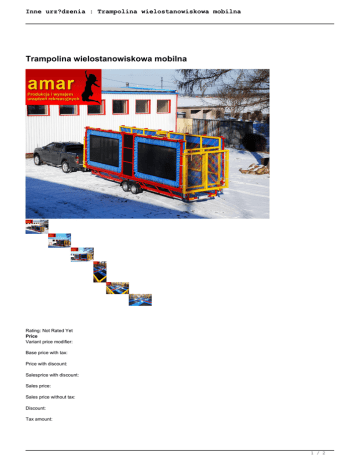 Inne urz?dzenia : Trampolina wielostanowiskowa mobilna Trampolina wielostanowiskowa mobilna Rating: Not Rated Yet Price Variant price modifier: Base price with tax: Price with discount: Salesprice with discount: Sales price: Sales price without tax: Discount: Tax amount: 1 / 2 Inne urz?dzenia : Trampolina wielostanowiskowa mobilna Ask a question about this product Description Wymiary po roz?o?eniu:d?: 9,3m szer: 8,2m wys 3,5m Gwarancja: 12 miesi?cy Dodatkowe informacje: trampolina bardzo szybko sk?adana i rozk?adana. Przewidywany czas z?o?enia i roz?o?enia to 20-30min. Przyczepa z homologacja, hamulec najazdowy. Cena netto: 75000z? Mo?liwo?? umieszczenia banerów reklamowych wokó? trampoliny wed?ug projektu klienta. 2 / 2 Powered by TCPDF (www.tcpdf.org)