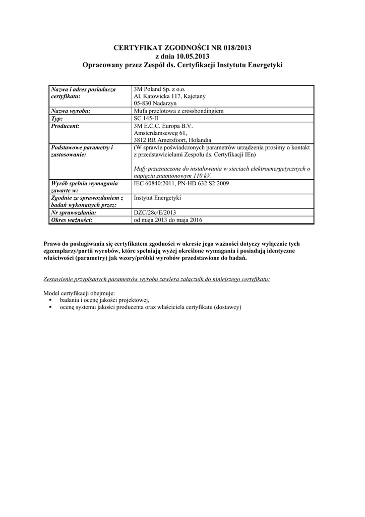 CERTYFIKAT ZGODNOŚCI NR 018/2013 z dnia 10.05.2013 Opracowany przez Zespół ds. Certyfikacji Instytutu Energetyki Nazwa i adres posiadacza certyfikatu: Nazwa wyrobu: Typ: Producent: Podstawowe parametry i zastosowanie: Wyrób spełnia wymagania zawarte w: Zgodnie ze sprawozdaniem z badań wykonanych przez: Nr sprawozdania: Okres ważności: 3M Poland Sp. z o.o. Al. Katowicka 117, Kajetany 05-830 Nadarzyn Mufa przelotowa z crossbondingiem SC 145-II 3M E.C.C. Europa B.V. Amsterdamseweg 61, 3812 RR Amersfoort, Holandia (W sprawie poświadczonych parametrów urządzenia prosimy o kontakt z przedstawicielami Zespołu ds. Certyfikacji IEn) Mufy przeznaczone do instalowania w sieciach elektroenergetycznych o napięciu znamionowym 110 kV. IEC 60840:2011, PN-HD 632 S2:2009 Instytut Energetyki DZC/28c/E/2013 od maja 2013 do maja 2016 Prawo do posługiwania się certyfikatem zgodności w okresie jego ważności dotyczy wyłącznie tych egzemplarzy/partii wyrobów, które spełniają wyżej określone wymagania i posiadają identyczne właściwości (parametry) jak wzory/próbki wyrobów przedstawione do badań. Zestawienie przypisanych parametrów wyrobu zawiera załącznik do niniejszego certyfikatu: Model certyfikacji obejmuje: badania i ocenę jakości projektowej, ocenę systemu jakości producenta oraz właściciela certyfikatu (dostawcy)