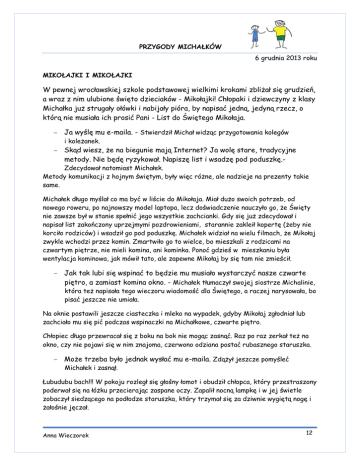 PRZYGODY MICHAŁKÓW 6 grudnia 2013 roku MIKOŁAJKI I MIKOŁAJKI W pewnej wrocławskiej szkole podstawowej wielkimi krokami zbliżał się grudzień, a wraz z nim ulubione święto dzieciaków - Mikołajki! Chłopaki i dziewczyny z klasy Michałka już strugały ołówki i nabijały pióra, by napisać jedną, jedyną rzecz, o którą nie musiała ich prosić Pani - List do Świętego Mikołaja. Ja wyślę mu e-maila. - Stwierdził Michał widząc przygotowania kolegów i koleżanek. Skąd wiesz, że na biegunie mają Internet? Ja wolę stare, tradycyjne metody. Nie będę ryzykował. Napiszę list i wsadzę pod poduszkę.- Zdecydował natomiast Michałek. Metody komunikacji z hojnym świętym, były więc różne, ale nadzieje na prezenty takie same. Michałek długo myślał co ma być w liście do Mikołaja. Miał dużo swoich potrzeb, od nowego roweru, po najnowszy model laptopa, lecz doświadczenie nauczyło go, że Święty nie zawsze był w stanie spełnić jego wszystkie zachcianki. Gdy się już zdecydował i napisał list zakończony uprzejmymi pozdrowieniami, starannie zakleił kopertę (żeby nie korciło rodziców) i wsadził go pod poduszkę. Michałek widział na wielu filmach, że Mikołaj zwykle wchodzi przez komin. Zmartwiło go to wielce, bo mieszkali z rodzicami na czwartym piętrze, nie mieli komina, ani kominka. Ponoć gdzieś w mieszkaniu była wentylacja kominowa, jak mówił tato, ale zapewne Mikołaj by się tam nie zmieścił. Jak tak lubi się wspinać to będzie mu musiało wystarczyć nasze czwarte piętro, a zamiast komina okno. - Michałek tłumaczył swojej siostrze Michalinie, która też napisała tego wieczoru wiadomość dla Świętego, a raczej narysowała, bo pisać jeszcze nie umiała. Na oknie postawili jeszcze ciasteczka i mleko na wypadek, gdyby Mikołaj zgłodniał lub zachciało mu się pić podczas wspinaczki na Michałkowe, czwarte piętro. Chłopiec długo przewracał się z boku na bok nie mogąc zasnąć. Raz po raz zerkał też na okno, czy nie pojawi się w nim znajoma, czerwono odziana postać rubasznego staruszka. Może trzeba było jednak wysłać mu e-maila. Zdążył jeszcze pomyśleć Michałek i zasnął. Łubudubu bach!!! W pokoju rozległ się głośny łomot i obudził chłopca, który przestraszony poderwał się na łóżku przecierając zaspane oczy. Zapalił nocną lampkę i w jej świetle zobaczył siedzącego na podłodze staruszka, który trzymał się za dziwnie wygiętą nogę i żałośnie jęczał. Anna Wieczorek 12 PRZYGODY MICHAŁKÓW 6 grudnia 2013 roku Oj! Oj! Oj! Oj! Ała! Staruszek, a raczej Mikołaj we własnej osobie, sądząc po czerwonym odzieniu i długiej siwej brodzie wystękał. Nie miałeś gdzie stawiać tego mleka, tylko na parapecie?! Zobacz co narobiłeś. - Oskarżycielsko spojrzał na Michałka i wskazał na swoją dziwnie wygiętą nogę. Rzeczywiście nowy dywan był cały zalany mlekiem, ale to była pestka! Mikołaj był kontuzjowany, może nawet ranny! Do Michałka dotarła zgroza całej sytuacji. Kto dostarczy resztę prezentów? Już widział tłumy rozhisteryzowanych dzieciaków, gdy pod poduszką nic rano nie znajdą. I co z jęczącym, cierpiącym Mikołajem? W szkole będzie koniec świata. – Pomyślał chłopak. Wszędzie będzie koniec świata! To będzie koniec świata. - Mikołaj na głos wypowiedział Michałkowe obawy. Tysiące dzieciaków nie doczeka się na prezenty. - Rozpaczał staruszek. A mnie pewnie wyrzucą z roboty! Proszę się nie martwić proszę Pana, hm Proszę Mikołaja. - Skruszony Michałek usiłował pocieszyć staruszka. Coś wymyślimy. Czy masz czarodziejskie sanie, chłopcze, ciągnięte przez rącze renifery, które w mig zaniosą ciebie i prezenty w każdy zakątek świata? Nie widziałem takich na parkingu pod twoim blokiem. - Dogryzał Mikołaj. Musi bardzo cierpieć. - Michałek usprawiedliwił w myślach Świętego, który nie wydał mu się w tym momencie taki święty i głośno powiedział. W telewizji mówili, że każdy może zostać Świętym Mikołajem. Proszę bardzo mój drogi, ja chętnie poszedłbym na emeryturę, albo przynajmniej na zwolnienie lekarskie. - Po tych słowach obrażony Święty zniknął. Na podłodze została jedynie mokra plama mleka i gdyby nie ona Michałek podejrzewałby, że nocna wizyta była tylko snem. Teraz się jeszcze obraził i naprawdę może nie być prezentów. - Zmartwiony Michałek zastanawiał się co dalej. To ja popsułem Mikołajki i ja muszę coś zrobić, żeby je uratować. Skoro Święty poszedł na zwolnienie lekarskie to trzeba go zastąpić. Te czarodziejskie sanie z reniferami naprawdę by się przydały... Nagle drzwi do jego pokoju otworzyły się i weszła Michalina ciągnąc worek ze swoimi Anna Wieczorek 13 PRZYGODY MICHAŁKÓW 6 grudnia 2013 roku starymi zabawkami. Wszystko słyszałam. - Wydyszała ciężko, bo worek był duży i po brzegi wypełniony lalkami, klockami i układankami. W telewizji mieli rację, każdy może zostać Mikołajem. Zobacz ile mamy niepotrzebnych zabawek. Nie są stare, ani zepsute tylko nam się już znudziły. Dla innych dzieci będą jak nowe… Jeśli Michał nam jutro pomoże to przynajmniej dzieciaki w moim przedszkolu będą miały Mikołajki. Cdn… Anna Wieczorek 14