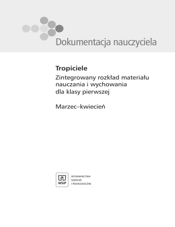 Dokumentacja nauczyciela Tropiciele Zintegrowany rozkład materiału nauczania i wychowania dla klasy pierwszej Marzec–kwiecień WYDAWNICTWA SZKOLNE I PEDAGOGICZNE Autorzy rozkładów materiałów: Agnieszka Kamińska, Beata Nadarzyńska; Aldona Danielewicz- -Malinowska (treści muzyczne); Małgorzata Małyska, Janusz Woźniak, Małgorzata Wróblewska (wychowanie muzyczne); Elżbieta Burakowska (treści matematyczne) © Copyright by Wydawnictwa Szkolne i Pedagogiczne sp. z o.o. Warszawa (2012) Wydanie I (2012) ISBN 978-83-02-13165-3 Opracowanie merytoryczne i redakcyjne: Anna Królik (redaktor cyklu), Małgorzata Uba (redaktor merytoryczny) Redakcja techniczna: Monika Rudnik-Kulikowska Projekt graficzny: Studio SundayLove Skład i łamanie: Meritum21 Wydawnictwa Szkolne i Pedagogiczne spółka z ograniczoną odpowiedzialnością 00-807 Warszawa, Aleje Jerozolimskie 96 Tel.: 22 576 25 00 Infolinia: 800 220 555 www.wsip.pl Druk i oprawa: Formator Sp. z o.o., Toruń Tropiciele. Rozkład materiału nauczania i wychowania dla klasy pierwszej Zintegrowany rozkład materiału nauczania i wychowania dla klasy I część 4 MARZEC–KWIECIEŃ Rozkład tematów w podziale na tygodnie i dni I. Ja w kosmosie 1. Czy jesteśmy sami w kosmosie? 2. Mały konstruktor 3. Galaktyczna niespodzianka 4. Chcę zostać astronautą 5. Lecimy w kosmos V. Dla każdego coś ciekawego 21.Strach ma wielkie oczy 22.Prima aprilis 23.Strażacy w akcji 24.Wiosenne porządki 25.Po co komu wiatr? II. Przedwiośnie VI. Graj w zielone 6. W marcu jak w garncu 7. Kiedy do lekarza 8. Zabawa w podchody 9. W co się bawić na podwórku 10. Zabawa 26. Święto drzewa 27. Historia dzbanka 28. Segregujemy odpady 29. U lekarza 30. Dbam o zdrowie III. Wiosna VII. Kolorowe święta 11. Żegnaj, zimo! Witaj, wiosno! 12. Kazio i źrebak 13. Małe i duże zwierzęta 14. Niespodzianki wiosny 15. Ptaki wracają 31. Nasze ulubione zajęcia 32. Niezwykłe kolekcje 33. Przygotowania do świąt 34. Świąteczny stół 35. Śmigus-dyngus IV. Bezcenna woda 16. Po co komu woda? 17. Rośliny w naszej klasie 18. Tajemnice ćmy 19. Szanujmy wodę 20. Śpiąca królewna 3 4 1.1) b, c 1.2) b, d, f Odniesienia do NPP plastyczna 5.1) 2) Uczestnictwo w zgodnej zabawie z rówieśnikami z wykorzystaniem znanych i nieznanych wyliczanek. Przestrzeganie reguł obowiązujących wśród U. społeczna 6.1) a, b 7.2) a M. s. 3–5 Trafne posługiwanie się liczbą naturalną w różnych aspektach. Liczby drugiej dziesiątki. Wypowiedzi na temat lotów kosmicznych oraz różnych planet na podstawie wiedzy i doświadczenia U. Rozpoznawanie zwierząt, w których nazwach, słychać ś (ryś, ślimak, świstak). P. s. 3 K. s. 3 matematyczna przyrodnicza Aktywność ucznia – edukacje techniczna etyczna Przewidywane osiągnięcia ucznia Podstawowe • Słucha ze zrozumieniem i w skupieniu czytanego tekstu • Wypowiada się na temat ilustracji i tekstu wiersza • Obdarza uwagą rozmówców • Kulturalnie zwraca się do rozmówców • Prezentuje znane wyliczanki • Próbuje układać własne wyliczanki • Dokonuje analizy i syntezy wzorowo-słuchowej wyrazów • Uczestniczy w zgodnej zabawie z wykorzystaniem wyliczanek • Przestrzega reguł obowiązujących wśród U. • Rozpoznaje zwierzęta, w których nazwach słychać ś • Śpiewa piosenkę O Mikołaju Koperniku solo i w grupie • Potrafi określić położenie dźwięku sol na pięciolinii • Rozpoznaje i zapisuje liczby do 20 • Ponadpodstawowe • Wypowiada się na temat lotów kosmicznych i znanych planet • 3.1) 2) 3.3) 4) 5) CD – piosenka O Mikołaju Koperniku. P. s. 82 Abecadło muzyczne – dźwięk sol. P. s. 3 K. s. 3 Odniesienie do stron w materiałach uczniowskich muzyczna Nauka piosenki O Mikołaju Koperniku. Zapoznanie z dźwiękiem sol. polonistyczna Dzień 1. Wysłuchanie wiersza Czy jesteśmy sami D. Wawiłow i N. Usenko w kosmosie? Wyliczanka. Wielozdaniowe wypowiedzi na temat ilustracji oraz tekstu wiersza. Prezentowanie znanych wyliczanek, próba układania nowych. Analiza i synteza wzrokowo-słuchowa wyrazów z ś. Temat dnia I. Ja w kosmosie Zintegrowany rozkład materiału nauczania i wychowania dla klasy I część 4 MARZEC–KWIECIEŃ 4.1) 2) 5.1) 2) Zgodna współpraca w grupach zadaniowych. 6.1) e, h Wykorzystanie surowców wtórnych do zrobienia makiety pojazdu kosmicznego. 7.2) a M. s. 6, 7 Liczby drugiej dziesiątki. Przeliczanie do 20. 9.2) a, b Wykonanie i ozdabianie rakiety z pudeł kartonowych z zachowaniem zasad bezpieczeństwa oraz ładu i porządku w miejscu pracy. Przewidywane osiągnięcia ucznia Podstawowe • Czyta wyrazy z ś i si • Wyszukuje na ilustracji przedmioty, w których nazwach słychać ś • Wypowiada się na temat ilustracji i czytanego tekstu • Doskonali umiejętność czytania na różnych poziomach • Kreśli kształty literopodobne • Dokonuje analizy i syntezy wzrokowo-słuchowej wyrazu • Ilustruje scenę inspirowaną wyobraźnią, wykorzystując dowolną technikę malarską • Zgodnie współpracuje w grupie • Wykorzystuje surowce wtórne do wykonania modelu rakiety • Przelicza do 20 • Rozpoznaje i zapisuje liczby do 20 • Potrafi zorganizować oraz utrzymać ład i porządek na stanowisku pracy; potrafi posługiwać się prostymi narzędziami, np. nożyczkami • Wycina po linii, klei papier • Wyjaśnia, jaka siła wprawia rakietę w ruch • Ponadpodstawowe • Opowiada o konstruowaniu rakiety przez bohatera • 1.1) a, b, c 1.2) b, c, d, f Odniesienia do NPP Przedstawianie siebie w rakiecie kosmicznej z wykorzystaniem dowolnej techniki plastycznej. Ilustrowanie sceny inspirowanej wyobraźnią. K. s. 4 Nauka czytania wyrazów z ś i si. Wyszukiwanie na ilustracji przedmiotów, w których nazwach słychać ś. Wypowiedzi na temat ilustracji i tekstu. Opowiadanie o konstruowaniu rakiety przez Stasia. Ćwiczenie czytania na różnych poziomach. Wyszukiwanie w tekście wyrazów, w których występują ś, si. Ćwiczenia gra