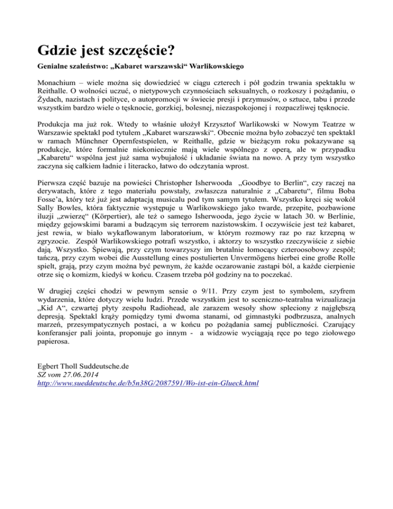 Gdzie jest szczęście? Genialne szaleństwo: „Kabaret warszawski“ Warlikowskiego Monachium – wiele można się dowiedzieć w ciągu czterech i pół godzin trwania spektaklu w Reithalle. O wolności uczuć, o nietypowych czynnościach seksualnych, o rozkoszy i pożądaniu, o Żydach, nazistach i polityce, o autopromocji w świecie presji i przymusów, o sztuce, tabu i przede wszystkim bardzo wiele o tęsknocie, gorzkiej, bolesnej, niezaspokojonej i rozpaczliwej tęsknocie. Produkcja ma już rok. Wtedy to właśnie ułożył Krzysztof Warlikowski w Nowym Teatrze w Warszawie spektakl pod tytułem „Kabaret warszawski“. Obecnie można było zobaczyć ten spektakl w ramach Münchner Opernfestspielen, w Reithalle, gdzie w bieżącym roku pokazywane są produkcje, które formalnie niekoniecznie mają wiele wspólnego z operą, ale w przypadku „Kabaretu“ wspólna jest już sama wybujałość i układanie świata na nowo. A przy tym wszystko zaczyna się całkiem ładnie i literacko, łatwo do odczytania wprost. Pierwsza część bazuje na powieści Christopher Isherwooda „Goodbye to Berlin“, czy raczej na derywatach, które z tego materiału powstały, zwłaszcza naturalnie z „Cabaretu“, filmu Boba Fosse’a, który też już jest adaptacją musicalu pod tym samym tytułem. Wszystko kręci się wokół Sally Bowles, która faktycznie występuje u Warlikowskiego jako twarde, przepite, pozbawione iluzji „zwierzę“ (Körpertier), ale też o samego Isherwooda, jego życie w latach 30. w Berlinie, między gejowskimi barami a budzącym się terrorem nazistowskim. I oczywiście jest też kabaret, jest rewia, w biało wykaflowanym laboratorium, w którym rozmowy raz po raz krzepną w zgryzocie. Zespół Warlikowskiego potrafi wszystko, i aktorzy to wszystko rzeczywiście z siebie dają. Wszystko. Śpiewają, przy czym towarzyszy im brutalnie łomocący czteroosobowy zespół; tańczą, przy czym wobei die Ausstellung eines postulierten Unvermögens hierbei eine große Rolle spielt, grają, przy czym można być pewnym, że każde oczarowanie zastąpi ból, a każde cierpienie otrze się o komizm, kiedyś w końcu. Czasem trzeba pół godziny na to poczekać. W drugiej części chodzi w pewnym sensie o 9/11. Przy czym jest to symbolem, szyfrem wydarzenia, które dotyczy wielu ludzi. Przede wszystkim jest to sceniczno-teatralna wizualizacja „Kid A“, czwartej płyty zespołu Radiohead, ale zarazem wesoły show spleciony z najgłębszą depresją. Spektakl krąży pomiędzy tymi dwoma stanami, od gimnastyki podbrzusza, analnych marzeń, przesympatycznych postaci, a w końcu po pożądania samej publiczności. Czarujący konferansjer pali jointa, proponuje go innym - a widzowie wyciągają ręce po tego ziołowego papierosa. Egbert Tholl Suddeutsche.de SZ vom 27.06.2014 http://www.sueddeutsche.de/b5n38G/2087591/Wo-ist-ein-Glueck.html A więc seks jest jednak rozwiązaniem Gościnny występ „Kabaretu warszawskiego Nowego teatru w Warszawie, w ramach Opernfestspiele w Reithalle Konferansjer jeszcze nigdy nie był aż tak zniszczony, panna Schneider tak gruba, a tancerki tak podstarzałe i jeszcze mniej pochodzące z Paryża jak w tym Kit-Kat-Clubie. Za to Magda Cielecka jast jeszcze bardziej jasnowłosa, bardziej długonoga i bardziej erotyczna niż wszystkie panie, które kiedykolwiek próbowały zmierzyć się z rolą Sally Bowles. Kto widział ją w Reithalle, może zapomnieć Lizę Minelli: można sobie na takie superlatywy śmiało pozwolić. Polski reżyser Krzysztof Warlikowski wziął „Kabarecie warszawskim" najpierw na warsztat sztukę, która była podłożem musicalu „Cabaret”. W dalszej części odbijają się erotyczne tęsknoty Zmierzchu Bogów Republiki Weimarksiej w filmie Johna Camerona Mitchella „Shortbus", którego akcja dzieje się w Nowym Jorku, wkrótce po zamachu terrorystycznym 11 września 2001. Pierwsza część tego występu gościnnego nie jest wolna od paraliżujących pełnych frazesów dywagacji na temat kompleksu matki, muzyki Wagner i narodowego socjalizmi. Część ta kończy się marzeniem o otrzymaniu Oscara przez Sally Bowles: statuetkę wręcza jej Hitler. Druga część, po przerwie, rozpoczyna się sceną spółkowania pary do hałaśliwej muzyki. Ekscesywnie, akrobatycznie i raczej osiągając niewielką satysfakcję. Jeśli ktoś podczas scen tego typu w teatrze cierpiał, tu mógł odetchnąć: nigdy jeszcze tego typu sceny nie były grane skromniej, dyskretniej, a jednocześnie ogromnie zmysłowo. Voyerzy musieli się obejść smakiem. Jointy krążą wśród publiczności Drugą część domunuje frustracja seksualna pary gejów, którzy odiwedzają terapeutkę, która jeszcze nigdy nie przeżyła orgazmu. Spotykają się w Shortbusie, skrzyżowaniu libertyńskiego salonu, varieté i swingerclubu. W scenie będącej teatrem w teatrze, dwoje performerów prezentuje zamach na World Trade Center jako wyzwalający eksces. Matka Boska jest proszona o obdarzenie Sophie zdolnością przeżywania orgazmu i prośba zostaje wysłuchana. Jointy krążą wśród publiczności, ale oczywiście są to tylko papierosy ziołowe: w końcu to impreza Bawarskiej Opery Państwowej. Ten ekstatyczny wieczór kończy się pół godziny przed północą w cichej melancholii. W łazience, na brzegu biało wykaflowanej sceny robi się komuś niedobrze, ale pozostałe postaci wyglądają na zaspokojone. Z lekka wyczerpany widz dziękuje Operze, że sprowadziła do Monachium tę emocjonującą produkcję, którą, podobnie jak „Kobietę bez cienia” i „Oniegina” reżyserował Krzysztof Warlikowski, zwłaszcza, że stosunkowo rzadko możemy oglądać zagraniczne produkcje teatralne. Przesłanie wieczoru przegania mroczne myśli: dobry seks może jednak stać się rozwiązaniem niejednego problemu. Robert Braunmüller, 27.06.2014 Abendzeitung http://www.abendzeitung-muenchen.de/inhalt.muenchner-opernfestspiele-in-der-reithalle-krzysztofwarlikowskis