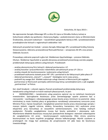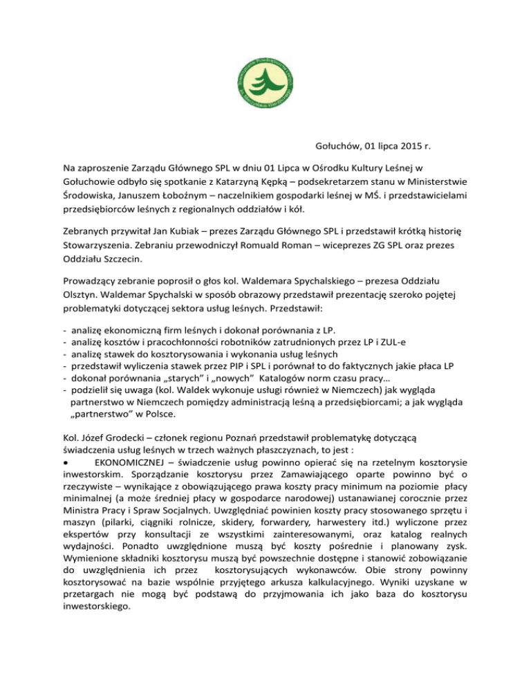 Gołuchów, 01 lipca 2015 r. Na zaproszenie Zarządu Głównego SPL w dniu 01 Lipca w Ośrodku Kultury Leśnej w Gołuchowie odbyło się spotkanie z Katarzyną Kępką – podsekretarzem stanu w Ministerstwie Środowiska, Januszem Łoboźnym – naczelnikiem gospodarki leśnej w MŚ. i przedstawicielami przedsiębiorców leśnych z regionalnych oddziałów i kół. Zebranych przywitał Jan Kubiak – prezes Zarządu Głównego SPL i przedstawił krótką historię Stowarzyszenia. Zebraniu przewodniczył Romuald Roman – wiceprezes ZG SPL oraz prezes Oddziału Szczecin. Prowadzący zebranie poprosił o głos kol. Waldemara Spychalskiego – prezesa Oddziału Olsztyn. Waldemar Spychalski w sposób obrazowy przedstawił prezentację szeroko pojętej problematyki dotyczącej sektora usług leśnych. Przedstawił: - analizę ekonomiczną firm leśnych i dokonał porównania z LP. analizę kosztów i pracochłonności robotników zatrudnionych przez LP i ZUL-e analizę stawek do kosztorysowania i wykonania usług leśnych przedstawił wyliczenia stawek przez PIP i SPL i porównał to do faktycznych jakie płaca LP dokonał porównania „starych” i „nowych” Katalogów norm czasu pracy… podzielił się uwaga (kol. Waldek wykonuje usługi również w Niemczech) jak wygląda partnerstwo w Niemczech pomiędzy administracją leśną a przedsiębiorcami; a jak wygląda „partnerstwo” w Polsce. Kol. Józef Grodecki – członek regionu Poznań przedstawił problematykę dotyczącą świadczenia usług leśnych w trzech ważnych płaszczyznach, to jest : EKONOMICZNEJ – świadczenie usług powinno opierać się na rzetelnym kosztorysie inwestorskim. Sporządzanie kosztorysu przez Zamawiającego oparte powinno być o rzeczywiste – wynikające z obowiązującego prawa koszty pracy minimum na poziomie płacy minimalnej (a może średniej płacy w gospodarce narodowej) ustanawianej corocznie przez Ministra Pracy i Spraw Socjalnych. Uwzględniać powinien koszty pracy stosowanego sprzętu i maszyn (pilarki, ciągniki rolnicze, skidery, forwardery, harwestery itd.) wyliczone przez ekspertów przy konsultacji ze wszystkimi zainteresowanymi, oraz katalog realnych wydajności. Ponadto uwzględnione muszą być koszty pośrednie i planowany zysk. Wymienione składniki kosztorysu muszą być powszechnie dostępne i stanowić zobowiązanie do uwzględnienia ich przez kosztorysujących wykonawców. Obie strony powinny kosztorysować na bazie wspólnie przyjętego arkusza kalkulacyjnego. Wyniki uzyskane w przetargach nie mogą być podstawą do przyjmowania ich jako baza do kosztorysu inwestorskiego. SPOŁECZNEJ - rynek usług leśnych jest znaczącym obszarem pracy „na czarno”. Dalsza, bardzo liczna część osób wykonujących prace leśne świadczy swą pracę w oparciu o tzw. umowy śmieciowe, lub samozatrudnienie, co powoduje określone negatywne konsekwencje społeczne. Brak właściwych rozwiązań prawnych w połączeniu z bardzo niskimi zarobkami skutkuje w przypadku utraty zdolności do pracy, (a należy pamiętać, że praca w charakterze robotnika leśnego należy do najcięższych i najbardziej niebezpiecznych), pozbawieniem możliwości egzystencji zarówno te osoby jak i ich rodziny. Nadmierne obciążenie pracą wynikające z potrzeby „zarobienia” w systemie akordowym (bo tylko taki funkcjonuje przy usługowym wykonawstwie prac leśnych) na zaspokojenie potrzeb materialnych, najczęściej całej rodziny, wynika z bardzo skromnych środków finansowych przeznaczonych przez jednostki LP na wykonanie prac leśnych. PRAWNY – istniejący, oparty na Prawie Zamówień Publicznych, system kontraktowania prac leśnych nie jest przystosowany do specyfiki polskiego leśnictwa. W rzeczywistości u nas nie ma rynku prac leśnych. Po stronie Zamawiającego występują jedynie jednostki LP jako jednolita pionowa zorganizowana organizacja o charakterze korporacyjnym będąca w praktyce monopolistą. Po stronie wykonawcy występują tysiące małych, słabych pod względem ekonomicznym i merytorycznym podmiotów gospodarczych których powstanie nie wynikało z uwarunkowań rynkowych, lecz zostało wymuszone administracyjnie w procesie restrukturyzacji zatrudnienia w LP. Lokalny charakter gospodarki leśnej i lokalne rozwiązania organizacyjne i techniczne będące domeną Zamawiającego powodują daleko idącą asymetrię pomiędzy Zamawiającym a Wykonawcą. Wykonawca kontraktujący prace w oparciu o PZP w praktyce nie ma wpływu na terminy ich wykonywania, stosowane rozwiązania technologiczne, techniczne i organizacyjne, a więc na wszystkie składowe kształtujące koszt ich wykonania. Wykonawca wyczerpuje wszystkie znamiona zatrudnienia na umowę o pracę. Powstaje pytanie; dlaczego ZUL nie może w takiej sytuacji zatrudniać na umowę zlecenie lub umowę o dzieło, a dla Zamawiającego jest to nie budząca żadnych wątpliwości zasada?!! Kontraktowanie prac leśnych oparte jest o powszechną zasadę konkurencyjności. Niestety pomimo, że wśród leśników powszechna jest opinia, że konkurencyjna oferta to nie ta która jest najtańsza, ale ta która łączy w sobie wysoką jakość za akceptowalną cenę, w praktyce jedynym kryterium jest najniższa cena. Realizując od lat strategię najniższej ceny, w rezultacie obniżamy jakość i profesjonalizm, przymykamy oko na bezpieczeństwo i higienę pracy, tracimy z pola widzenia przyszłość wykonawstwa prac leśnych i wynikające z tego zagrożenia dla gospodarki leśnej będącej warunkiem nie tylko rozwoju gospodarczego, ale również bezpieczeństwa ekologicznego Polski. Stosowane kryteria wyboru oferty doprowadziły do „zdziczenia” rynku prac leśnych, otwierając drogę dla cynicznych oferentów, zawłaszczających cudzą pracę i jej efekty, zwanych powszechnie firmami teczkowymi. Wypracowanie i stosowanie poprawnych uregulowań prawnych i zasad powinno skutkować ucywilizowaniem obszaru usług leśnych. W czasie wystąpi