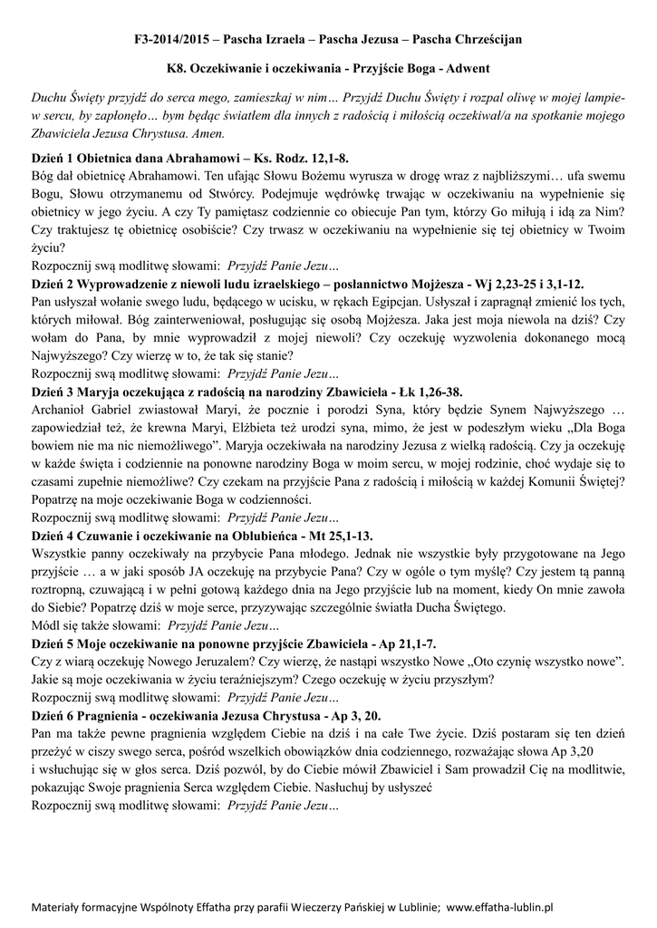 F3-2014/2015 – Pascha Izraela – Pascha Jezusa – Pascha Chrześcijan K8. Oczekiwanie i oczekiwania - Przyjście Boga - Adwent Duchu Święty przyjdź do serca mego, zamieszkaj w nim… Przyjdź Duchu Święty i rozpal oliwę w mojej lampiew sercu, by zapłonęło… bym będąc światłem dla innych z radością i miłością oczekiwał/a na spotkanie mojego Zbawiciela Jezusa Chrystusa. Amen. Dzień 1 Obietnica dana Abrahamowi – Ks. Rodz. 12,1-8. Bóg dał obietnicę Abrahamowi. Ten ufając Słowu Bożemu wyrusza w drogę wraz z najbliższymi… ufa swemu Bogu, Słowu otrzymanemu od Stwórcy. Podejmuje wędrówkę trwając w oczekiwaniu na wypełnienie się obietnicy w jego życiu. A czy Ty pamiętasz codziennie co obiecuje Pan tym, którzy Go miłują i idą za Nim? Czy traktujesz tę obietnicę osobiście? Czy trwasz w oczekiwaniu na wypełnienie się tej obietnicy w Twoim życiu? Rozpocznij swą modlitwę słowami: Przyjdź Panie Jezu… Dzień 2 Wyprowadzenie z niewoli ludu izraelskiego – posłannictwo Mojżesza - Wj 2,23-25 i 3,1-12. Pan usłyszał wołanie swego ludu, będącego w ucisku, w rękach Egipcjan. Usłyszał i zapragnął zmienić los tych, których miłował. Bóg zainterweniował, posługując się osobą Mojżesza. Jaka jest moja niewola na dziś? Czy wołam do Pana, by mnie wyprowadził z mojej niewoli? Czy oczekuję wyzwolenia dokonanego mocą Najwyższego? Czy wierzę w to, że tak się stanie? Rozpocznij swą modlitwę słowami: Przyjdź Panie Jezu… Dzień 3 Maryja oczekująca z radością na narodziny Zbawiciela - Łk 1,26-38. Archanioł Gabriel zwiastował Maryi, że pocznie i porodzi Syna, który będzie Synem Najwyższego … zapowiedział też, że krewna Maryi, Elżbieta też urodzi syna, mimo, że jest w podeszłym wieku „Dla Boga bowiem nie ma nic niemożliwego”. Maryja oczekiwała na narodziny Jezusa z wielką radością. Czy ja oczekuję w każde święta i codziennie na ponowne narodziny Boga w moim sercu, w mojej rodzinie, choć wydaje się to czasami zupełnie niemożliwe? Czy czekam na przyjście Pana z radością i miłością w każdej Komunii Świętej? Popatrzę na moje oczekiwanie Boga w codzienności. Rozpocznij swą modlitwę słowami: Przyjdź Panie Jezu… Dzień 4 Czuwanie i oczekiwanie na Oblubieńca - Mt 25,1-13. Wszystkie panny oczekiwały na przybycie Pana młodego. Jednak nie wszystkie były przygotowane na Jego przyjście … a w jaki sposób JA oczekuję na przybycie Pana? Czy w ogóle o tym myślę? Czy jestem tą panną roztropną, czuwającą i w pełni gotową każdego dnia na Jego przyjście lub na moment, kiedy On mnie zawoła do Siebie? Popatrzę dziś w moje serce, przyzywając szczególnie światła Ducha Świętego. Módl się także słowami: Przyjdź Panie Jezu… Dzień 5 Moje oczekiwanie na ponowne przyjście Zbawiciela - Ap 21,1-7. Czy z wiarą oczekuję Nowego Jeruzalem? Czy wierzę, że nastąpi wszystko Nowe „Oto czynię wszystko nowe”. Jakie są moje oczekiwania w życiu teraźniejszym? Czego oczekuję w życiu przyszłym? Rozpocznij swą modlitwę słowami: Przyjdź Panie Jezu… Dzień 6 Pragnienia - oczekiwania Jezusa Chrystusa - Ap 3, 20. Pan ma także pewne pragnienia względem Ciebie na dziś i na całe Twe życie. Dziś postaram się ten dzień przeżyć w ciszy swego serca, pośród wszelkich obowiązków dnia codziennego, rozważając słowa Ap 3,20 i wsłuchując się w głos serca. Dziś pozwól, by do Ciebie mówił Zbawiciel i Sam prowadził Cię na modlitwie, pokazując Swoje pragnienia Serca względem Ciebie. Nasłuchuj by usłyszeć Rozpocznij swą modlitwę słowami: Przyjdź Panie Jezu… Materiały formacyjne Wspólnoty Effatha przy parafii Wieczerzy Pańskiej w Lublinie; www.effatha-lublin.pl
