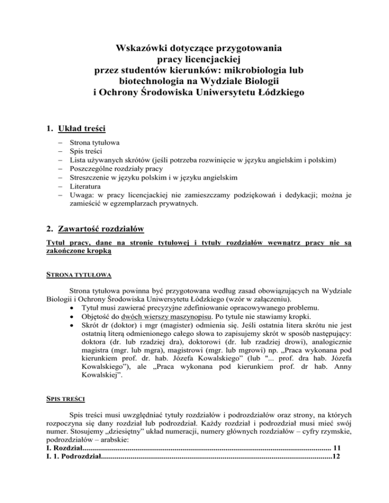 Wskazówki dotyczące przygotowania pracy licencjackiej przez studentów kierunków: mikrobiologia lub biotechnologia na Wydziale Biologii i Ochrony Środowiska Uniwersytetu Łódzkiego 1. Układ treści Strona tytułowa Spis treści Lista używanych skrótów (jeśli potrzeba rozwinięcie w języku angielskim i polskim) Poszczególne rozdziały pracy Streszczenie w języku polskim i w języku angielskim Literatura Uwaga: w pracy licencjackiej nie zamieszczamy podziękowań i dedykacji; można je zamieścić w egzemplarzach prywatnych. 2. Zawartość rozdziałów Tytuł pracy, dane na stronie tytułowej i tytuły rozdziałów wewnątrz pracy nie są zakończone kropką STRONA TYTUŁOWA Strona tytułowa powinna być przygotowana według zasad obowiązujących na Wydziale Biologii i Ochrony Środowiska Uniwersytetu Łódzkiego (wzór w załączeniu). Tytuł musi zawierać precyzyjne zdefiniowanie opracowywanego problemu. Objętość do dwóch wierszy maszynopisu. Po tytule nie stawiamy kropki. Skrót dr (doktor) i mgr (magister) odmienia się. Jeśli ostatnia litera skrótu nie jest ostatnią literą odmienionego całego słowa to zapisujemy skrót w sposób następujący: doktora (dr. lub rzadziej dra), doktorowi (dr. lub rzadziej drowi), analogicznie magistra (mgr. lub mgra), magistrowi (mgr. lub mgrowi) np. „Praca wykonana pod kierunkiem prof. dr. hab. Józefa Kowalskiego” (lub "... prof. dra hab. Józefa Kowalskiego”), ale „Praca wykonana pod kierunkiem prof. dr hab. Anny Kowalskiej”. SPIS TREŚCI Spis treści musi uwzględniać tytuły rozdziałów i podrozdziałów oraz strony, na których rozpoczyna się dany rozdział lub podrozdział. Każdy rozdział i podrozdział musi mieć swój numer. Stosujemy „dziesiętny” układ numeracji, numery głównych rozdziałów – cyfry rzymskie, podrozdziałów – arabskie: I. Rozdział............................................................................................................................... 11 I. 1. Podrozdział......................................................................................................................12 I. 2. Podrozdział..................................................................................................................... 14 I. 2. 1. Podpodrozdział........................................................................................................... 17 OGÓLNE ZASADY PISANIA POSZCZEGÓLNYCH ROZDZIAŁÓW PRACY Praca licencjacka jest pracą teoretyczną. Objętość pracy nie powinna przekraczać 20 stron (średnio 15-20 stron). Po każdej podanej informacji musi być podane źródło tej informacji (patrz niżej: cytowanie piśmiennictwa). Nie wolno przepisywać niezmienionego fragmentu tekstu ze źródeł!!! Podana informacja musi być przez nas opracowana – ma być syntezą z różnych źródeł. Jedno zdanie może zawierać informację zamieszczoną w kilku źródłach i wszystkie te źródła musimy podać: np. Lew jest zwierzęciem drapieżnym (Nowak 1990, Kowalski i Jankowski 2002, Burakiewicz i in. 2006). Praca licencjacka powinna zawierać informacje podane drukiem. Dopuszcza się informacje z Internetu (np. rekomendacje WHO), z zaznaczeniem strony www. i podaniem stanu dnia w rozdziale Literatura. Liczba cytowanych źródeł to minimum kilkanaście, w tym ponad 80% to artykuły z czasopism naukowych, z uwzględnieniem prac obcojęzycznych. Cytowane źródła powinny być aktualne i najnowsze. Powinny obejmować źródła z ostatnich 5 lat. Cytujemy tylko te prace, z którymi zapoznaliśmy się osobiście . Jeśli jakiś autor podaje informacje, powołując się na jakieś źródło, to cytujemy tego autora, którego pracę mamy „w ręku”, a nie tego, na którego on się powołuje, np. Kowalski 1978 za Wiśniewski 2004 (pracę Wiśniewskiego mamy „w ręku”). Jeżeli cytujemy kilka prac jednego autora, opublikowanych w tym samym roku, należy każdą z nich opatrzyć małą literą alfabetu: np. Nowak 1999a, Nowak 1999b. Tak ma być zarówno w tekście, jak i w spisie piśmiennictwa. Nie stosujemy przypisów. To nie jest praca humanistyczna. Liczby w tekście piszemy słownie do dziewięć i cyframi od 10. Liczebniki porządkowe oznacza się kropką, np. w latach 90. XX wieku. Nie stosujemy łączenia cyfr z literami, np. 5-ciu, 7-miu, 16-tych, 90-tych. Wyjątek stanowi połączenie z „lecie”, np. 5-lecie, w ostatnim 10-leciu itp. STRESZCZENIE W JĘZYKU POLSKIM (I W J. ANGIELSKIM) Streszczenie powinno zawierać podstawowe informacje o pracy (czyli bardzo krótkie podsumowanie każdego z rozdziałów). Objętość: maksymalnie jedna strona w każdym języku Cytowanie piśmiennictwa W tekście: Informacja o źródłach może być umieszczona w środku zdania lub na końcu: 2 „Jak podaje Nowak (1999), lew jest zwierzęciem drapieżnym.” „Lew jest zwierzęciem drapieżnym (Nowak 1990, Kowalski i Jankowski 2002, Burakiewicz i in. 2006).” Cytowanie jest częścią zdania, zatem informacja o źródłach ma być przed kropką. Przy cytowaniu nazwisk w tekście nie podaje się imion ani inicjałów imion. Należy podawać wszystkich autorów. Wyjątek stanowią prace publikujące dane uzyskiwane w wielu ośrodkach naukowych (np. ustalających genomy wybranych organizmów). W tekście układ źródeł jest chronologiczny, tzn. kolejność według roku publikacji pracy, a nie według nazwisk autorów, np. (Nowak 1990, 1999a, 1999b, Kowalski i Jankowski 2002, Burakiewicz i in. 2006). Jeżeli cytujemy kilka prac jednego autora, opublikowanych w tym samym roku, należy każdą z nich opatrzyć małą literą alfabetu: np. Nowak 1999a, Nowak 1999b. Tak ma być zarówno w tekście, jak i w spisie piśmiennictwa. W spisie piśmiennictwa: artykuły w czasopismach: Nazwisko autora (autorów), inicjał (y) imienia (imion). Rok publikacji. Tytuł artykułu. Tytuł czasopisma, numer tomu: strony – od pierwszej strony, na której jest początek artykułu 