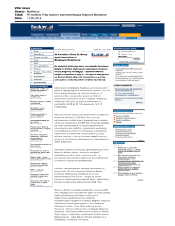 Villa Saska Gazeta: bankier.pl Tytu³: W kwietniu finisz budowy apartamentowca Belgravia Residence Data: 13.01.2011 Grupa -F Twoja Ecommerce.edu.pl PIT.pl VAT.pl Bankier.pl MamBiznes.pl OsobyPrawne.pl PRNews.pl lijirma.plBankier.pl Wy Wykop Blip Delicious Flaker Google RSS Drukuj ś Zamów przez SMS Wiadomości Kredyty Konta Inwestowanie Lokaty Karty Wiadomo ści Finanse Osobiste Emerytury Podatki Firma Ubezpieczenia LifeStyle Domowe finanse Źródło: BankierPress Praca Nieruchomości 2011-01-13 13:40 Książki Produkty Finansowe Rodzina na swoim Bankier Direct Wiadomo ść przez email Rynki g Dziennik b c d e f Gospodarka b Tygodnik c d e f g Finanse osobiste Firma W kwietniu finisz budowy apartamentowca Belgravia Residence Bankier.pl Firma Twój e-mail: Dalej ustawienia subskrypcji Świat Nowa gospodarka Na kwiecień bieżącego roku warszawski deweloper Polityka Belgravia Polska zaplanował zakończenie budowy Emitent - komunikaty ze spółek swojej flagowej inwestycji – apartamentowca Po godzinach na Saskiej Kepie. Obecnie prowadzone są prace Archiwum zawiązane z wykańczaniem wnętrza rezydencji. Belgravia Residence przy al. Jerzego Waszyngtona Gorące tematy Zima zaskoczy ła PKP. Kto za to odpowie? Jaki był rok 2010? Co nas czeka w 2011? W co warto teraz zainwestowa ć? Rząd majstruje przy emeryturach Co si ę dzieje ze strefą euro? Wyszukiwarka Najpopularniejsze Nadchodzi ostatni rok dobrej koniunktury 2011-01-12 06:02 FORUM BANKIER.PL Czteropiętrowa Belgravia Residence usytuowana jest w jednej z najpiękniejszych warszawskich dzielnic, vis a vis Parku Skaryszewskiego. W budynku mieści się 12 Cały świat pomoże strefie euro apartamentów o powierzchni prawie do 100 m2. 2011-01-12 08:00 Ekskluzywne mieszkania na III i IV piętrze znalazły już Wczoraj koszary, dzisiaj mieszkania nabywców. Dostępne są jeszcze apartamenty o 2011-01-12 06:01 Czy Ziobrę czeka Trybunał Stanu? Metr kwadratowy powierzchni apartamentu w Belgravia Residence kosztuje 13 800 PLN. Koszt miejsca 2011-01-13 07:30 Nie dałeś wszystkim podwyżki? Zapłacisz pracownikom odszkodowanie 2011-01-12 07:32 parkingowego w podziemnym, dwupoziomowym garażu na terenie rezydencji to 55 000 PLN. W garażu znajduje się winda samochodowa. W każdym apartamencie zamontowany jest videofon, indywidualna wentylacja oraz instalacja do montażu klimatyzacji. Apartamenty wykończone są drewnianą stolarką okienną. Części wspólne budynku – klatka schodowa, wykończone są Włoch piaskowiec. Deweloper i główny wykonawca apartamentowca, firma Belgravia Polska, oferuje nabywcom możliwość swobodnej aranżacji wnętrz apartamentów, np. Raport MAK: Za łoga nieprzygotowana do lotu przesuwania lub usunięcia wybranych ścian działowych 2011-01-12 10:25 czy montażu ogrzewania podłogowego. Rząd stracił miliard złotych oszcz ędności 2011-01-13 07:30 OFE w odstawkę 2011-01-12 13:00 Portugalia rozbudziła nadzieje inwestorów 2011-01-12 13:56 Klientom zainteresowanym zakupem apartamentu o większej niż 100 m2 powierzchni Belgravia Polska proponuje ekskluzywne mieszkania na terenie Narzędzia powi ązane Wyszukiwarka kont oszczędnościowych Porównywarka kredytów mieszkaniowych Porównywarka lokat więcej.. Najnowsze 13:50 Redan liczy, że wyniki finansowe za 2011 r. b ędą lepsze od ubieg łorocznych [ISB] 13:46 EBC pozostawi ł stopy proc. bez zmian, zgodnie z oczekiwaniami [ISB] 13:45 Europejski Bank Centralny nie zmienił poziomu stóp procentowych [Bankier.pl] 13:42 C&W wy łącznym agentem galerii Felicity w Lublinie [BankierPress] 13:40 W eurobanku tańszy kredyt z kontem [BankierPress] apartamentowca Villa Saska - drugiej ze swoich inwestycji zlokalizowanej na Saskiej Kępie. Zakończenie Emerytury z OFE b ędą niższe. O ile w ogóle będą Konta_osobiste Kredyty_mieszkaniowe Karty_kredytowe Lokaty 2011-01-13 2011-01-13 06:00 2011-01-12 06:00 Zamów online produkty finansowe: gresem, a na elewacji zamontowany jest sprowadzony z Co czeka złoto i srebro w 2011 roku? Prezydent nie pomo że pracującym emerytom więcej... Centrum Finansowe 2011-01-13 06:00 Fiskus ma a ż 6 lat na skontrolowanie twojego zeznania Ceny, czyli czy mieszkania b ędą tańsze? kondygnacji. Polską gospodarkę czeka ciężki rok 2011-01-12 08:22 W 2011 nieliczni kupi ą mieszkanie po ni ższej cenie powierzchni od 60 do 98 m2 usytuowane na I i II 2011-01-12 06:00 Prezydent wchodzi do gry o OFE Więcej pieniędzy na mieszkania mimo Rekomendacji T tej budowy planowane jest na koniec 2011 roku. 2011-01-13 07:00 Belgravia Polska rozpoczęła działalność w połowie 2007 roku. Przyjęta przez menedżment spółki strategia zakłada wąską specjalizację dewelopera wyłącznie w budownictwie apartamentowym. Znakiem rozpoznawczym wszystkich inwestycji Belgravii mają być niezmiennie bardzo wysoka jakość i funkcjonalność oferowanych lokali. Firma działa tylko na terenie Warszawy. Obecnie realizuje trzy inwestycje. Belgravia Residence i Villa Saska zlokalizowane zostały na Saskiej Kępie, jednej z najbardziej prestiżowych dzielnic stolicy. Najnowsza zaś – Casa del Arte Murano znajdzie się w Śródmieściu, na starym Muranowie. więcej.. rozpoznawczym wszystkich inwestycji Belgravii mają być niezmiennie bardzo wysoka jakość i funkcjonalność oferowanych lokali. Firma działa tylko na terenie Villa Saska Warszawy. Obecnie realizuje trzy inwestycje. Belgravia Gazeta: bankier.pl Residence i Villa Saska zlokalizowane zostały na Saskiej Tytu³: W kwietniu finisz budowy apartamentowca Belgravia Residence Kępie, jednej z najbardziej prestiżowych dzielnic stolicy. Najnowsza zaś – Casa del Arte Murano znajdzie się w Data: 13.01.2011 Śródmieściu, na starym Muranowie. Więcej na: www.belgravia.com.pl Media Evolutions Sp. z o.o. Like Komentarze do artykułu Dodaj komentarz Mapa serwisu | Reklama | Produkty finansowe | Oferta B2B | Centrum prasowe | Relacje inwestorskie | Kontakt | Praca | © 1999-2011 Bankier