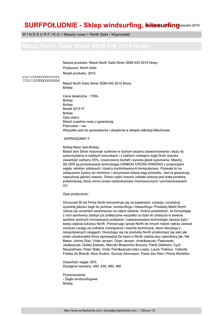 środa, 13 kwiecień 2016 SURFPOŁUDNIE - Sklep windsurfing, Utworzono: kitesurfing W I N D S U R F I N G > Maszty nowe > North Sails / Wyprzedaż Maszt North Sails Silver SDM 430 2015 Nowy Nazwa produktu: Maszt North Sails Silver SDM 430 2015 Nowy Producent: North Sails Model produktu: 2015 Maszt North Sails Silver SDM 430 2015 Nowy Cena detaliczna : 1789, Model 2015 !!! Opis stanu: Maszt zupełnie nowy z gwarancją. Pokrowiec - nie Wszystko jest do sprawdzenia i obejżenia w sklepie w Miechowie. ZAPRASZAMY !! Nasz opis: Maszt serii Silver imponuje surferow w rożnym stopniu zaawansowania i służy do wykorzystania w każdych warunkach i z każdym rodzajem żagli.Dość wysoka zawartość carbonu 55%, nowoczesny kształt i wysoka jakoś wykonania. Maszty SILVER są produkowane technologią CARBON CROSS WINDING z proporcjami węgla, włokien szklanych i żywicy kontrolowanymi komputerowo. Pozwala to na odsączenie żywicy do minimum i utrzymania niskiej wagi produktu. Jest to gwarancją najwyższej jakości masztu. Dolna część masztu została pokryta jest białą powłoką poliamidową, ktora chroni przed uszkodzeniami mechanicznymi i promieniowaniem UV. Opis producenta : Od ponad 50 lat Firma North koncentruje się na badaniach, rozwoju i produkcji wysokiej jakości żagli do jachtow, windsurfingu i kitesurfingu. Produkty Marki North cieszą się uznaniem sportowcow na całym świecie, można powiedzieć, że korzystając z nich sportowcy zdobyli już praktycznie wszystko co było do zdobycia w świecie sportow wodnych.Innowacyjne podejście i zaawansowane technologie zawsze były i będą częścią sukcesu North .Porownując sprzęt North do innych marek należy zawsze zwracać uwagę na unikalne rozwiązania i nowinki techniczne, ktore decydują o niespotykanych osiągach. Decydując się na produkty North przekonasz się sam jak wiele udoskonaleń firma wprowadza.Do team-u North należą tacy zawodnicy jak: Nik Baker, Jimmy Diaz, Vidar Jensen, Orjan Jensen, André Paskowski, José Gollito Estredo, Marcilio Brawzinho Browne, Patrik Diethelm, Cyril Moussilmani, Peter Slate, Victor Fernández Lopez, Laure Treboux, Yolanda Freites de Brendt, Alice Arutkin, Gunnar Asmussen, Paulo dos Reis i Pierre Mortefon. Zawartość węgla: 55% Dostępne rozmiary: 400, 430, 460, 490 Przeznaczenie: - Żagle windsurfingowe http://www.surfpoludnie.com | [email protected] | | Strona 1/3 środa, 13 kwiecień 2016 SURFPOŁUDNIE - Sklep windsurfing, Utworzono: kitesurfing W I N D S U R F I N G > Maszty nowe > North Sails / Wyprzedaż Maszt North Sails Silver SDM 430 2015 Nowy Strona producenta - kliknij Video-Testy - kliknij Katalog producenta - kliknij Tabela rozmiarow: Długość: IMCS: Zakres żagli: Waga(kg) Carbon: 400 19 3,7 - 5,7m2 2,1kg 55% 430 21 5,0 - 6,9m2 2,2kg 55% 460 25 5,4 - 8,4m2(9,5) 2,4kg 55% 490 28 8,0 - 9,0m2 2,55kg 55% Informacja handlowa :Handlujemy towarem jaki mamy na magazynie i jest dostępny od ręki. Ale ogłaszamy się na rożnych portalach w kraju i za granicą oraz sprzedajemy w sklepie w Miechowie . Czasem może się zdażyć, że coś się sprzeda w innym miejscu i nie zdążymy usunąć oferty.Z gory przepraszamy . http://www.surfpoludnie.com | [email protected] | | Strona 2/3 środa, 13 kwiecień 2016 SURFPOŁUDNIE - Sklep windsurfing, Utworzono: kitesurfing W I N D S U R F I N G > Maszty nowe > North Sails / Wyprzedaż Maszt North Sails Silver SDM 430 2015 Nowy Zawarte w opisach informacje i opisy pochodzą z materiałow opublikowanych przez producenta i ustalonuch przez nas. Dołożyliśmy wszelkich starań, aby informacje te były aktualne i prawdziwe . Zastrzegamy sobie jednak prawo do pomyłek i ewentualnych błędow, oraz odstąpienia od umowy z ważnych powodow ekonomicznych. Cena: 1789.00zł Cena promocyjna: 999.00zł Dostępność: Ten produkt został dodany do sklepu w dniu czwartek, 07 kwiecień 2016 http://www.surfpoludnie.com | [email protected] | | Strona 3/3