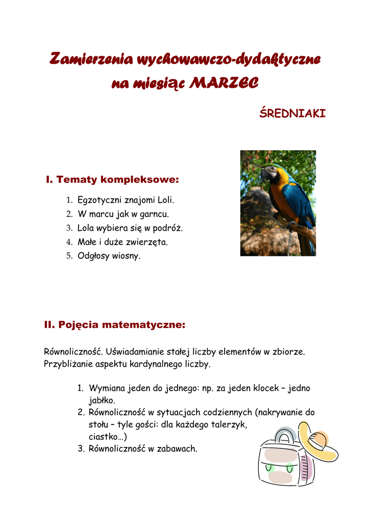 Zamierzenia wychowawczo-dydaktyczne na miesiąc MARZEC ŚREDNIAKI I. Tematy kompleksowe: 1. Egzotyczni znajomi Loli. 2. W marcu jak w garncu. 3. Lola wybiera się w podróż. 4. Małe i duże zwierzęta. 5. Odgłosy wiosny. II. Pojęcia matematyczne: Równoliczność. Uświadamianie stałej liczby elementów w zbiorze. Przybliżanie aspektu kardynalnego liczby. 1. Wymiana jeden do jednego: np. za jeden klocek – jedno jabłko. 2. Równoliczność w sytuacjach codziennych (nakrywanie do stołu – tyle gości: dla każdego talerzyk, ciastko…) 3. Równoliczność w zabawach. III. Piosenka: Była sobie żabka mała 1. Była sobie żabka mała. RE-RE, KUM-KUM, RE-RE, KUM-KUM, która mamy nie słuchała. RE-RE, KUM-KUM, bęc. 2. Na spacery wychodziła RE-RE, KUM-KUM, RE-RE, KUM-KUM, innym żabkom się dziwiła RE-RE, KUM-KUM, bęc. 3. A na brzegu stare żaby RE-RE, KUM-KUM, RE-RE, KUM-KUM, tańcowały jak te baby RE-RE, KUM-KUM, bęc. 4. Jedna drugiej w ucho kwacze RE-RE, KUM-KUM, RE-RE, KUM-KUM, jak ta mała pięknie skacze RE-RE, KUM-KUM, bęc. 5. Zjadła żabka 7 muszek RE-RE, KUM-KUM, RE-RE, KUM-KUM, i na trawie kładzie brzuszek RE-RE, KUM-KUM, bęc. 6. Przyszedł bocian niespodzianie RE-RE, KUM-KUM, RE-RE, KUM-KUM, połkną żabkę na śniadanie RE-RE, KUM-KUM, bęc. 7. Teraz wszystkie żabki płaczą RE-RE, KUM-KUM, RE-RE, KUM-KUM, że jej więcej nie zobaczą RE-RE, KUM-KUM, bęc. 8. Tej piosenki morał znamy RE-RE, KUM-KUM, RE - RE, KUM-KUM trzeba zawsze słuchać mamy RE-RE, KUM-KUM, bęc. IV. Wiersz: Marzec Miesiąc marzec tak się maże jak niegrzeczne dzieci. To kroplami deszczu kapie to znów słońcem świeci. Wiatr swawolnik, czasem jeszcze garścią śniegu rzuci, ale wszyscy dobrze wiedzą, że zima nie wróci!