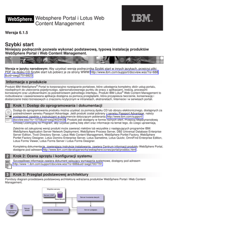 WebSphere Websphere Portal i Lotus Web Content Management ® Wersja 6.1.5 Szybki start Niniejszy podręcznik pozwala wykonać podstawową, typową instalację produktów WebSphere Portal i Web Content Management. Wersja w języku narodowym: Aby uzyskać wersję podręcznika Szybki start w innych językach, przejrzyj pliki PDF na dysku CD Szybki start lub pobierz je ze strony WWW http://www.ibm.com/support/docview.wss?rs=688 &uid=swg27016823. Informacje o produkcie Produkt IBM WebSphere® Portal to korporacyjne rozwiązanie portalowe, które udostępnia kompletny zbiór usług portalu, niezbędnych do utworzenia pojedynczego, spersonalizowanego punktu do pracy z aplikacjami, treścią, procesami biznesowymi oraz użytkownikami za pośrednictwem jednolitego interfejsu. Produkt IBM Lotus® Web Content Management to rozbudowana i zaawansowana aplikacja dostępna za pomocą przeglądarki, która przyspiesza tworzenie, konserwację i dostarczanie treści biznesowych o znaczeniu krytycznym w intranetach, ekstranetach, Internecie i w serwisach portali. 1 Krok 1: Dostęp do oprogramowania i dokumentacji Dostęp do oprogramowania produktu można uzyskać za pomocą dysku CD lub obrazu elektronicznego, dostępnych za pośrednictwem serwisu Passport Advantage. Jeśli produkt został pobrany z serwisu Passport Advantage, należy postępować zgodnie z instrukcjami w dokumencie dotyczącym pobierania: http://www.ibm.com/support/ docview.wss?rs=1070&uid=swg24024438. Produkt jest dostępny w formie różnych ofert. Przejrzyj Międzynarodową Umowę Licencyjną na Program, aby uzyskać pełną listę ofert oraz informacje na temat tego, do czego uprawniają. Zależnie od zakupionej wersji produkt może zawierać niektóre lub wszystkie z następujących programów IBM: WebSphere Application Server Network Deployment, WebSphere Process Server, DB2 Universal Database Enterprise Server Edition, Tivoli Directory Server, Lotus Web Content Management, WebSphere Portlet Factory, WebSphere Portlet Factory Designer, Lotus Domino Enterprise Server, Lotus Sametime, Lotus Quickr, OmniFind Enterprise Edition, Lotus Forms Viewer, Lotus Forms Server i Lotus Forms Designer. Kompletną dokumentację, zawierającą instrukcje instalowania, zawiera Centrum informacji produktu WebSphere Portal, dostępne pod adresem http://www.ibm.com/developerworks/websphere/zones/portal/proddoc.html . 2 Krok 2: Ocena sprzętu i konfiguracji systemu Szczegółowe informacje zawiera dokument opisujący wymagania systemowe, dostępny pod adresem http://www-1.ibm.com/support/docview.wss?rs=688&uid=swg27007791 3 Krok 3: Przegląd podstawowej architektury Poniższy diagram przedstawia podstawową architekturę wdrażania produktów WebSphere Portal i Web Content Management. 4 Krok 4: Instalowanie produktów WebSphere Portal i Web Content Management Scenariusz szybkiej instalacji: scenariusz szybkiej instalacji zawiera instrukcje krok po kroku, umożliwiające szybkie zainstalowanie podstawowej instancji produktów WebSphere Portal i Web Content Management. 1. Aby uruchomić program instalacyjny, wybierz jedną z poniższych opcji: Użyj odpowiedniego dysku instalacyjnego dla danego systemu operacyjnego. v i5/OS: Włóż dysk instalacyjny do napędu i uruchom plik install400.bat w katalogu głównym w systemie Windows lub uruchom plik install.sh w katalogu głównym w sesji QSH konsoli i5/OS. v UNIX: Włóż dysk instalacyjny do napędu i uruchom komendę ./install.sh w katalogu głównym dysku CD. v Windows: Włóż dysk instalacyjny do napędu CD-ROM i uruchom komendę install.bat w katalogu głównym dysku CD. lub Użyj odpowiedniego, pobranego kodu produktu dla danego systemu operacyjnego. v i5/OS: Uruchom plik install400.bat w katalogu głównym dysku instalacyjnego w systemie Windows lub plik install.sh w katalogu głównym pobranego produktu w sesji QSH konsoli i5/OS. v UNIX: Uruchom komendę ./install.sh w katalogu głównym pobranego produktu. v Windows: Uruchom komendę install.bat w katalogu głównym pobranego produktu. 2. Postępuj zgodnie z instrukcjami w panelach instalacji. 3. Aby sprawdzić, czy produkt WebSphere Portal jest uruchomiony, wpisz w przeglądarce następujący adres URL: http://firma.com:numer_portu/wps/portal, gdzie firma.com to pełna nazwa hosta komputera, na którym działa produkt WebSphere Portal, a numer_portu to numer portu wyświetlony w panelu potwierdzenia. Na przykład: http://www.ibm.com:10040/wps/portal. Aby sprawdzić, czy produkt Web Content Management działa, uruchom portal i kliknij opcję Aplikacje > Treść. 4. Zainstaluj teraz wszystkie wymagane poprawki produktu WebSphere Application Server. Informacje na temat poprawek, które powinny zostać zastosowane, zawiera sekcja poświęcona obsługiwanemu sprzętowi i oprogramowaniu. Więcej informacji ? Więcej informacji zawierają następujące zasoby: v Strona WebSphere Portal Zone: http://www.ibm.com/developerworks/websphere/zones/portal/ v Strona Web Content Management Zone: http://www.ibm.com/developerworks/lotus/products/ webcontentmanagement/ v Centrum informacyjne produktu Web Content Management: http://publib.boulder.ibm.com/infocenter/wcmdoc/v6r1 v Centrum informacyjne produktu WebSphere Portal: http://publib.boulder.ibm.com/infocenter/wpdoc/v6r1 v Strona IBM Accelerators: http://www.ibm.com/software/lotus/portal/value/ v Serwis IBM Redbooks: http://www.redbooks.ibm.com/ v Strona WebSphere Portal Support: http://www.ibm.com/software/genservers/portal/support/ IBM WebSphere Portal, wersja 6.1.5. Materiały licencjonowane - własność IBM. © Copyright IBM Corp. 2000, 2009. Wszelkie prawa zastrzeżone. Użytkowników z instytucji rządowych USA obowiązują warunki umowy GSA ADP Schedule Contract z IBM Corp. IBM, WebSphere, Lotus, OmniFind, Sametime, Quickr, DB2, Tivoli, i5/OS oraz iSeries są znakami towarowymi lub zastrzeżonymi znakami towarowymi International Business Machines w Stanach Zjednoczonych i/lub w innych krajach. Windows jes